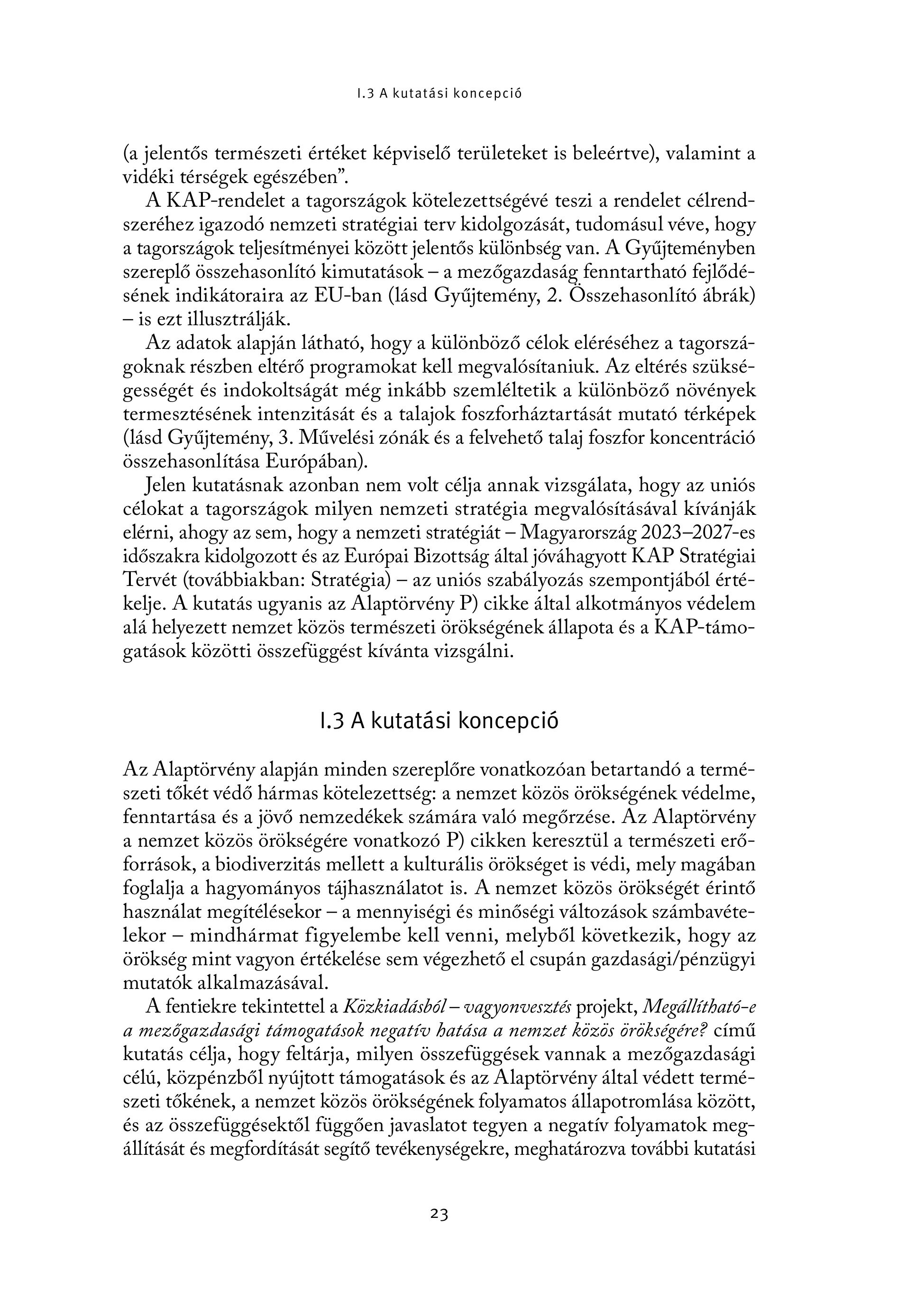1.3 A kutatási koncepció (a jelentős természeti értéket képviselő területeket is beleértve), valamint a vidéki térségek egészében". A KAP-rendelet a tagországok kötelezettségévé teszi a rendelet célrendszeréhez igazodó nemzeti stratégiai terv kidolgozását, tudomásul véve, hogy a tagországok teljesítményei között jelentős különbség van. A Gyűjteményben szereplő összehasonlító kimutatások — a mezőgazdaság fenntartható fejlődésének indikátoraira az EU-ban (lásd Gyűjtemény, 2. Összehasonlító ábrák) — is ezt illusztrálják. Az adatok alapján látható, hogy a különböző célok eléréséhez a tagországoknak részben eltérő programokat kell megvalósítaniuk. Az eltérés szükségességét és indokoltságát még inkább szemléltetik a különböző növények termesztésének intenzitását és a talajok foszforháztartását mutató térképek (lásd Gyűjtemény, 3. Művelési zónák és a felvehető talaj foszfor koncentráció összehasonlítása Európában). Jelen kutatásnak azonban nem volt célja annak vizsgálata, hogy az uniós célokat a tagországok milyen nemzeti stratégia megvalósításával kívánják elérni, ahogy az sem, hogy a nemzeti stratégiát — Magyarország 2023—2027-es időszakra kidolgozott és az Európai Bizottság által jóváhagyott KAP Stratégiai Tervét (továbbiakban: Stratégia) — az uniós szabályozás szempontjából értékelje. A kutatás ugyanis az Alaptörvény P) cikke által alkotmányos védelem alá helyezett nemzet közös természeti örökségének állapota és a KAP-támogatások közötti összefüggést kívánta vizsgálni. 1.3 A kutatási koncepció Az Alaptörvény alapján minden szereplőre vonatkozóan betartandó a természeti tőkét védő hármas kötelezettség: a nemzet közös örökségének védelme, fenntartása és a jövő nemzedékek számára való megőrzése. Az Alaptörvény a nemzet közös örökségére vonatkozó P) cikken keresztül a természeti erőforrások, a biodiverzitás mellett a kulturális örökséget is védi, mely magában foglalja a hagyományos tájhasználatot is. A nemzet közös örökségét érintő használat megítélésekor — a mennyiségi és minőségi változások számbavételekor — mindhármat figyelembe kell venni, melyből következik, hogy az örökség mint vagyon értékelése sem végezhető el csupán gazdasági/pénzügyi mutatók alkalmazásával. A fentiekre tekintettel a Közkiadásból — vagyonvesztés projekt, Megállítható-e a mezőgazdasági támogatások negatív hatása a nemzet közös örökségére? című kutatás célja, hogy feltárja, milyen összefüggések vannak a mezőgazdasági célú, közpénzből nyújtott támogatások és az Alaptörvény által védett természeti tőkének, a nemzet közös örökségének folyamatos állapotromlása között, és az összefüggésektől függően javaslatot tegyen a negatív folyamatok megállítását és megfordítását segítő tevékenységekre, meghatározva további kutatási 23