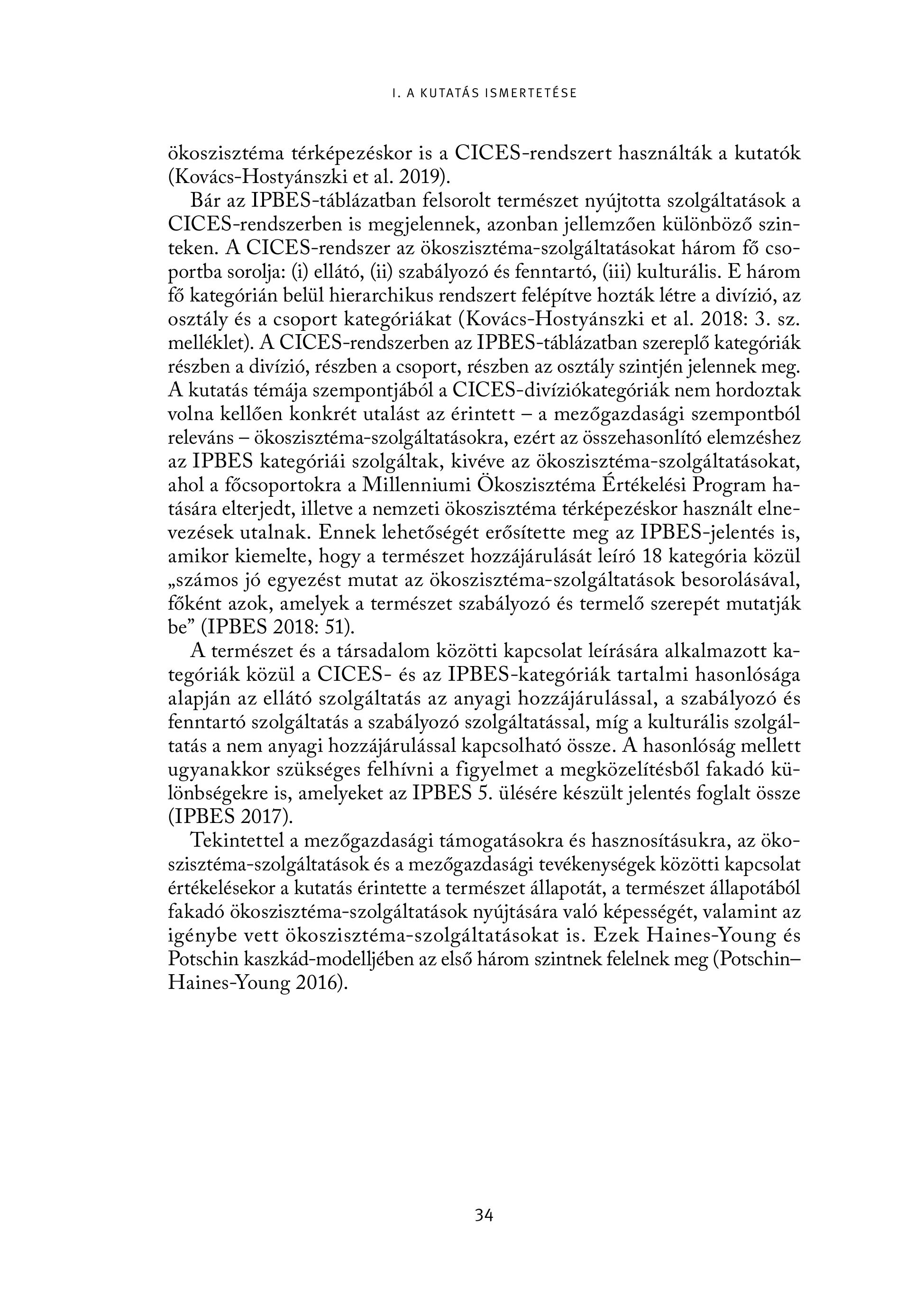 I. A KUTATÁS ISMERTETÉSE ökoszisztéma térképezéskor is a CICES-rendszert használták a kutatók (Kovács-Hostyánszki et al. 2019). Bár az IPBES-táblázatban felsorolt természet nyújtotta szolgáltatások a CICES-rendszerben is megjelennek, azonban jellemzően különböző szinteken. A CICES-rendszer az ökoszisztéma-szolgáltatásokat három fő csoportba sorolja: (i) ellátó, (ii) szabályozó és fenntartó, (iii) kulturális. E három fő kategórián belül hierarchikus rendszert felépítve hozták létre a divízió, az osztály és a csoport kategóriákat (Kovács-Hostyánszki et al. 2018: 3. sz. melléklet). A CICES-rendszerben az IPBES-táblázatban szereplő kategóriák részben a divízió, részben a csoport, részben az osztály szintjén jelennek meg. A kutatás témája szempontjából a CICES-divíziókategóriák nem hordoztak volna kellően konkrét utalást az érintett — a mezőgazdasági szempontból releváns — ökoszisztéma-szolgáltatásokra, ezért az összehasonlító elemzéshez az IPBES kategóriái szolgáltak, kivéve az ökoszisztéma-szolgáltatásokat, ahol a főcsoportokra a Millenniumi Ökoszisztéma Értékelési Program hatására elterjedt, illetve a nemzeti ökoszisztéma térképezéskor használt elnevezések utalnak. Ennek lehetőségét erősítette meg az IPBES-jelentés is, amikor kiemelte, hogy a természet hozzájárulását leíró 18 kategória közül , Számos jó egyezést mutat az ökoszisztéma-szolgáltatások besorolásával, főként azok, amelyek a természet szabályozó és termelő szerepét mutatják be" (IPBES 2018: 51). A természet és a társadalom közötti kapcsolat leírására alkalmazott kategóriák közül a CICES- és az IPBES-kategóriák tartalmi hasonlósága alapján az ellátó szolgáltatás az anyagi hozzájárulással, a szabályozó és fenntartó szolgáltatás a szabályozó szolgáltatással, míg a kulturális szolgáltatás a nem anyagi hozzájárulással kapcsolható össze. A hasonlóság mellett ugyanakkor szükséges felhívni a figyelmet a megközelítésből fakadó különbségekre is, amelyeket az IPBES 5. ülésére készült jelentés foglalt össze (IPBES 2017). Tekintettel a mezőgazdasági támogatásokra és hasznosításukra, az ökoszisztéma-szolgáltatások és a mezőgazdasági tevékenységek közötti kapcsolat értékelésekor a kutatás érintette a természet állapotát, a természet állapotából fakadó ökoszisztéma-szolgáltatások nyújtására való képességét, valamint az igénybe vett ökoszisztéma-szolgáltatásokat is. Ezek Haines-Young és Potschin kaszkäd-modelljeben az elsö härom szintnek felelnek meg (PotschinHaines-Young 2016). 34
