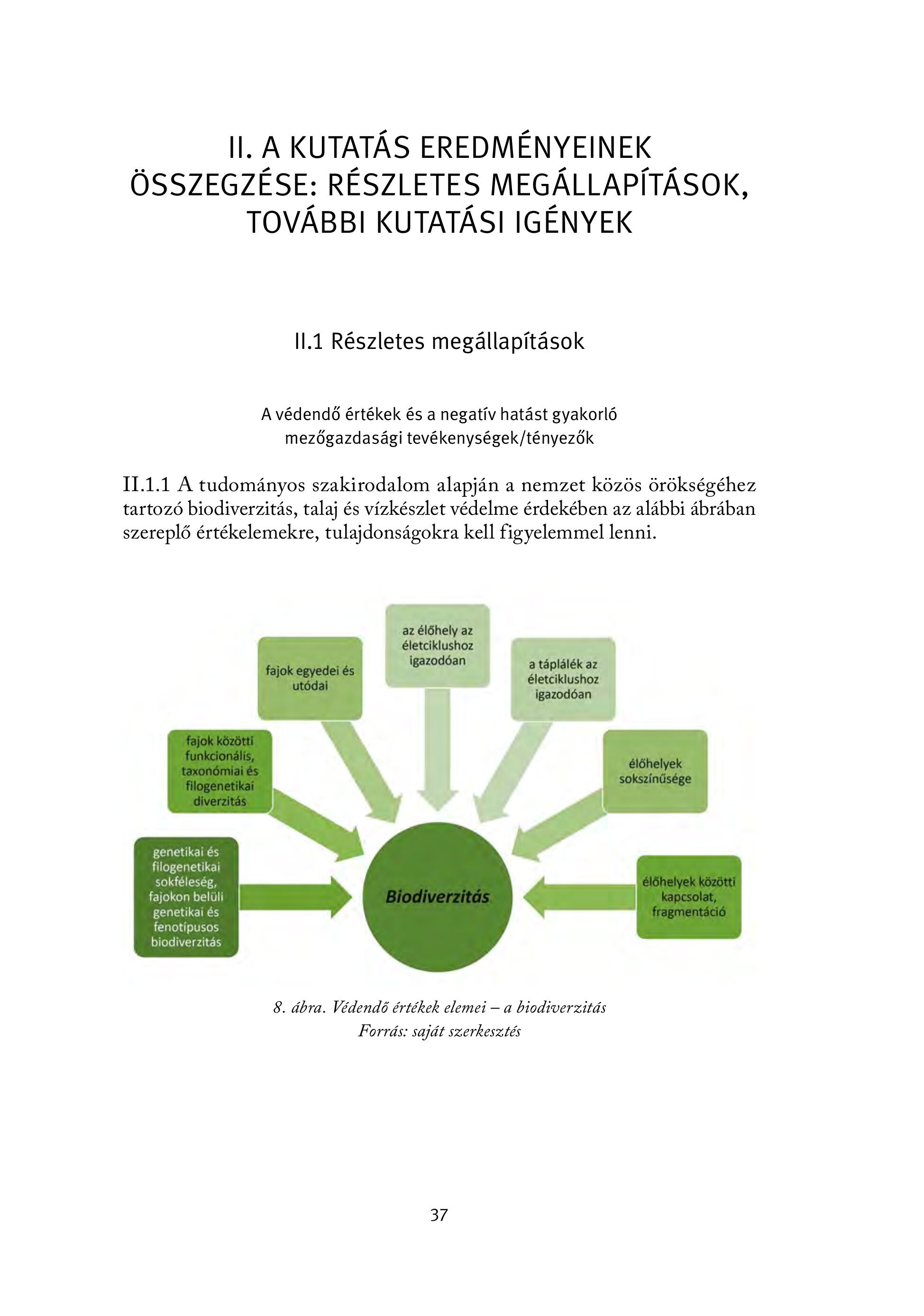 II. A KUTATÁS EREDMÉNYEINEK ÖSSZEGZÉSE: RÉSZLETES MEGÁLLAPÍTÁSOK, TOVÁBBI KUTATÁSI IGÉNYEK II.1 Részletes megállapítások A védendő értékek és a negatív hatást gyakorló mezőgazdasági tevékenységek/tényezők II.1.1 A tudományos szakirodalom alapján a nemzet közös örökségéhez tartozó biodiverzitás, talaj és vízkészlet védelme érdekében az alábbi ábrában szereplő értékelemekre, tulajdonságokra kell figyelemmel lenni. ( atápálékaz | . életciklushoz. 8. ábra. Védendő értékek elemei — a biodiverzitás Forrás: saját szerkesztés 37