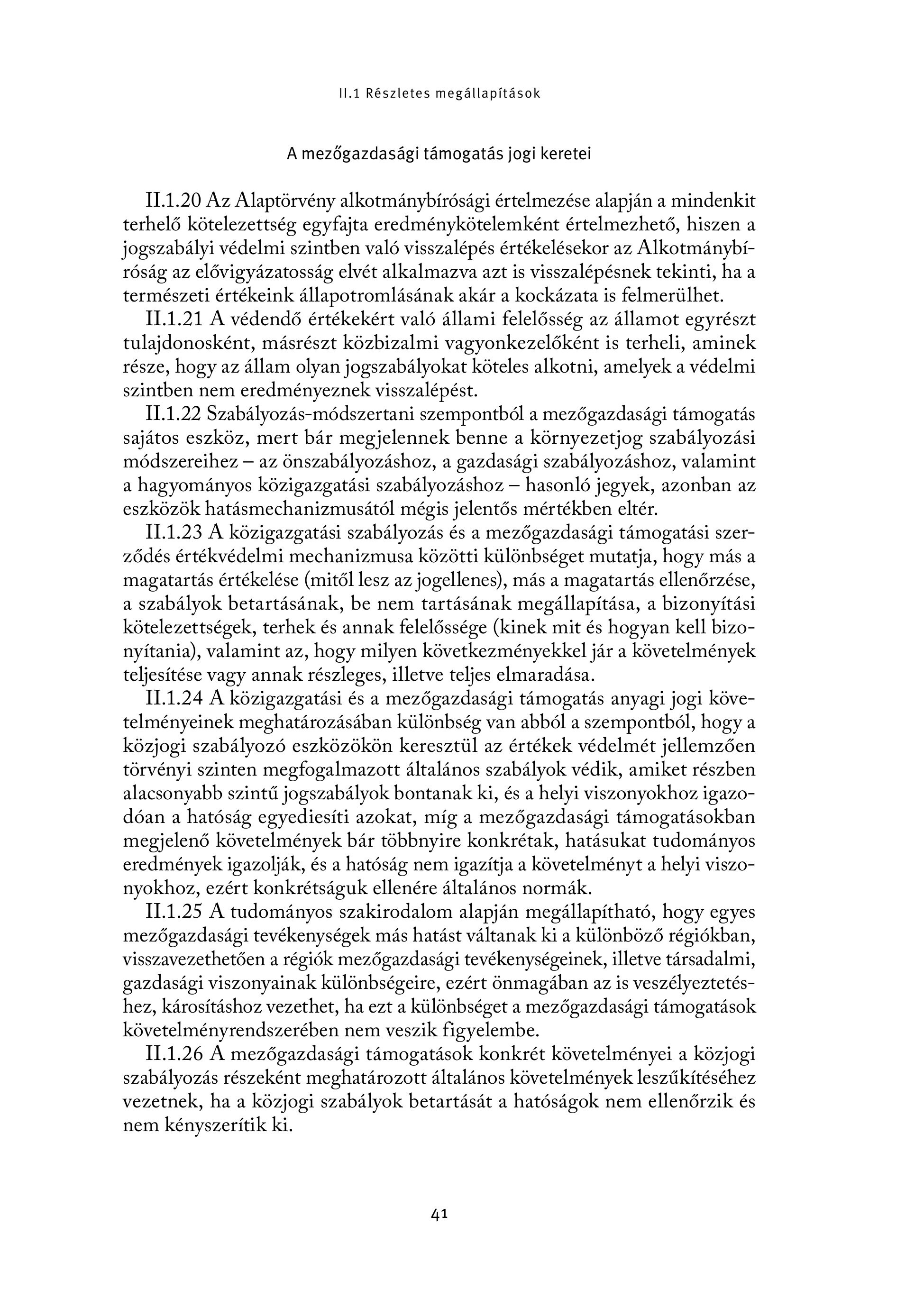 II.1 Részletes megállapítások A mezőgazdasági támogatás jogi keretei II.1.20 Az Alaptörvény alkotmánybírósági értelmezése alapján a mindenkit terhelő kötelezettség egyfajta eredménykötelemként értelmezhető, hiszen a jogszabályi védelmi szintben való visszalépés értékelésekor az Alkotmánybíróság az elővigyázatosság elvét alkalmazva azt is visszalépésnek tekinti, ha a természeti értékeink állapotromlásának akár a kockázata is felmerülhet. II.1.21 A védendő értékekért való állami felelősség az államot egyrészt tulajdonosként, másrészt közbizalmi vagyonkezelőként is terheli, aminek része, hogy az állam olyan jogszabályokat köteles alkotni, amelyek a védelmi szintben nem eredményeznek visszalépést. II.1.22 Szabályozás-módszertani szempontból a mezőgazdasági támogatás sajátos eszköz, mert bár megjelennek benne a környezetjog szabályozási módszereihez — az önszabályozáshoz, a gazdasági szabályozáshoz, valamint a hagyományos közigazgatási szabályozáshoz — hasonló jegyek, azonban az eszközök hatásmechanizmusától mégis jelentős mértékben eltér. II.1.23 A közigazgatási szabályozás és a mezőgazdasági támogatási szerződés értékvédelmi mechanizmusa közötti különbséget mutatja, hogy más a magatartás értékelése (mitől lesz az jogellenes), más a magatartás ellenőrzése, a szabályok betartásának, be nem tartásának megállapítása, a bizonyítási kötelezettségek, terhek és annak felelőssége (kinek mit és hogyan kell bizonyítania), valamint az, hogy milyen következményekkel jár a követelmények teljesítése vagy annak részleges, illetve teljes elmaradása. II.1.24 A közigazgatási és a mezőgazdasági támogatás anyagi jogi követelményeinek meghatározásában különbség van abból a szempontból, hogy a közjogi szabályozó eszközökön keresztül az értékek védelmét jellemzően törvényi szinten megfogalmazott általános szabályok védik, amiket részben alacsonyabb szintű jogszabályok bontanak ki, és a helyi viszonyokhoz igazodóan a hatóság egyediesíti azokat, míg a mezőgazdasági támogatásokban megjelenő követelmények bár többnyire konkrétak, hatásukat tudományos eredmények igazolják, és a hatóság nem igazítja a követelményt a helyi viszonyokhoz, ezért konkrétságuk ellenére általános normák. II.1.25 A tudományos szakirodalom alapján megállapítható, hogy egyes mezőgazdasági tevékenységek más hatást váltanak ki a különböző régiókban, visszavezethetően a régiók mezőgazdasági tevékenységeinek, illetve társadalmi, gazdasági viszonyainak különbségeire, ezért önmagában az is veszélyeztetéshez, károsításhoz vezethet, ha ezt a különbséget a mezőgazdasági támogatások követelményrendszerében nem veszik figyelembe. II.1.26 A mezőgazdasági támogatások konkrét követelményei a közjogi szabályozás részeként meghatározott általános követelmények leszűkítéséhez vezetnek, ha a közjogi szabályok betartását a hatóságok nem ellenőrzik és nem kényszerítik ki. 41