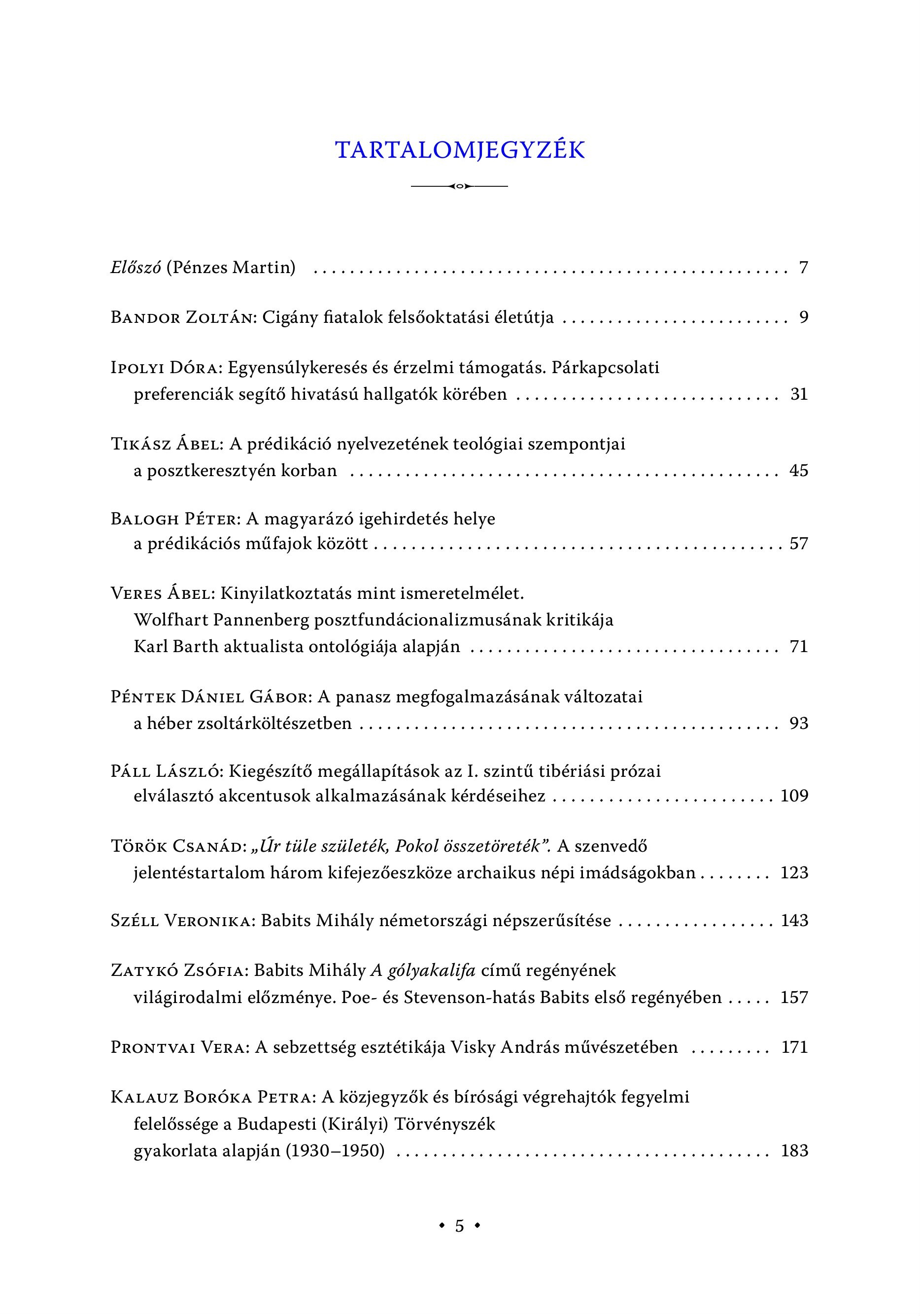 TARTALOMJEGYZÉK —— 0 Elöszö (Penzes Martin) ...............,..,..........................,...... 7 BANDOR ZOLTÁN: Cigány fiatalok felsőoktatási életútja . ........................ 9 IPoLYI DÓRA: Egyensúlykeresés és érzelmi támogatás. Párkapcsolati preferenciák segítő hivatású hallgatók körében ............................. 31 TIKÁSZ ÁBEL: A prédikáció nyelvezetének teológiai szempontjai a posztkeresztyén korban ...........................................,... 45 BALOGH PÉTER: A magyarázó igehirdetés helye a prédikäciés müfajok kôzôtt ..................................,,......., 57 VERES ÁBEL: Kinyilatkoztatás mint ismeretelmélet. Wolfhart Pannenberg posztfundäcionalizmusänak kritikäja Karl Barth aktualista ontolôgiäja alapjän .................................. 71 PÉNTEK DÁNIEL GÁBOR: A panasz megfogalmazásának változatai a héber zsoltärkültészethen .............................................. 93 PÁLL LÁSZLÓ: Kiegészítő megállapítások az I. szintű tibériási prózai elválasztó akcentusok alkalmazásának kérdéseihez ........................ 109 TÖRÖK Csanäp: „Ur tüle születek, Pokol összetöretek”. A szenvedö jelentestartalom härom kifejezöeszköze archaikus nepi imädsägokban........ 123 SZELL VERONIKA: Babits Mihály németországi népszerűsítése ................. 143 ZATYKÓ ZSÓFIA: Babits Mihály A gólyakalifa című regényének világirodalmi előzménye. Poe- és Stevenson-hatás Babits első regényében . . . . . 157 PRONTVAI VERA: A sebzettség esztétikaja Visky Andras mtivészetében ......... 171 KALAUZ BORÓKA PETRA: A közjegyzők és bírósági végrehajtók fegyelmi felelőssége a Budapesti (Királyi) Törvényszék gyakorlata alapjän (1930-1950) ................................,........ 183