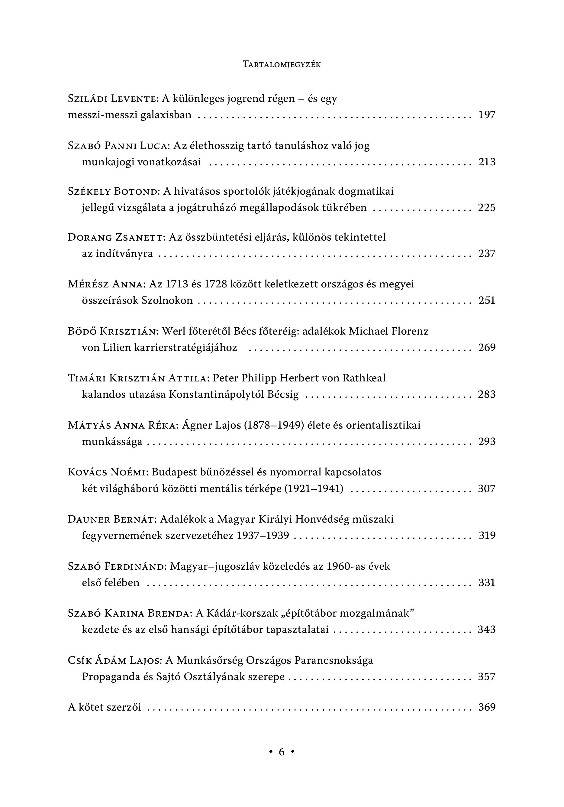 TARTALOMJEGYZÉK SZILÁDI LEVENTE: A különleges jogrend régen — és egy messzi-messzi galaxisban ...........................................,...., SZABO PANNI Luca: Az élethosszig tarté tanuldshoz valé jog munkajogi vonatkozäsai ..........................................,.... SZÉKELY BOTOND: A hivatásos sportolók játékjogának dogmatikai jellegű vizsgálata a jogátruházó megállapodások tükrében . ....... . . . . . . . . . . DORANG ZSANETT: Az összbüntetési eljárás, különös tekintettel AZ inditvanyra .. 1. ec ee ee ee eee eee eee ee eee enn ees MÉRÉSZ ANNA: Az 1713 és 1728 között keletkezett országos és megyei ôsszeiräsok Szolnokon ................................................. BöpŐ KRISZTIÁN: Werl főterétől Bécs főteréig: adalékok Michael Florenz von Lilien karrierstratégiajahoz .....................,..........,........ TIMÁRI KRISZTIÁN ATTILA: Peter Philipp Herbert von Rathkeal kalandos utazäsa Konstantinäpolytél Bécsig .............................. MÁTYÁS ANNA RÉKA: Ágner Lajos (1878—1949) élete és orientalisztikai munkässäâga ...................................,,,..,,....444444. Kovács NOÉMI: Budapest bűnözéssel és nyomorral kapcsolatos két világháború közötti mentális térképe (1921—1941) ...................... DAUNER BERNÁT: Adalékok a Magyar Királyi Honvédség műszaki fegyvernemének szervezetéhez 1937-1939 ................................ SZABÓ FERDINÁND: Magyar-jugoszláv közeledés az 1960-as évek elsé felében ........................................,...........,..... SZABÓ KARINA BRENDA: A Kádár-korszak , építőtábor mozgalmának" kezdete és az első hansági építőtábor tapasztalatai . . . ...................... Csík ÁDÁM Lajos: A Munkásőrség Országos Parancsnoksága Propaganda és Sajté Osztälyänak szerepe ................................. A kötet szerzÖi ...............................................4444440.