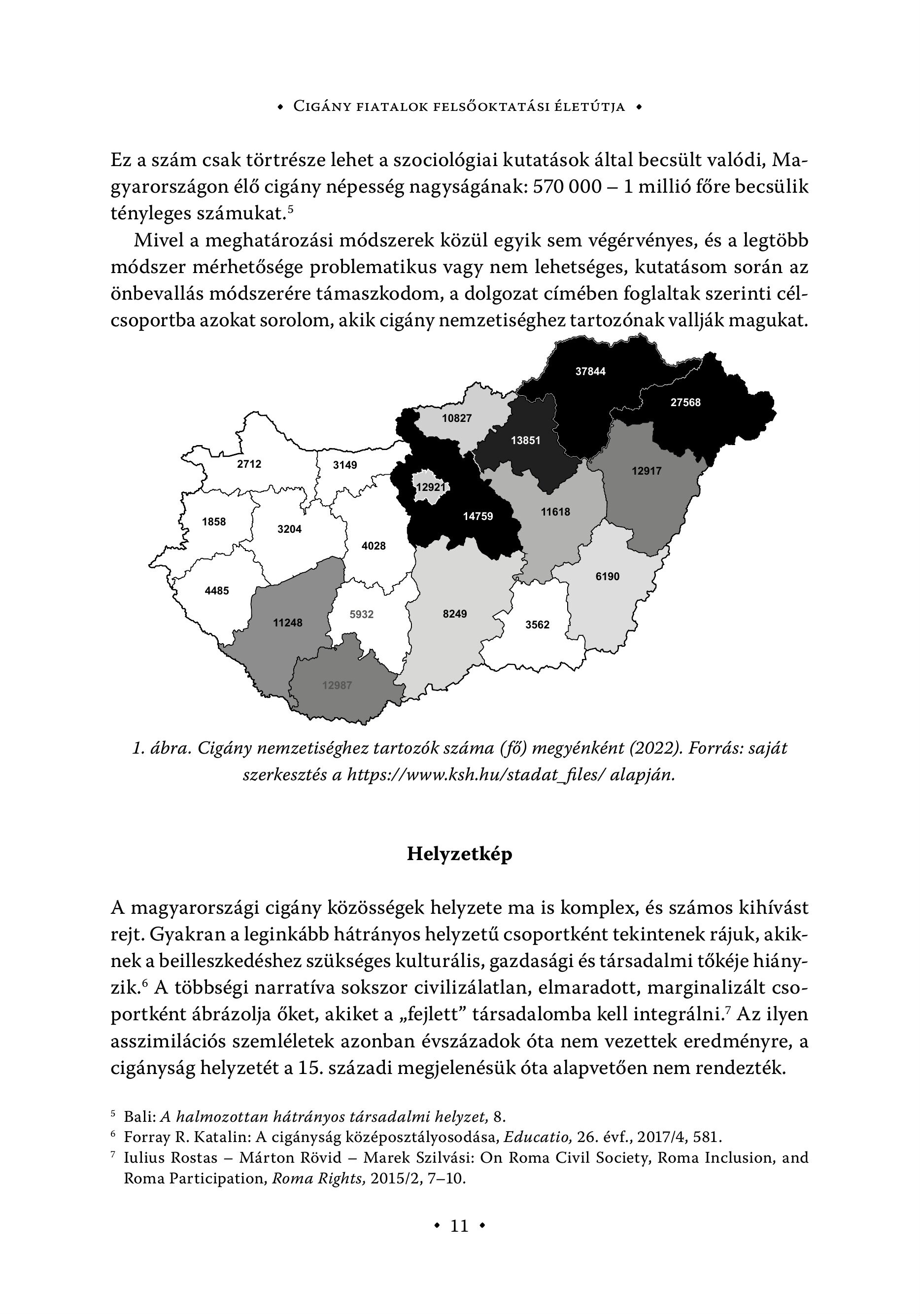 s CIGÁNY FIATALOK FELSŐOKTATÁSI ÉLETÚTJA + Ez a szám csak törtrésze lehet a szociológiai kutatások által becsült valódi, Magyarországon élő cigány népesség nagyságának: 570 000 - 1 millió főre becsülik tényleges számukat." Mivel a meghatározási módszerek közül egyik sem végérvényes, és a legtöbb módszer mérhetősége problematikus vagy nem lehetséges, kutatásom során az önbevallás módszerére támaszkodom, a dolgozat címében foglaltak szerinti célcsoportba azokat sorolom, akik cigány nemzetiséghez tartozónak vallják magukat. 1. ábra. Cigány nemzetiséghez tartozók száma (fő) megyénként (2022). Forrás: saját szerkesztés a https://www.ksh.hu/stadat_files/ alapjan. Helyzetkép A magyarországi cigány közösségek helyzete ma is komplex, és számos kihívást rejt. Gyakran a leginkább hátrányos helyzetű csoportként tekintenek rájuk, akiknek a beilleszkedéshez szükséges kulturális, gazdasági és társadalmi tőkéje hiányzik." A többségi narratíva sokszor civilizálatlan, elmaradott, marginalizált csoportként ábrázolja őket, akiket a , fejlett" társadalomba kell integrálni." Az ilyen asszimilációs szemléletek azonban évszázadok óta nem vezettek eredményre, a cigányság helyzetét a 15. századi megjelenésük óta alapvetően nem rendezték. 5 Bali: A halmozottan hátrányos társadalmi helyzet, 8. $ Forray R. Katalin: A cigányság középosztályosodása, Educatio, 26. évf., 2017/4, 581. 7 Iulius Rostas — Márton Rövid —- Marek Szilväsi: On Roma Civil Society, Roma Inclusion, and Roma Participation, Roma Rights, 2015/2, 7—10. +11 +