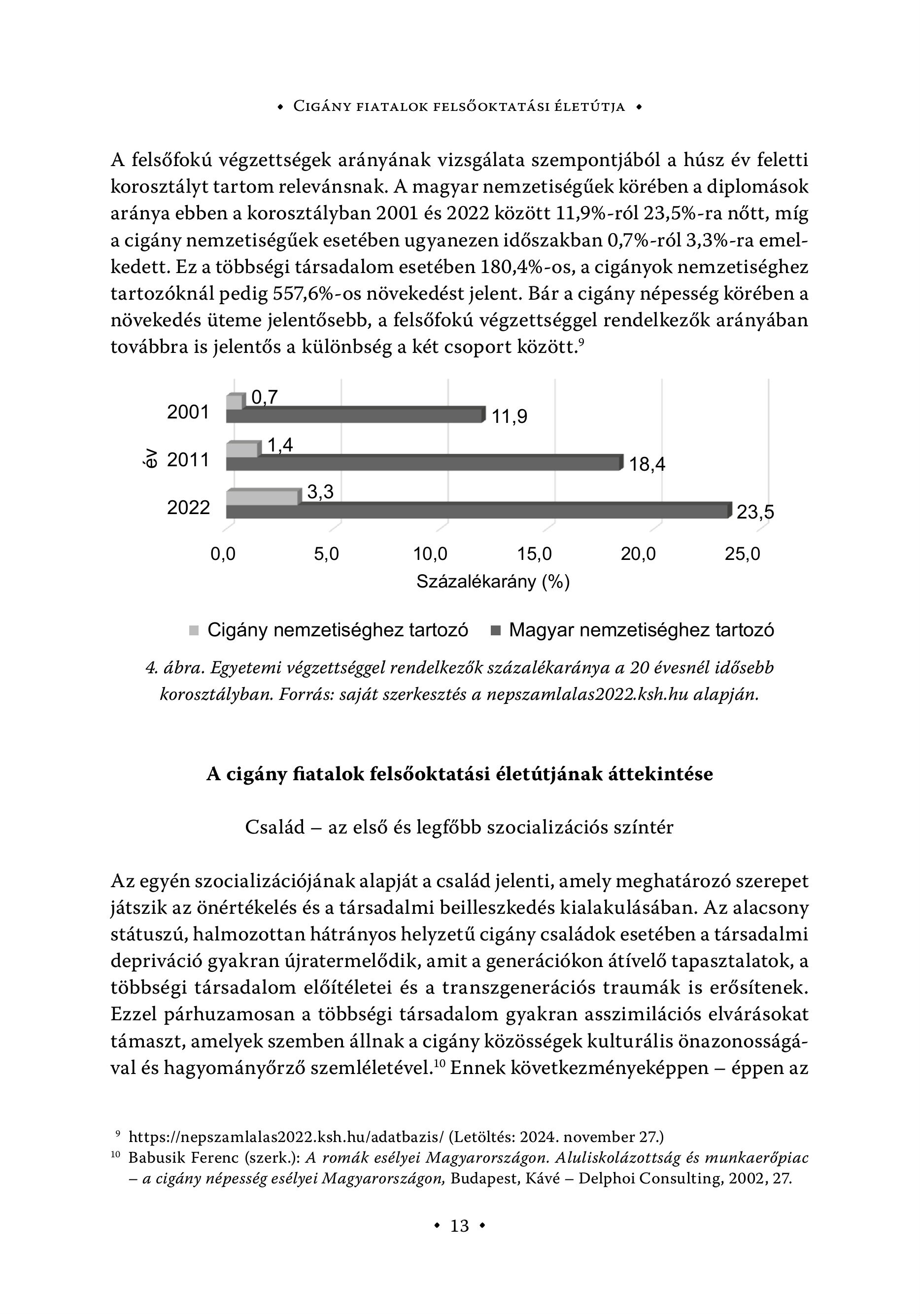 s CIGÁNY FIATALOK FELSŐOKTATÁSI ÉLETÚTJA + A felsőfokú végzettségek arányának vizsgálata szempontjából a húsz év feletti korosztályt tartom relevánsnak. A magyar nemzetiségűek körében a diplomások aránya ebben a korosztályban 2001 és 2022 között 11,9%-r61 23,5%-ra nôtt, mig a cigány nemzetiségűek esetében ugyanezen időszakban 0,796-ról 3,396-ra emelkedett. Ez a többségi társadalom esetében 180,496-os, a cigányok nemzetiséghez tartozóknál pedig 557,696-os növekedést jelent. Bár a cigány népesség körében a növekedés üteme jelentősebb, a felsőfokú végzettséggel rendelkezők arányában továbbra is jelentős a különbség a két csoport között.? | 2001 11,9 1,4 3 2011 sms :5,: 3,3 2022 EEE >: 5 0,0 5,0 10,0 15,0 20,0 25,0 Szazalékarany (%) Cigány nemzetiséghez tartozó . u Magyar nemzetiséghez tartozó 4. ábra. Egyetemi végzettséggel rendelkezők százalékaránya a 20 évesnél idősebb korosztályban. Forrás: saját szerkesztés a nepszamlalas2022.ksh.hu alapján. A cigány fiatalok felsőoktatási életútjának áttekintése Család — az els6 és legfőbb szocializációs színtér Az egyén szocializációjának alapját a család jelenti, amely meghatározó szerepet játszik az önértékelés és a társadalmi beilleszkedés kialakulásában. Az alacsony státuszú, halmozottan hátrányos helyzetű cigány családok esetében a társadalmi depriváció gyakran újratermelődik, amit a generációkon átívelő tapasztalatok, a többségi társadalom előítéletei és a transzgenerációs traumák is erősítenek. Ezzel párhuzamosan a többségi társadalom gyakran asszimilációs elvárásokat támaszt, amelyek szemben állnak a cigány közösségek kulturális önazonosságával és hagyományőrző szemléletével." Ennek következményeképpen - éppen az " https://nepszamlalas2022.ksh.hu/adatbazis/ (Letöltés: 2024. november 27.) 1 Babusik Ferenc (szerk.): A romák esélyei Magyarországon. Aluliskolázottság és munkaerőpiac — a cigány népesség esélyei Magyarországon, Budapest, Kávé — Delphoi Consulting, 2002, 27. s 13 e