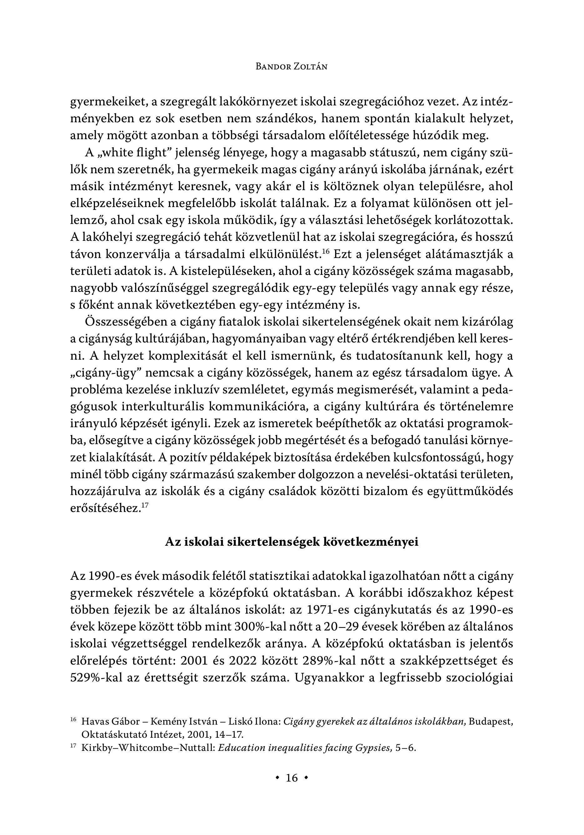 BANDOR ZOLTÁN gyermekeiket, a szegregált lakókörnyezet iskolai szegregációhoz vezet. Az intézményekben ez sok esetben nem szándékos, hanem spontán kialakult helyzet, amely mögött azonban a többségi társadalom előítéletessége húzódik meg. A ,white flight" jelenség lényege, hogy a magasabb státuszú, nem cigány szülők nem szeretnék, ha gyermekeik magas cigány arányú iskolába járnának, ezért másik intézményt keresnek, vagy akár el is költöznek olyan településre, ahol elképzeléseiknek megfelelőbb iskolát találnak. Ez a folyamat különösen ott jellemző, ahol csak egy iskola működik, így a választási lehetőségek korlátozottak. A lakóhelyi szegregáció tehát közvetlenül hat az iskolai szegregációra, és hosszú távon konzerválja a társadalmi elkülönülést." Ezt a jelenséget alátámasztják a területi adatok is. A kistelepüléseken, ahol a cigány közösségek száma magasabb, nagyobb valószínűséggel szegregálódik egy-egy település vagy annak egy része, s főként annak következtében egy-egy intézmény is. Összességében a cigány fiatalok iskolai sikertelenségének okait nem kizárólag a cigányság kultúrájában, hagyományaiban vagy eltérő értékrendjében kell keresni. A helyzet komplexitását el kell ismernünk, és tudatosítanunk kell, hogy a ,Cigány-ügy" nemcsak a cigány közösségek, hanem az egész társadalom ügye. A probléma kezelése inkluzív szemléletet, egymás megismerését, valamint a pedagógusok interkulturális kommunikációra, a cigány kultúrára és történelemre irányuló képzését igényli. Ezek az ismeretek beépíthetők az oktatási programokba, elősegítve a cigány közösségek jobb megértését és a befogadó tanulási környezet kialakítását. A pozitív példaképek biztosítása érdekében kulcsfontosságú, hogy minél több cigány származású szakember dolgozzon a nevelési-oktatási területen, hozzájárulva az iskolák és a cigány családok közötti bizalom és együttműködés erősítéséhez." Az iskolai sikertelenségek következményei Az 1990-es évek második felétől statisztikai adatokkal igazolhatóan nőtt a cigány gyermekek részvétele a középfokú oktatásban. A korábbi időszakhoz képest többen fejezik be az általános iskolát: az 1971-es cigánykutatás és az 1990-es évek közepe között több mint 300%-kal nőtt a 20—29 évesek körében az általános iskolai végzettséggel rendelkezők aránya. A középfokú oktatásban is jelentős előrelépés történt: 2001 és 2022 között 28996-kal nőtt a szakképzettséget és 52996-kal az érettségit szerzők száma. Ugyanakkor a legfrissebb szociológiai 16 Havas Gábor - Kemény István - Liskó Ilona: Cigány gyerekek az általános iskolákban, Budapest, Oktatáskutató Intézet, 2001, 14—17. 7 Kirkby-Whitcombe-Nuttall: Education inequalities facing Gypsies, 5-6. + 16 +