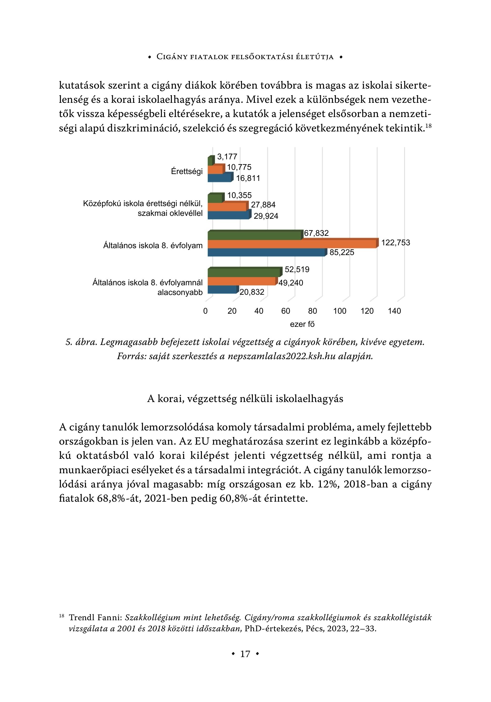 s CIGÁNY FIATALOK FELSŐOKTATÁSI ÉLETÚTJA + kutatások szerint a cigány diákok körében továbbra is magas az iskolai sikertelenség és a korai iskolaelhagyás aránya. Mivel ezek a különbségek nem vezethetők vissza képességbeli eltérésekre, a kutatók a jelenséget elsősorban a nemzetiségi alapú diszkrimináció, szelekció és szegregáció következményének tekintik." 3,177 Érettségi fae 16,811 10,355 Középfokú iskola érettségi nélkül, 27,884 szakmai oklevéllel 29.924 67,832 Általános iskola 8. évfolyam 122,753 85,225 52,519 Általános iskola 8. évfolyamnál 49,240 alacsonyabb 20,832 0 20 40 60 80 100 120 140 ezer f6 5. ábra. Legmagasabb befejezett iskolai végzettség a cigányok körében, kivéve egyetem. Forrás: saját szerkesztés a nepszamlalas2022.ksh.hu alapján. A korai, végzettség nélküli iskolaelhagyás A cigány tanulók lemorzsolódása komoly társadalmi probléma, amely fejlettebb országokban is jelen van. Az EU meghatározása szerint ez leginkább a középfokú oktatásból való korai kilépést jelenti végzettség nélkül, ami rontja a munkaerőpiaci esélyeket és a társadalmi integrációt. A cigány tanulók lemorzsolódási aránya jóval magasabb: míg országosan ez kb. 1296, 2018-ban a cigány fiatalok 68,896-át, 2021-ben pedig 60,896-át érintette. 18 Trendl Fanni: Szakkollégium mint lehetőség. Cigány/roma szakkollégiumok és szakkollégisták vizsgálata a 2001 és 2018 közötti időszakban, PhD-értekezés, Pécs, 2023, 22-33. “17 ¢