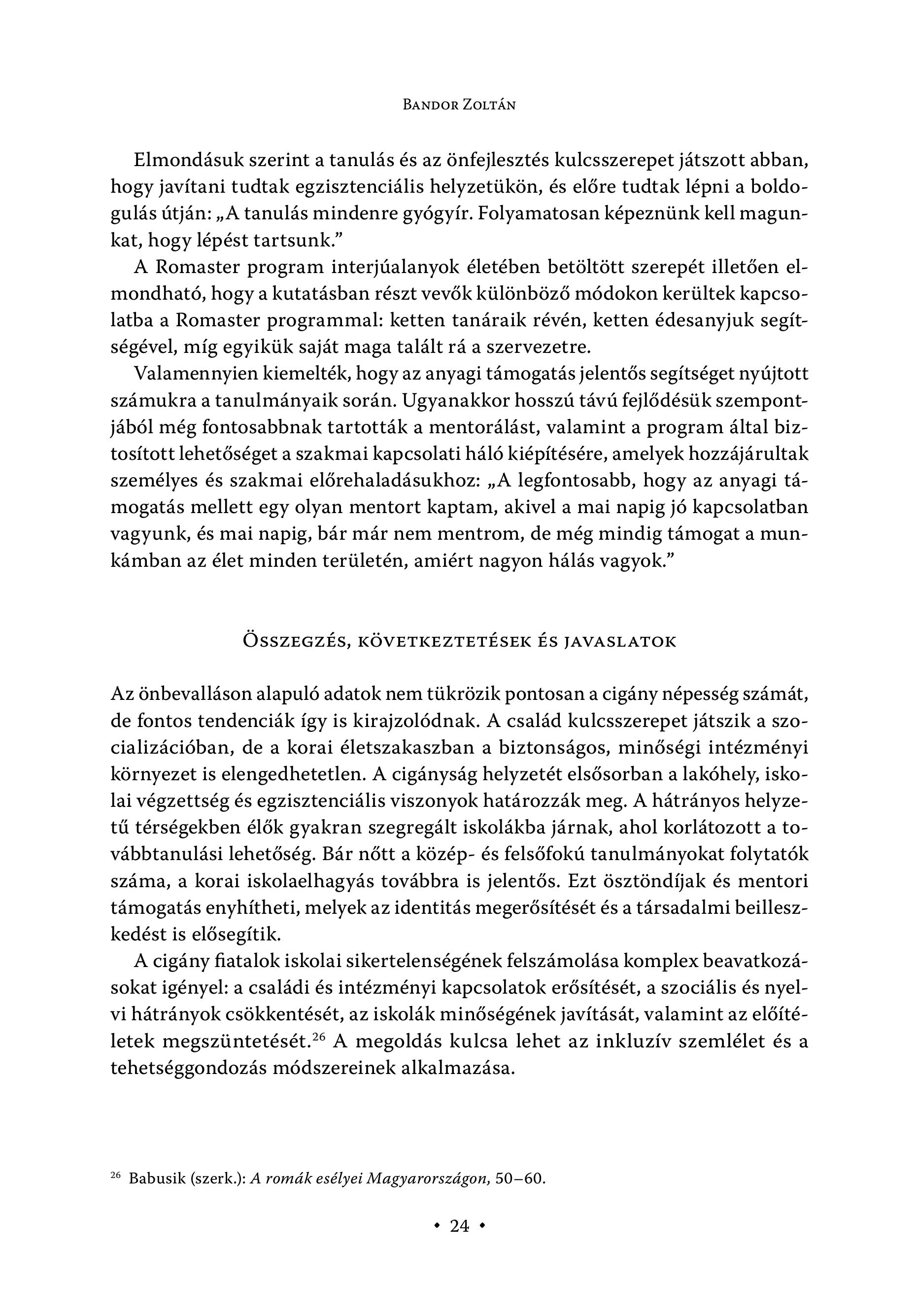 BANDOR ZOLTÁN Elmondásuk szerint a tanulás és az önfejlesztés kulcsszerepet játszott abban, hogy javítani tudtak egzisztenciális helyzetükön, és előre tudtak lépni a boldogulás útján: , A tanulás mindenre gyógyír. Folyamatosan képeznünk kell magunkat, hogy lépést tartsunk." A Romaster program interjúalanyok életében betöltött szerepét illetően elmondható, hogy a kutatásban részt vevők különböző módokon kerültek kapcsolatba a Romaster programmal: ketten tanáraik révén, ketten édesanyjuk segítségével, míg egyikük saját maga talált rá a szervezetre. Valamennyien kiemelték, hogy az anyagi támogatás jelentős segítséget nyújtott számukra a tanulmányaik során. Ugyanakkor hosszú távú fejlődésük szempontjából még fontosabbnak tartották a mentorálást, valamint a program által biztosított lehetőséget a szakmai kapcsolati háló kiépítésére, amelyek hozzájárultak személyes és szakmai előrehaladásukhoz: , A legfontosabb, hogy az anyagi támogatás mellett egy olyan mentort kaptam, akivel a mai napig jó kapcsolatban vagyunk, és mai napig, bár már nem mentrom, de még mindig támogat a munkámban az élet minden területén, amiért nagyon hálás vagyok." ÖSSZEGZÉS, KÖVETKEZTETÉSEK ÉS JAVASLATOK Az önbevalláson alapuló adatok nem tükrözik pontosan a cigány népesség számát, de fontos tendenciák így is kirajzolódnak. A család kulcsszerepet játszik a szocializációban, de a korai életszakaszban a biztonságos, minőségi intézményi környezet is elengedhetetlen. A cigányság helyzetét elsősorban a lakóhely, iskolai végzettség és egzisztenciális viszonyok határozzák meg. A hátrányos helyzetű térségekben élők gyakran szegregált iskolákba járnak, ahol korlátozott a továbbtanulási lehetőség. Bár nőtt a közép- és felsőfokú tanulmányokat folytatók száma, a korai iskolaelhagyás továbbra is jelentős. Ezt ösztöndíjak és mentori támogatás enyhítheti, melyek az identitás megerősítését és a társadalmi beilleszkedést is elősegítik. A cigány fiatalok iskolai sikertelenségének felszámolása komplex beavatkozámr sokat igényel: a családi és intézményi kapcsolatok erősítését, a szociális és nyelvi hátrányok csökkentését, az iskolák minőségének javítását, valamint az előítéletek megszüntetését." A megoldás kulcsa lehet az inkluzív szemlélet és a tehetséggondozás módszereinek alkalmazása. 26 Babusik (szerk.): A romák esélyei Magyarországon, 50-60. . 24 »