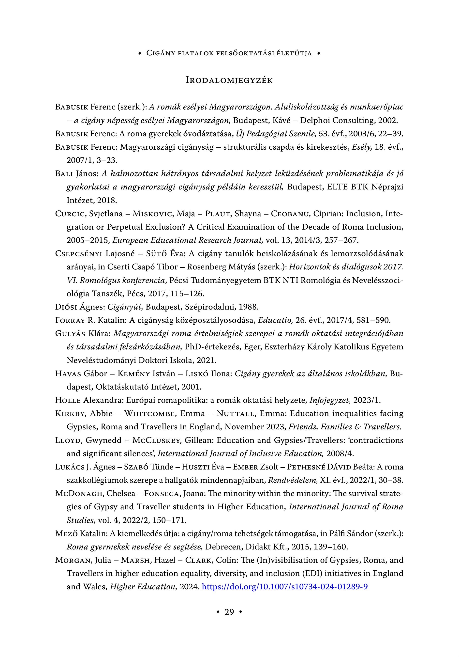 s CIGÁNY FIATALOK FELSŐOKTATÁSI ÉLETÚTJA + IRODALOMJEGYZÉK BABUSIK Ferenc (szerk.): A rornák esélyei Magyarországon. Aluliskolázottság és munkaerőpiac — a cigány népesség esélyei Magyarországon, Budapest, Kávé — Delphoi Consulting, 2002. BABUSIK Ferenc: A roma gyerekek óvodáztatása, Új Pedagógiai Szemle, 53. évf., 2003/6, 22—39. BABUSIK Ferenc: Magyarországi cigányság — strukturális csapda és kirekesztés, Esély, 18. évf., 2007/1, 3—23. BALI János: A halmozottan hátrányos társadalmi helyzet leküzdésének problematikája és jó gyakorlatai a magyarországi cigányság példáin keresztül, Budapest, ELTE BTK Néprajzi Intézet, 2018. CuRcIc, Svjetlana — MISKOvIC, Maja — PLAUT, Shayna — CEOBANU, Ciprian: Inclusion, Integration or Perpetual Exclusion? A Critical Examination of the Decade of Roma Inclusion, 2005-2015, European Educational Research Journal, vol. 13, 2014/3, 257-267. CSEPCSÉNYI Lajosné — SÜTŐ Éva: A cigány tanulók beiskoläzäsänak &s lemorzsolödäsänak arányai, in Cserti Csapó Tibor — Rosenberg Mátyás (szerk.): Horizontok és dialógusok 2017. VI. Romológus konferencia, Pécsi Tudományegyetem BTK NTI Romológia és Nevelésszociológia Tanszék, Pécs, 2017, 115—126. Diósi Ágnes: Cigányút, Budapest, Szépirodalmi, 1988. FORRAY R. Katalin: A cigányság középosztályosodása, Educatio, 26. évf., 2017/4, 581—590. GuLYÁS Klára: Magyarországi roma értelmiségiek szerepei a romák oktatási integrációjában és társadalmi felzárkózásában, PhD-értekezés, Eger, Eszterházy Károly Katolikus Egyetem Neveléstudományi Doktori Iskola, 2021. Havas Gábor — KEMÉNY István - LIsKó Ilona: Cigány gyerekek az általános iskolákban, Budapest, Oktatáskutató Intézet, 2001. HoLLE Alexandra: Európai romapolitika: a romák oktatási helyzete, Infojegyzet, 2023/1. KirkBy, Abbie — WHITCOMBE, Emma — NUTTALL, Emma: Education inegualities facing Gypsies, Roma and Travellers in England, November 2023, Friends, Families & Travellers. LLoyp, Gwynedd — McC.uskeEy, Gillean: Education and Gypsies/Travellers: ‘contradictions and significant silences, International Journal of Inclusive Education, 2008/4. LuxAcs J. Agnes — $zAB6 Tiinde — Huszti Eva — Emer Zsolt — PETHESNE DAvip Beata: A roma szakkollegiumok szerepe a hallgatök mindennapjaiban, Rendvédelem, XI. évf., 2022/1, 30-38. McDonaGu, Chelsea — FONSECA, Joana: The minority within the minority: The survival strategies of Gypsy and Traveller students in Higher Education, International Journal of Roma Studies, vol. 4, 2022/2, 150-171. MEző Katalin: A kiemelkedés útja: a cigány/roma tehetségek támogatása, in Pálfi Sandor (szerk.): Roma gyermekek nevelése és segitése, Debrecen, Didakt Kft., 2015, 139-160. MORGAN, Julia — MARSH, Hazel — CLARK, Colin: The (In)visibilisation of Gypsies, Roma, and Travellers in higher education equality, diversity, and inclusion (EDI) initiatives in England and Wales, Higher Education, 2024. https://doi.org/10.1007/s10734-024-01289-9 «29 «