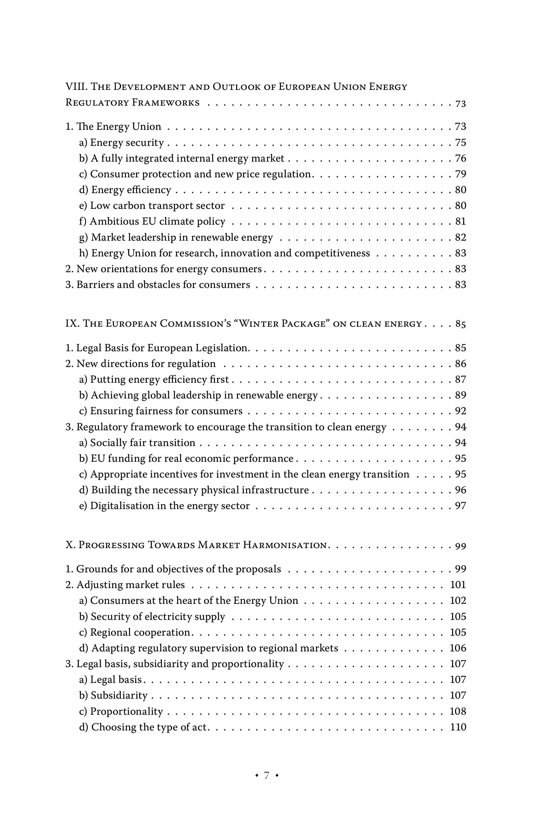 VIII. THE DEVELOPMENT AND OUTLOOK OF EUROPEAN UNION ENERGY REGULATORY FRAMEWORKS ............................... 73 1. The Energy Union .................................... 73 a) Energy security. ................................... 75 b) A fully integrated internal energy market..................... 76 c) Consumer protection and new price regulation. ................. 79 d) Energy efficiency ................................... 80 e) Low carbon transport sector ............................ 80 f) Ambitious EU climate policy ............................ 81 g) Market leadership in renewable energy ...................... 82 h) Energy Union for research, innovation and competitiveness .......... 83 2. New orientations for energy consumers. ....................... 83 3. Barriers and obstacles for consumers ......................... 83 IX. THE EUROPEAN COMMISSION’S “WINTER PACKAGE” ON CLEAN ENERGY... . 85 1. Legal Basis for European Legislation. ......................... 85 2. New directions for regulation ............................. 86 a) Putting energy efficiency first. ........................... 87 b) Achieving global leadership in renewable energy. ................ 89 c) Ensuring fairness for consumers .......................... 92 3. Regulatory framework to encourage the transition to clean energy ........ 94 a) Socially fair transition . ............................... 94 b) EU funding for real economic performance. ................... 95 c) Appropriate incentives for investment in the clean energy transition .. ... 95 d) Building the necessary physical infrastructure. ................. 96 e) Digitalisation in the energy sector ......................... 97 X. PROGRESSING TOWARDS MARKET HARMONISATION. ............... 99 1. Grounds for and objectives of the proposals ..................... 99 2. Adjusting market rules ................................ 101 a) Consumers at the heart of the Energy Union .................. 102 b) Security of electricity supply . .......................... 105 c) Regional cooperation. ............................... 105 d) Adapting regulatory supervision to regional markets ............. 106 3. Legal basis, subsidiarity and proportionality . ................... 107 a) Legal basis. ..................................... 107 b) Subsidiarity . .................................... 107 c) Proportionality ................................... 108 d) Choosing the type ofact. ............................. 110