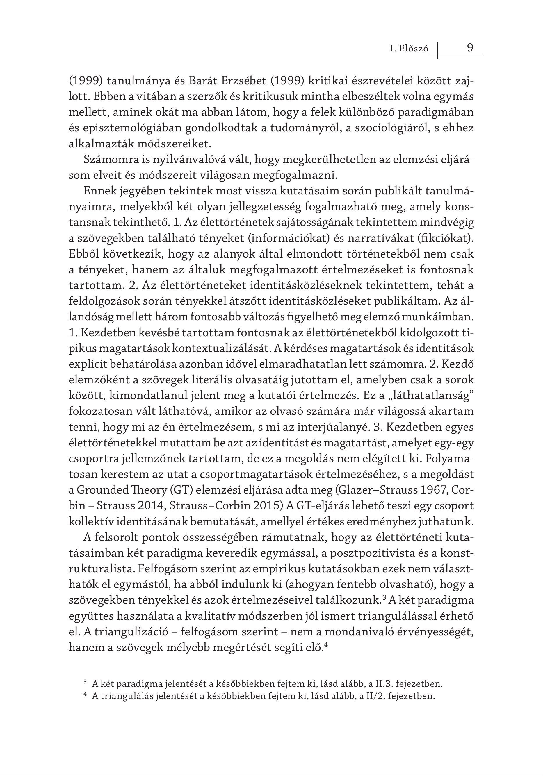 I. Előszó 9 (1999) tanulmánya és Barát Erzsébet (1999) kritikai észrevételei között zajlott. Ebben a vitában a szerzők és kritikusuk mintha elbeszéltek volna egymás mellett, aminek okát ma abban látom, hogy a felek különböző paradigmában és episztemológiában gondolkodtak a tudományról, a szociológiáról, s ehhez alkalmazták módszereiket. Számomra is nyilvánvalóvá vált, hogy megkerülhetetlen az elemzési eljárásom elveit és módszereit világosan megfogalmazni. Ennek jegyében tekintek most vissza kutatásaim során publikált tanulmányaimra, melyekből két olyan jellegzetesség fogalmazható meg, amely konstansnak tekinthető. 1. Az élettörténetek sajátosságának tekintettem mindvégig a szövegekben található tényeket (információkat) és narratívákat (fikciókat). Ebből következik, hogy az alanyok által elmondott történetekből nem csak a tényeket, hanem az általuk megfogalmazott értelmezéseket is fontosnak tartottam. 2. Az élettörténeteket identitásközléseknek tekintettem, tehát a feldolgozások során tényekkel átszőtt identitásközléseket publikáltam. Az állandóság mellett három fontosabb változás figyelhető meg elemző munkáimban. 1. Kezdetben kevésbé tartottam fontosnak az élettörténetekből kidolgozott tipikus magatartások kontextualizálását. A kérdéses magatartások és identitások explicit behatárolása azonban idővel elmaradhatatlan lett számomra. 2. Kezdő elemzőként a szövegek literális olvasatáig jutottam el, amelyben csak a sorok között, kimondatlanul jelent meg a kutatói értelmezés. Ez a , láthatatlanság" fokozatosan vált láthatóvá, amikor az olvasó számára már világossá akartam tenni, hogy mi az én értelmezésem, s mi az interjúalanyé. 3. Kezdetben egyes élettörténetekkel mutattam be azt az identitást és magatartást, amelyet egy-egy csoportra jellemzőnek tartottam, de ez a megoldás nem elégített ki. Folyamatosan kerestem az utat a csoportmagatartások értelmezéséhez, s a megoldást a Grounded Theory (GT) elemzési eljárása adta meg (Glazer-Strauss 1967, Corbin - Strauss 2014, Strauss-Corbin 2015) A GT-eljárás lehető teszi egy csoport kollektív identitásának bemutatását, amellyel értékes eredményhez juthatunk. A felsorolt pontok összességében rámutatnak, hogy az élettörténeti kutatásaimban két paradigma keveredik egymással, a posztpozitivista és a konstrukturalista. Felfogásom szerint az empirikus kutatásokban ezek nem választhatók el egymástól, ha abból indulunk ki (ahogyan fentebb olvasható), hogy a szövegekben tényekkel és azok értelmezéseivel találkozunk.? A két paradigma együttes használata a kvalitatív módszerben jól ismert triangulálással érhető el. A triangulizáció - felfogásom szerint - nem a mondanivaló érvényességét, hanem a szövegek mélyebb megértését segíti elő." 5 A két paradigma jelentését a későbbiekben fejtem ki, lásd alább, a II.3. fejezetben. : A triangulálás jelentését a későbbiekben fejtem ki, lásd alább, a II/2. fejezetben.