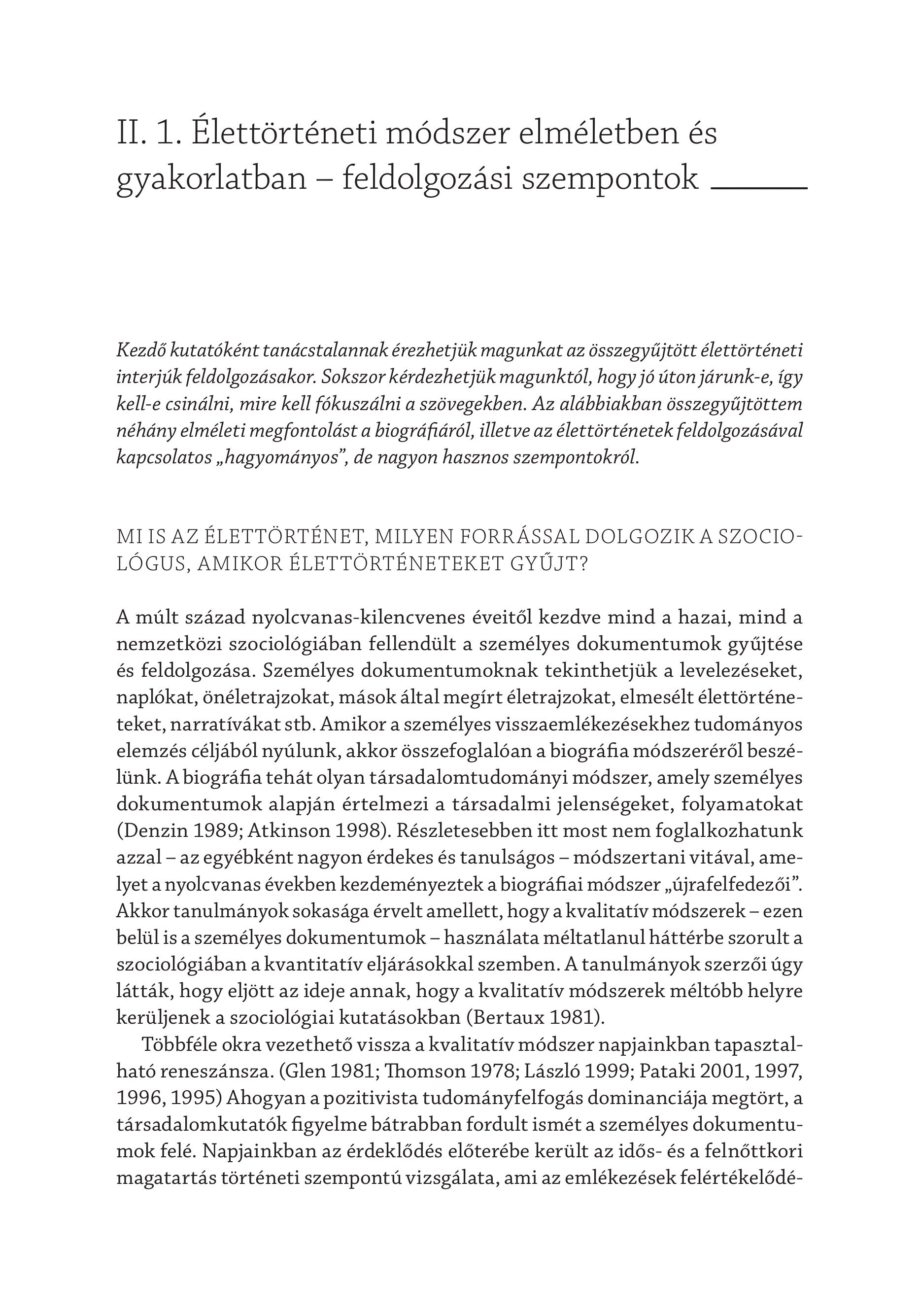 II. 1. Élettörténeti módszer elméletben és gyakorlatban - feldolgozási szempontok Kezdő kutatóként tanácstalannak érezhetjük magunkat az összegyűjtött élettörténeti interjúk feldolgozásakor. Sokszor kérdezhetjük magunktól, hogy jó úton járunk-e, így kell-e csinálni, mire kell fókuszálni a szövegekben. Az alábbiakban összegyűjtöttem néhány elméleti megfontolást a biográfiáról, illetve az élettörténetek feldolgozásával kapcsolatos , hagyományos", de nagyon hasznos szempontokról. MIIS AZ ÉLETTÖRTÉNET, MILYEN FORRÁSSAL DOLGOZIK A SZOCIOLÓGUS, AMIKOR ÉLETTÖRTÉNETEKET GYŰJT? A múlt század nyolcvanas-kilencvenes éveitől kezdve mind a hazai, mind a nemzetközi szociológiában fellendült a személyes dokumentumok gyűjtése és feldolgozása. Személyes dokumentumoknak tekinthetjük a levelezéseket, naplókat, önéletrajzokat, mások által megírt életrajzokat, elmesélt élettörténeteket, narratívákat stb. Amikor a személyes visszaemlékezésekhez tudományos elemzés céljából nyúlunk, akkor összefoglalóan a biográfia módszeréről beszélünk. A biográfia tehát olyan társadalomtudományi módszer, amely személyes dokumentumok alapján értelmezi a társadalmi jelenségeket, folyamatokat (Denzin 1989; Atkinson 1998). Részletesebben itt most nem foglalkozhatunk azzal - az egyébként nagyon érdekes és tanulságos - módszertani vitával, amelyet a nyolcvanas években kezdeményeztek a biográfiai mödszer „üjrafelfedezöi”. Akkor tanulmányok sokasága érvelt amellett, hogy a kvalitatív módszerek - ezen belülis aszemélyes dokumentumok - használata méltatlanul háttérbe szorult a szociológiában a kvantitatív eljárásokkal szemben. A tanulmányok szerzői úgy látták, hogy eljött az ideje annak, hogy a kvalitatív módszerek méltóbb helyre kerüljenek a szociológiai kutatásokban (Bertaux 1981). Többféle okra vezethető vissza a kvalitatív módszer napjainkban tapasztalható reneszánsza. (Glen 1981; Ihomson 1978; László 1999; Pataki 2001, 1997, 1996, 1995) Ahogyan a pozitivista tudományfelfogás dominanciája megtört, a társadalomkutatók figyelme bátrabban fordult ismét a személyes dokumentumok felé. Napjainkban az érdeklődés előterébe került az idős- és a felnőttkori magatartás történeti szempontú vizsgálata, ami az emlékezések felértékelődé