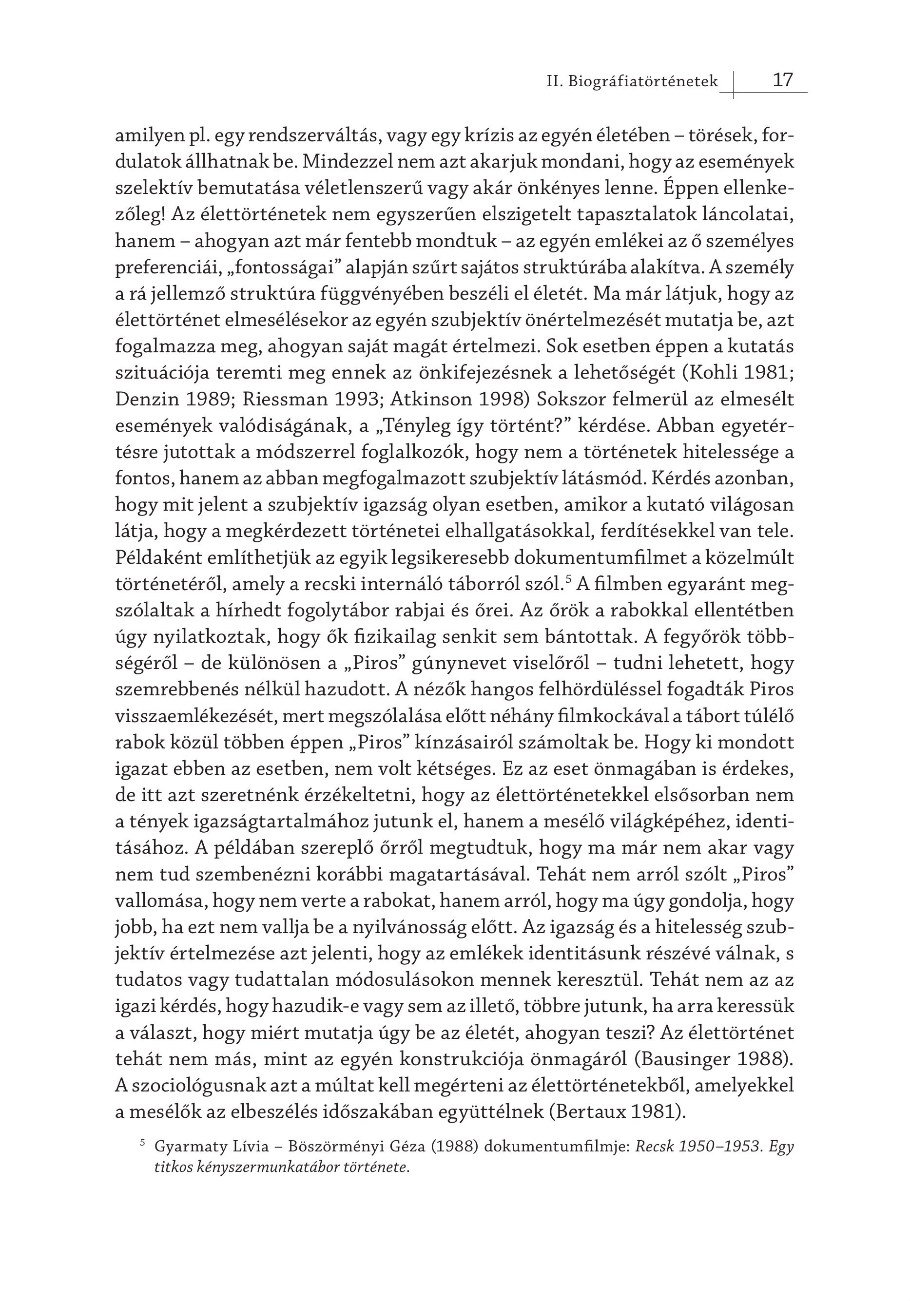 II. Biográfiatörténetek 17 amilyen pl. egy rendszerváltás, vagy egy krízis az egyén életében - törések, fordulatok állhatnak be. Mindezzel nem azt akarjuk mondani, hogy az események szelektív bemutatása véletlenszerű vagy akár önkényes lenne. Éppen ellenkezőleg! Az élettörténetek nem egyszerűen elszigetelt tapasztalatok láncolatai, hanem - ahogyan azt már fentebb mondtuk - az egyén emlékei az ő személyes preferenciái, , fontosságai" alapján szűrt sajátos struktúrába alakítva. A személy a rá jellemző struktúra függvényében beszéli el életét. Ma már látjuk, hogy az élettörténet elmesélésekor az egyén szubjektív önértelmezését mutatja be, azt fogalmazza meg, ahogyan saját magát értelmezi. Sok esetben éppen a kutatás szituációja teremti meg ennek az önkifejezésnek a lehetőségét (Kohli 1981; Denzin 1989; Riessman 1993; Atkinson 1998) Sokszor felmerül az elmesélt események valódiságának, a , Tényleg így történt?" kérdése. Abban egyetértésre jutottak a módszerrel foglalkozók, hogy nem a történetek hitelessége a fontos, hanem az abban megfogalmazott szubjektív látásmód. Kérdés azonban, hogy mit jelent a szubjektív igazság olyan esetben, amikor a kutató világosan látja, hogy a megkérdezett történetei elhallgatásokkal, ferdítésekkel van tele. Példaként említhetjük az egyik legsikeresebb dokumentumfilmet a közelmúlt történetéről, amely a recski internáló táborról szól." A filmben egyaránt megszólaltak a hírhedt fogolytábor rabjai és őrei. Az őrök a rabokkal ellentétben úgy nyilatkoztak, hogy ők fizikailag senkit sem bántottak. A fegyőrök többségéről — de különösen a , Piros" gúnynevet viselőről - tudni lehetett, hogy szemrebbenés nélkül hazudott. A nézők hangos felhördüléssel fogadták Piros visszaemlékezését, mert megszólalása előtt néhány filmkockával a tábort túlélő rabok közül többen éppen , Piros" kínzásairól számoltak be. Hogy ki mondott igazat ebben az esetben, nem volt kétséges. Ez az eset önmagában is érdekes, de itt azt szeretnénk érzékeltetni, hogy az élettörténetekkel elsősorban nem a tények igazságtartalmához jutunk el, hanem a mesélő világképéhez, identitásához. A példában szereplő őrről megtudtuk, hogy ma már nem akar vagy nem tud szembenézni korábbi magatartásával. Tehát nem arról szólt , Piros" vallomása, hogy nem verte a rabokat, hanem arról, hogy ma úgy gondolja, hogy jobb, ha ezt nem vallja be a nyilvánosság előtt. Az igazság és a hitelesség szubjektív értelmezése azt jelenti, hogy az emlékek identitásunk részévé válnak, s tudatos vagy tudattalan módosulásokon mennek keresztül. Tehát nem az az igazi kérdés, hogy hazudik-e vagy sem azillető, többre jutunk, ha arra keressük a választ, hogy miért mutatja úgy be az életét, ahogyan teszi? Az élettörténet tehát nem más, mint az egyén konstrukciója önmagáról (Bausinger 1988). A szociológusnak azt a múltat kell megérteni az élettörténetekből, amelyekkel a mesélők az elbeszélés időszakában együttélnek (Bertaux 1981). ° Gyarmaty Livia - Böszörményi Géza (1988) dokumentumfilmje: Recsk 1950-1953. Egy titkos kényszermunkatábor története.