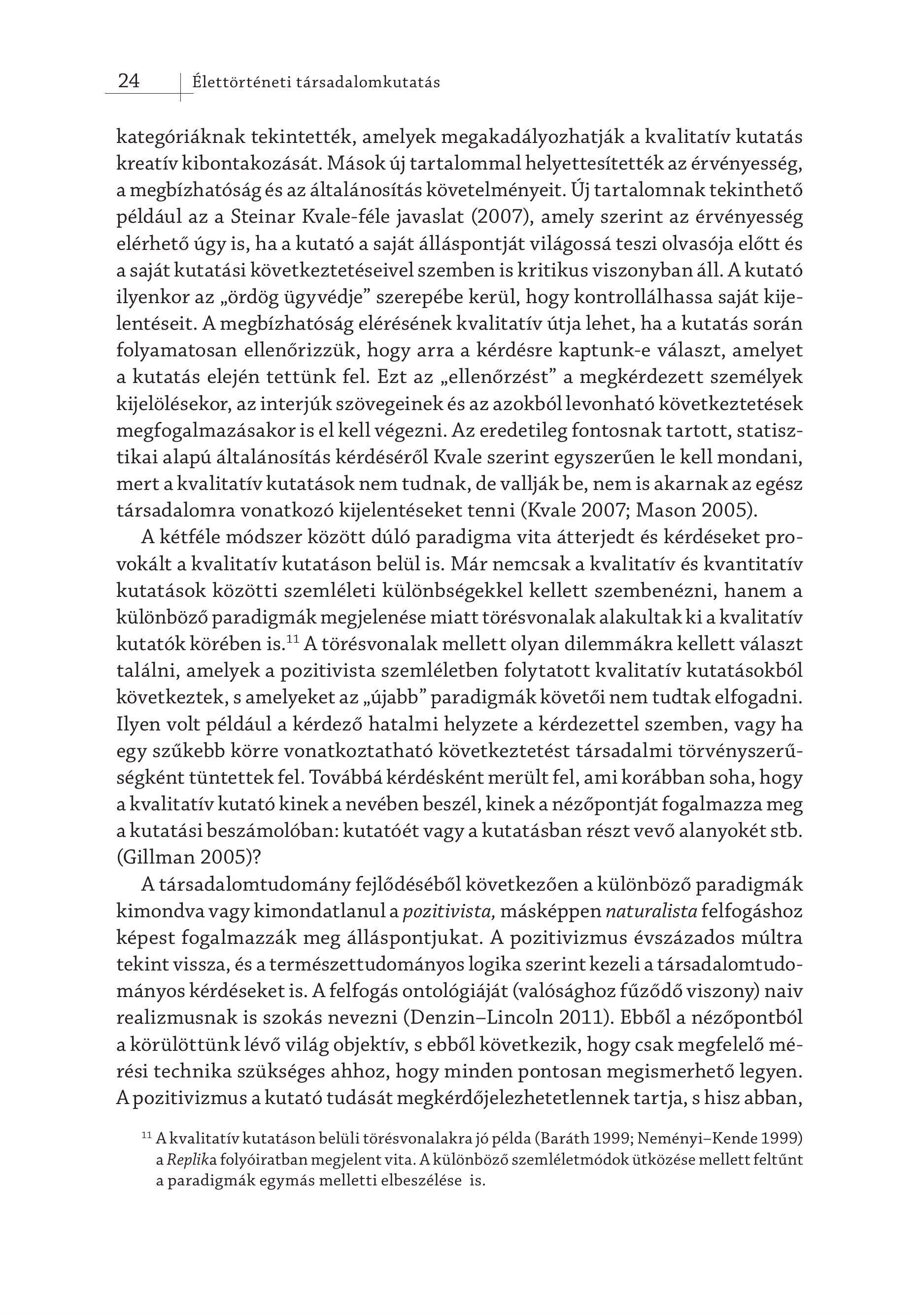 24 Élettörténeti társadalomkutatás kategóriáknak tekintették, amelyek megakadályozhatják a kvalitatív kutatás kreatív kibontakozását. Mások új tartalommal helyettesítették az érvényesség, a megbízhatóság és az általánosítás követelményeit. Új tartalomnak tekinthető például az a Steinar Kvale-féle javaslat (2007), amely szerint az érvényesség elérhető úgy is, ha a kutató a saját álláspontját világossá teszi olvasója előtt és a saját kutatási következtetéseivel szemben is kritikus viszonyban áll. A kutató ilyenkor az , ördög ügyvédje" szerepébe kerül, hogy kontrollálhassa saját kijelentéseit. A megbízhatóság elérésének kvalitatív útja lehet, ha a kutatás során folyamatosan ellenőrizzük, hogy arra a kérdésre kaptunk-e választ, amelyet a kutatás elején tettünk fel. Ezt az , ellenőrzést" a megkérdezett személyek kijelölésekor, az interjúk szövegeinek és az azokbóllevonható következtetések megfogalmazásakor is el kell végezni. Az eredetileg fontosnak tartott, statisztikai alapú általánosítás kérdéséről Kvale szerint egyszerűen le kell mondani, mert a kvalitatív kutatások nem tudnak, de vallják be, nemis akarnak az egész társadalomra vonatkozó kijelentéseket tenni (Kvale 2007; Mason 2005). A kétféle módszer között dúló paradigma vita átterjedt és kérdéseket provokált a kvalitatív kutatáson belül is. Már nemcsak a kvalitatív és kvantitatív kutatások közötti szemléleti különbségekkel kellett szembenézni, hanem a különböző paradigmák megjelenése miatt törésvonalak alakultak ki a kvalitatív kutatók körében is." A törésvonalak mellett olyan dilemmákra kellett választ találni, amelyek a pozitivista szemléletben folytatott kvalitatív kutatásokból következtek, s amelyeket az , újabb" paradigmák követői nem tudtak elfogadni. Ilyen volt például a kérdező hatalmi helyzete a kérdezettel szemben, vagy ha egy szűkebb körre vonatkoztatható következtetést társadalmi törvényszerűségként tüntettek fel. Továbbá kérdésként merült fel, ami korábban soha, hogy a kvalitatív kutató kinek a nevében beszél, kinek a nézőpontját fogalmazza meg akutatási beszámolóban: kutatóét vagy a kutatásban részt vevő alanyokét stb. (Gillman 2005)? A társadalomtudomány fejlődéséből következően a különböző paradigmák kimondva vagy kimondatlanul a pozitivista, másképpen naturalista felfogáshoz képest fogalmazzák meg álláspontjukat. A pozitivizmus évszázados múltra tekint vissza, és atermészettudományos logika szerint kezeli a tarsadalomtudományos kérdéseket is. A felfogás ontológiáját (valósághoz fűződő viszony) naiv realizmusnak is szokás nevezni (Denzin-Lincoln 2011). Ebből a nézőpontból a körülöttünk lévő világ objektív, s ebből következik, hogy csak megfelelő mérési technika szükséges ahhoz, hogy minden pontosan megismerhető legyen. A pozitivizmus a kutató tudását megkérdőjelezhetetlennek tartja, s hisz abban, 1 A kvalitatív kutatáson belüli törésvonalakra jó példa (Baráth 1999; Nemenyi-Kende 1999) a Replika folyóiratban megjelent vita. A különböző szemléletmódok ütközése mellett feltűnt a paradigmák egymás melletti elbeszélése is.