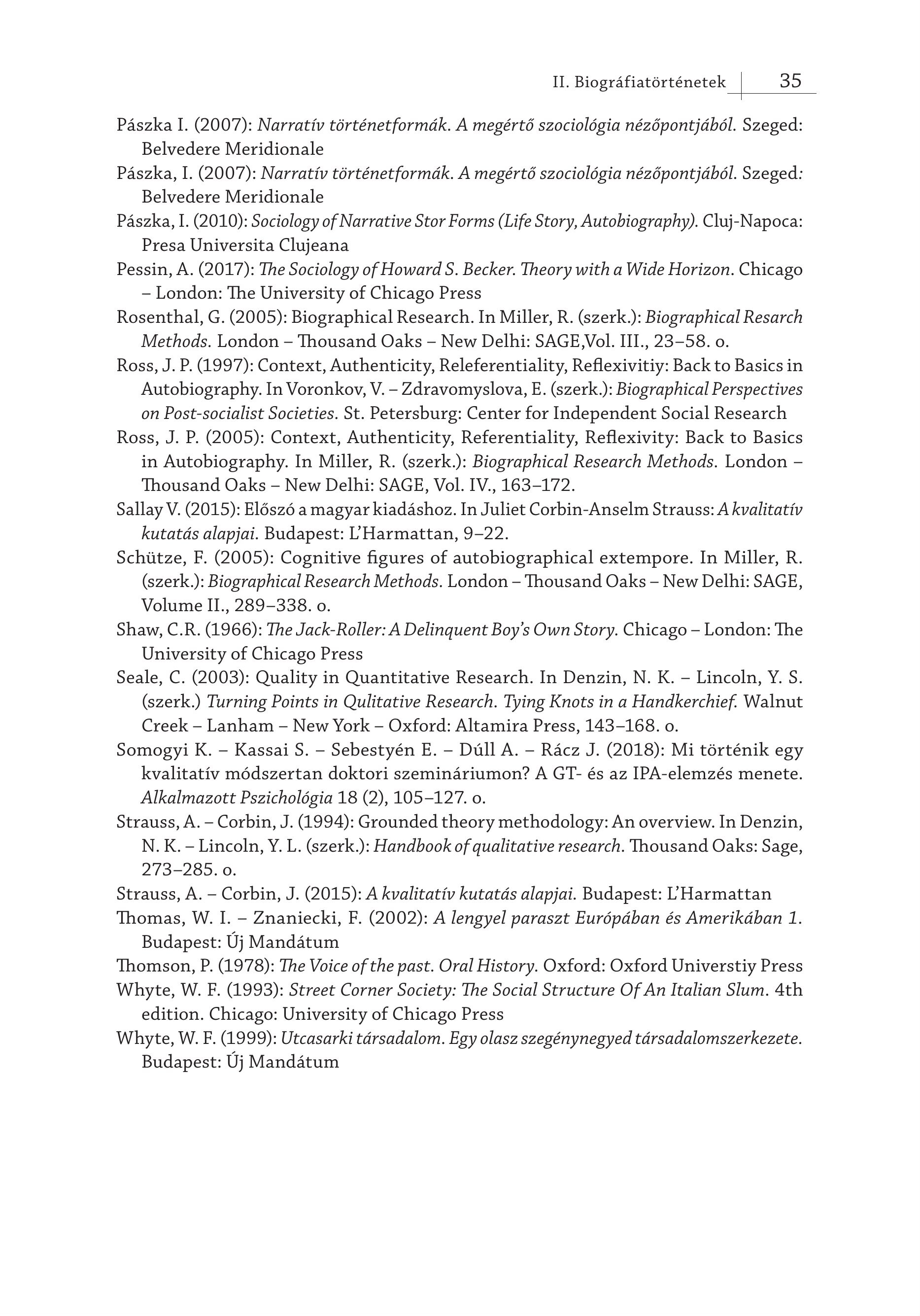 II. Biográfiatörténetek 35 Pászka I. (2007): Narratív történetformák. A megértő szociológia nézőpontjából. Szeged: Belvedere Meridionale Pászka, I. (2007): Narratív történetformák. A megértő szociológia nézőpontjából. Szeged: Belvedere Meridionale Paszka, I. (2010): Sociology of Narrative Stor Forms (Life Story, Autobiography). Cluj-Napoca: Presa Universita Clujeana Pessin, A. (2017): The Sociology of Howard S. Becker. Theory with a Wide Horizon. Chicago - London: The University of Chicago Press Rosenthal, G. (2005): Biographical Research. In Miller, R. (szerk.): Biographical Resarch Methods. London - Thousand Oaks - New Delhi: SAGE Vol. III., 23-58. o. Ross, J. P. (1997): Context, Authenticity, Releferentiality, Reflexivitiy: Back to Basics in Autobiography. In Voronkov, V. - Zdravomyslova, E. (szerk.): Biographical Perspectives on Post-socialist Societies. St. Petersburg: Center for Independent Social Research Ross, J. P. (2005): Context, Authenticity, Referentiality, Reflexivity: Back to Basics in Autobiography. In Miller, R. (szerk.): Biographical Research Methods. London Thousand Oaks - New Delhi: SAGE, Vol. IV., 163-172. Sallay V. (2015): Előszó a magyar kiadáshoz. In Juliet Corbin-Anselm Strauss: A kvalitatív kutatás alapjai. Budapest: LHarmattan, 9-22. Schütze, F. (2005): Cognitive figures of autobiographical extempore. In Miller, R. (szerk.): Biographical Research Methods. London - Thousand Oaks - New Delhi: SAGE, Volume II., 289-338. o. Shaw, C.R. (1966): The Jack-Roller: A Delinquent Boy’s Own Story. Chicago - London: The University of Chicago Press Seale, C. (2003): Quality in Quantitative Research. In Denzin, N. K. - Lincoln, Y. S. (szerk.) Turning Points in Qulitative Research. Tying Knots in a Handkerchief. Walnut Creek — Lanham — New York - Oxford: Altamira Press, 143-168. o. Somogyi K. - Kassai S. - Sebestyén E. - Dull A. - Racz J. (2018): Mi térténik egy kvalitatív módszertan doktori szemináriumon? A GT- és az IPA-elemzés menete. Alkalmazott Pszichológia 18 (2), 105-127. o. Strauss, A. - Corbin, J. (1994): Grounded theory methodology: An overview. In Denzin, N. K. - Lincoln, Y. L. (szerk.): Handbook of qualitative research. Thousand Oaks: Sage, 273-285. o. Strauss, À. - Corbin, J. (2015): À kvalitativ kutatäs alapjai. Budapest: L'Harmattan Thomas, W. I. - Znaniecki, F. (20029: A lengyel paraszt Európában és Amerikában 1. Budapest: Új Mandátum Thomson, P. (1978): The Voice of the past. Oral History. Oxford: Oxford Universtiy Press Whyte, W. F. (1993): Street Corner Society: The Social Structure Of An Italian Slum. 4th edition. Chicago: University of Chicago Press Whyte, W. F. (1999): Utcasarki tärsadalom. Egy olasz szegenynegyed tärsadalomszerkezete. Budapest: Uj Mandatum