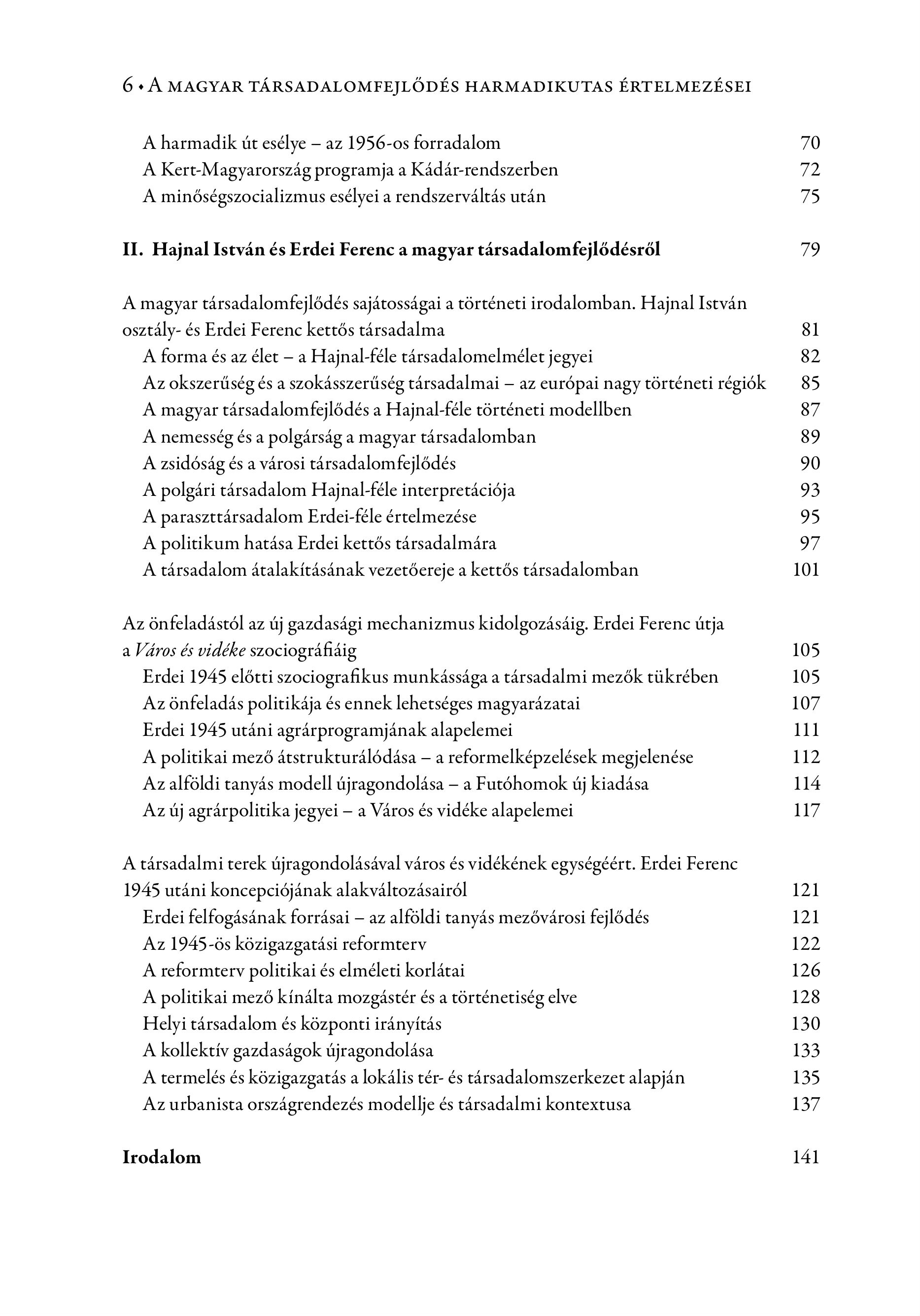 6 " A MAGYAR TÁRSADALOMFEJLŐDÉS HARMADIKUTAS ÉRTELMEZÉSEI A harmadik út esélye — az 1956-os forradalom A Kert-Magyarország programja a Kádár-rendszerben A minőségszocializmus esélyei a rendszerváltás után II. Hajnal István és Erdei Ferenc a magyar társadalomfejlődésről A magyar társadalomfejlődés sajátosságai a történeti irodalomban. Hajnal István osztály- és Erdei Ferenc kettős társadalma A forma és az élet - a Hajnal-féle társadalomelmélet jegyei Az okszerűség és a szokásszerűség társadalmai — az európai nagy történeti régiók A magyar társadalomfejlődés a Hajnal-féle történeti modellben A nemesség és a polgárság a magyar társadalomban A zsidóság és a városi társadalomfejlődés A polgári társadalom Hajnal-féle interpretációja A paraszttársadalom Erdei-féle értelmezése A politikum hatása Erdei kettős társadalmára A társadalom átalakításának vezetőereje a kettős társadalomban Az önfeladástól az új gazdasági mechanizmus kidolgozásáig. Erdei Ferenc útja a Väros és vidéke szociogräfiäig Erdei 1945 előtti szociografikus munkássága a társadalmi mezők tükrében Az önfeladás politikája és ennek lehetséges magyarázatai Erdei 1945 utáni agrárprogramjának alapelemei A politikai mező átstrukturálódása — a reformelképzelések megjelenése Az alföldi tanyás modell újragondolása — a Futóhomok új kiadása Az új agrárpolitika jegyei — a Város és vidéke alapelemei A társadalmi terek újragondolásával város és vidékének egységéért. Erdei Ferenc 1945 utáni koncepciójának alakváltozásairól Erdei felfogásának forrásai — az alföldi tanyás mezővárosi fejlődés Az 1945-ös közigazgatási reformterv A reformterv politikai és elméleti korlátai A politikai mező kínálta mozgástér és a történetiség elve Helyi társadalom és központi irányítás A kollektív gazdaságok újragondolása A termelés és közigazgatás a lokális tér- és társadalomszerkezet alapján Az urbanista országrendezés modellje és társadalmi kontextusa Irodalom 70 72 75 79 81 82 85 87 89 90 93 95 97 101 105 105 107 111 112 114 117 121 121 122 126 128 130 133 135 137 141