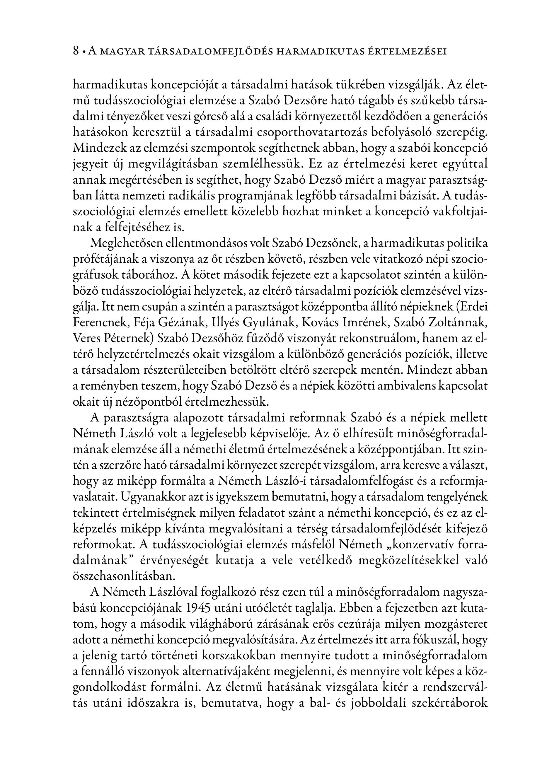 8 " A MAGYAR TÁRSADALOMFEJLŐDÉS HARMADIKUTAS ÉRTELMEZÉSEI harmadikutas koncepcióját a társadalmi hatások tükrében vizsgálják. Az életmű tudásszociológiai elemzése a Szabó Dezsőre ható tágabb és szűkebb társadalmi tényezőket veszi górcső alá a családi környezettől kezdődően a generációs hatásokon keresztül a társadalmi csoporthovatartozás befolyásoló szerepéig. Mindezek az elemzési szempontok segíthetnek abban, hogy a szabói koncepció jegyeit új megvilágításban szemlélhessük. Ez az értelmezési keret egyúttal annak megértésében is segíthet, hogy Szabó Dezső miért a magyar parasztságban látta nemzeti radikális programjának legfőbb társadalmi bázisát. A tudásszociológiai elemzés emellett közelebb hozhat minket a koncepció vakfoltjainak a felfejtéséhez is. Meglehetősen ellentmondásos volt Szabó Dezsőnek, a harmadikutas politika prófétájának a viszonya az őt részben követő, részben vele vitatkozó népi szociográfusok táborához. A kötet második fejezete ezt a kapcsolatot szintén a különböző tudásszociológiai helyzetek, az eltérő társadalmi pozíciók elemzésével vizsgálja. Itt nem csupán a szintén a parasztságot középpontba állító népieknek (Erdei Ferencnek, Féja Gézának, Illyés Gyulának, Kovács Imrének, Szabó Zoltánnak, Veres Péternek) Szabó Dezsőhöz fűződő viszonyát rekonstruálom, hanem az eltérő helyzetértelmezés okait vizsgálom a különböző generációs pozíciók, illetve a társadalom részterületeiben betöltött eltérő szerepek mentén. Mindezt abban a reményben teszem, hogy Szabó Dezső és a népiek közötti ambivalens kapcsolat okait új nézőpontból értelmezhessük. A parasztságra alapozott társadalmi reformnak Szabó és a népiek mellett Németh László volt a legjelesebb képviselője. Az ő elhíresült minőségforradalmának elemzése áll a némethi életmű értelmezésének a középpontjában. Itt szintén a szerzőre ható társadalmi környezet szerepét vizsgálom, arra keresve a választ, hogy az miképp formálta a Németh László-i társadalomfelfogást és a reformjavaslatait. Ugyanakkor azt is igyekszem bemutatni, hogy a társadalom tengelyének tekintett értelmiségnek milyen feladatot szánt a némethi koncepció, és ez az elképzelés miképp kívánta megvalósítani a térség társadalomfejlődését kifejező reformokat. A tudásszociológiai elemzés másfelől Németh , konzervatív forradalmänak” érvényeségét kutatja a vele vetélkedő megközelítésekkel való összehasonlitäsban. A Németh Lászlóval foglalkozó rész ezen túl a minőségforradalom nagyszabású koncepciójának 1945 utáni utóéletét taglalja. Ebben a fejezetben azt kutatom, hogy a második világháború zárásának erős cezúrája milyen mozgásteret adott a némethi koncepció megvalósítására. Az értelmezés itt arra fókuszál, hogy a jelenig tartó történeti korszakokban mennyire tudott a minőségforradalom a fennálló viszonyok alternatívájaként megjelenni, és mennyire volt képes a közgondolkodást formálni. Az életmű hatásának vizsgálata kitér a rendszerváltás utáni időszakra is, bemutatva, hogy a bal- és jobboldali szekértáborok