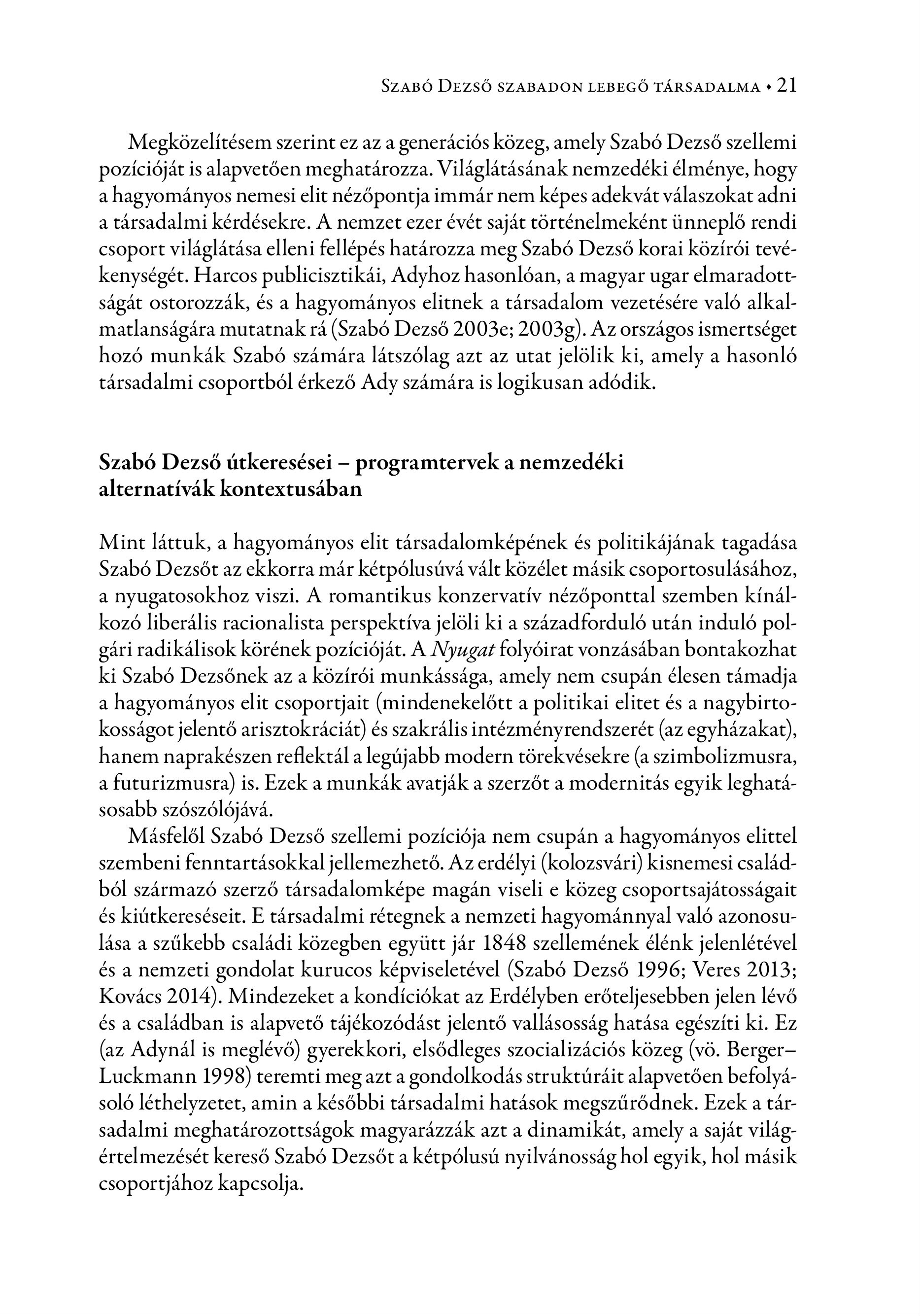 SZABÓ DEZSŐ SZABADON LEBEGŐ TÁRSADALMA + 21 Megközelítésem szerint ez az a generációs közeg, amely Szabó Dezső szellemi pozícióját is alapvetően meghatározza. Világlátásának nemzedéki élménye, hogy a hagyományos nemesi elit nézőpontja immár nem képes adekvát válaszokat adni a társadalmi kérdésekre. A nemzet ezer évét saját történelmeként ünneplő rendi csoport világlátása elleni fellépés határozza meg Szabó Dezső korai közírói tevékenységét. Harcos publicisztikái, Adyhoz hasonlóan, a magyar ugar elmaradottságát ostorozzák, és a hagyományos elitnek a társadalom vezetésére való alkalmatlanságára mutatnak rá (Szabó Dezső 2003e; 2003g). Az országos ismertséget hozó munkák Szabó számára látszólag azt az utat jelölik ki, amely a hasonló társadalmi csoportból érkező Ady számára is logikusan adódik. Szabó Dezső útkeresései — programtervek a nemzedéki alternativak kontextusaban Mint láttuk, a hagyományos elit társadalomképének és politikájának tagadása Szabó Dezsőt az ekkorra már kétpólusúvá vált közélet másik csoportosulásához, a nyugatosokhoz viszi. A romantikus konzervatív nézőponttal szemben kínálkozó liberális racionalista perspektíva jelöli ki a századforduló után induló polgári radikálisok körének pozícióját. A Nyugat folyóirat vonzásában bontakozhat ki Szabó Dezsőnek az a közírói munkássága, amely nem csupán élesen támadja a hagyományos elit csoportjait (mindenekelőtt a politikai elitet és a nagybirtokosságot jelentő arisztokráciát) és szakrális intézményrendszerét (az egyházakat), hanem naprakészen reflektál a legújabb modern törekvésekre (a szimbolizmusra, a futurizmusra) is. Ezek amunkák avatják a szerzőt a modernitás egyik leghatásosabb szószólójává. Másfelől Szabó Dezső szellemi pozíciója nem csupán a hagyományos elittel szembeni fenntartásokkal jellemezhető. Az erdélyi (kolozsvári) kisnemesi családból származó szerző társadalomképe magán viseli e közeg csoportsajátosságait és kiútkereséseit. E társadalmi rétegnek a nemzeti hagyománnyal való azonosulása a szűkebb családi közegben együtt jár 1848 szellemének élénk jelenlétével és a nemzeti gondolat kurucos képviseletével (Szabó Dezső 1996; Veres 2013; Kovács 2014). Mindezeket a kondíciókat az Erdélyben erőteljesebben jelen lévő és a családban is alapvető tájékozódást jelentő vallásosság hatása egészíti ki. Ez (az Adynál is meglévő) gyerekkori, elsődleges szocializációs közeg (vö. Berger— Luckmann 1998) teremti meg azt a gondolkodás struktúráit alapvetően befolyásoló léthelyzetet, amin a későbbi társadalmi hatások megszűrődnek. Ezek a társadalmi meghatározottságok magyarázzák azt a dinamikát, amely a saját világértelmezését kereső Szabó Dezsőt a kétpólusú nyilvánosság hol egyik, hol másik csoportjához kapcsolja.
