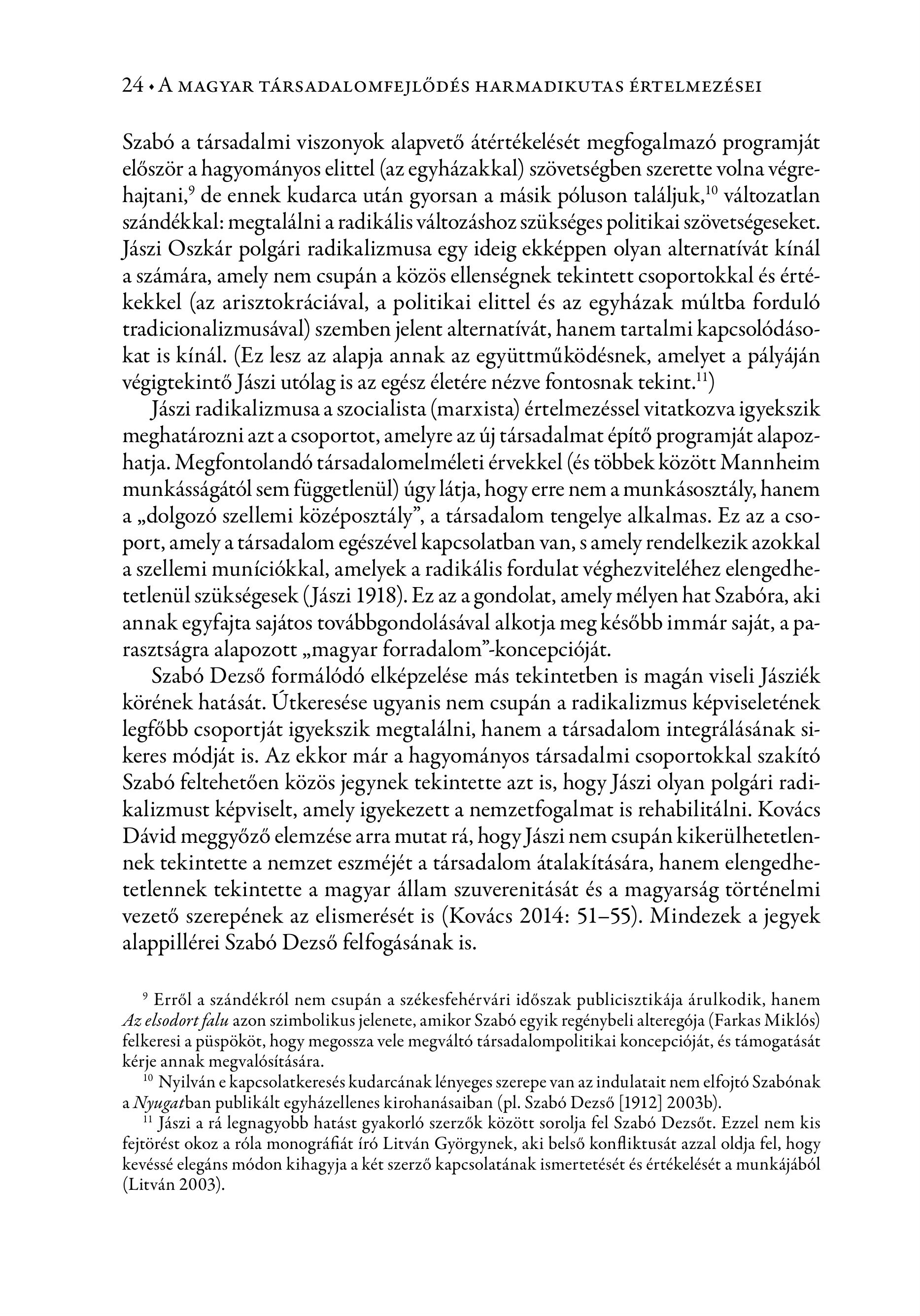 24 +A MAGYAR TARSADALOMFEJLODES HARMADIKUTAS ERTELMEZESEI Szabó a társadalmi viszonyok alapvető átértékelését megfogalmazó programját először ahagyományos elittel (az egyházakkal) szövetségben szerette volna végrehajtani," de ennek kudarca után gyorsan a másik póluson találjuk, " változatlan szándékkal: megtalálni a radikális változáshoz szükséges politikai szövetségeseket. Jászi Oszkár polgári radikalizmusa egy ideig ekképpen olyan alternatívát kínál a számára, amely nem csupán a közös ellenségnek tekintett csoportokkal és értékekkel (az arisztokráciával, a politikai elittel és az egyházak múltba forduló tradicionalizmusával) szemben jelent alternatívát, hanem tartalmi kapcsolódásokat is kínál. (Ez lesz az alapja annak az együttműködésnek, amelyet a pályáján végigtekintő Jászi utólag is az egész életére nézve fontosnak tekint.") Jászi radikalizmusa a szocialista (marxista) értelmezéssel vitatkozva igyekszik meghatározni azt a csoportot, amelyre az új társadalmat építő programját alapozhatja. Megfontolandó társadalomelméleti érvekkel (és többek között Mannheim munkásságától sem függetlenül) úgy látja, hogy erre nem a munkásosztály, hanem a , dolgozó szellemi középosztály", a társadalom tengelye alkalmas. Ez az a csoport, amely a társadalom egészével kapcsolatban van, s amely rendelkezik azokkal a szellemi muníciókkal, amelyek a radikális fordulat véghezviteléhez elengedhetetlenül szükségesek (Jászi 1918). Ez az agondolat, amely mélyen hat Szabóra, aki annak egyfajta sajátos továbbgondolásával alkotja meg később immár saját, a parasztságra alapozott , magyar forradalom" -koncepcióját. Szabó Dezső formálódó elképzelése más tekintetben is magán viseli Jásziék körének hatását. Útkeresése ugyanis nem csupán a radikalizmus képviseletének legfőbb csoportját igyekszik megtalálni, hanem a társadalom integrálásának sikeres módját is. Az ekkor már a hagyományos társadalmi csoportokkal szakító Szabó feltehetően közös jegynek tekintette azt is, hogy Jászi olyan polgári radikalizmust képviselt, amely igyekezett a nemzetfogalmat is rehabilitálni. Kovács Dávid meggyőző elemzése arra mutat rá, hogy Jászi nem csupán kikerülhetetlennek tekintette a nemzet eszméjét a társadalom átalakítására, hanem elengedhetetlennek tekintette a magyar állam szuverenitását és a magyarság történelmi vezető szerepének az elismerését is (Kovacs 2014: 51-55). Mindezek a jegyek alappillérei Szabó Dezső felfogásának is. ? Erről a szándékról nem csupán a székesfehérvári időszak publicisztikája árulkodik, hanem Az elsodort falu azon szimbolikus jelenete, amikor Szabó egyik regénybeli alteregója (Farkas Miklós) felkeresi a püspököt, hogy megossza vele megváltó társadalompolitikai koncepcióját, és támogatását kérje annak megvalósítására. 10 Nyilván e kapcsolatkeresés kudarcának lényeges szerepe van az indulatait nem elfojtó Szabónak a Nyugatban publikált egyházellenes kirohanásaiban (pl. Szabó Dezső [1912] 2003b). " Jászi a rá legnagyobb hatást gyakorló szerzők között sorolja fel Szabó Dezsőt. Ezzel nem kis fejtörést okoz a róla monográfiát író Litván Györgynek, aki belső konfliktusát azzal oldja fel, hogy kevéssé elegáns módon kihagyja a két szerző kapcsolatának ismertetését és értékelését a munkájából (Litván 2003).