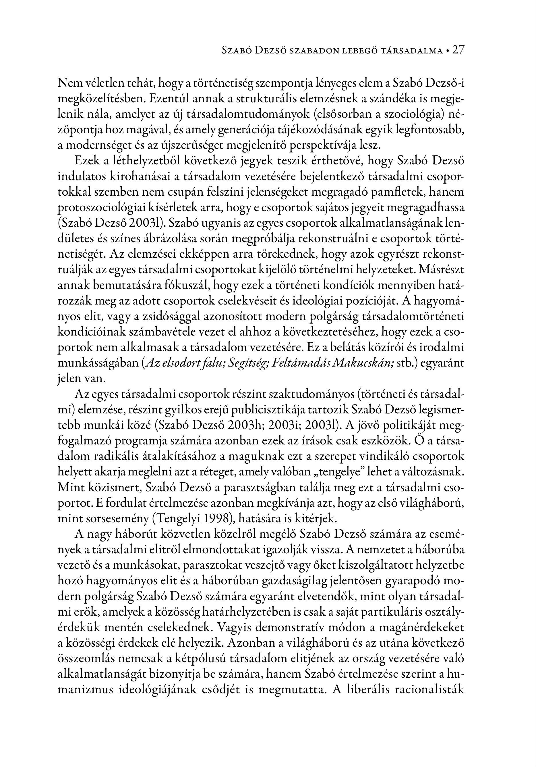 SZABÓ DEZSŐ SZABADON LEBEGŐ TÁRSADALMA " 27 Nem véletlen tehát, hogy a történetiség szempontja lényeges elem a Szabó Dezső-i megközelítésben. Ezentúl annak a strukturális elemzésnek a szándéka is megjelenik nála, amelyet az új társadalomtudományok (elsősorban a szociológia) nézőpontja hoz magával, és amely generációja tájékozódásának egyik legfontosabb, a modernséget és az újszerűséget megjelenítő perspektívája lesz. Ezek a léthelyzetből következő jegyek teszik érthetővé, hogy Szabó Dezső indulatos kirohanásai a társadalom vezetésére bejelentkező társadalmi csoportokkal szemben nem csupán felszíni jelenségeket megragadó pamfletek, hanem protoszociológiai kísérletek arra, hogy e csoportok sajátos jegyeit megragadhassa (Szabó Dezső 2003]). Szabó ugyanis az egyes csoportok alkalmatlanságának lendületes és színes ábrázolása során megpróbálja rekonstruálni e csoportok történetiségét. Az elemzései ekképpen arra törekednek, hogy azok egyrészt rekonstruálják az egyes társadalmi csoportokat kijelölő történelmi helyzeteket. Másrészt annak bemutatására fókuszál, hogy ezek a történeti kondíciók mennyiben határozzák meg az adott csoportok cselekvéseit és ideológiai pozícióját. A hagyományos elit, vagy a zsidósággal azonosított modern polgárság társadalomtörténeti kondícióinak számbavétele vezet el ahhoz a következtetéséhez, hogy ezek a csoportok nem alkalmasak a társadalom vezetésére. Ez a belátás közírói és irodalmi munkásságában ( Az elsodort falu; Segítség; Feltámadás Makucskán; stb.) egyaránt jelen van. Az egyes társadalmi csoportok részint szaktudományos (történeti és társadalmi) elemzése, részint gyilkos erejű publicisztikája tartozik Szabó Dezső legismertebb munkái közé (Szabó Dezső 2003h; 2003i; 2003]). A jövő politikáját megfogalmazó programja számára azonban ezek az írások csak eszközök. Ő a társadalom radikális átalakításához a maguknak ezt a szerepet vindikáló csoportok helyett akarja meglelni azt a réteget, amely valóban , tengelye" lehet a változásnak. Mint közismert, Szabó Dezső a parasztságban találja meg ezt a társadalmi csoportot. E fordulat értelmezése azonban megkívánja azt, hogy az első világháború, mint sorsesemény ( Tengelyi 1998), hatására is kitérjek. A nagy háborút közvetlen közelről megélő Szabó Dezső számára az események a társadalmi elitről elmondottakat igazolják vissza. A nemzetet a háborúba vezető és a munkásokat, parasztokat veszejtő vagy őket kiszolgáltatott helyzetbe hozó hagyományos elit és a háborúban gazdaságilag jelentősen gyarapodó modern polgárság Szabó Dezső számára egyaránt elvetendők, mint olyan társadalmi erők, amelyek a közösség határhelyzetében is csak a saját partikuláris osztályérdekük mentén cselekednek. Vagyis demonstratív módon a magánérdekeket a közösségi érdekek elé helyezik. Azonban a világháború és az utána következő összeomlás nemcsak a kétpólusú társadalom elitjének az ország vezetésére való alkalmatlanságát bizonyítja be számára, hanem Szabó értelmezése szerint a humanizmus ideológiájának csődjét is megmutatta. A liberális racionalisták