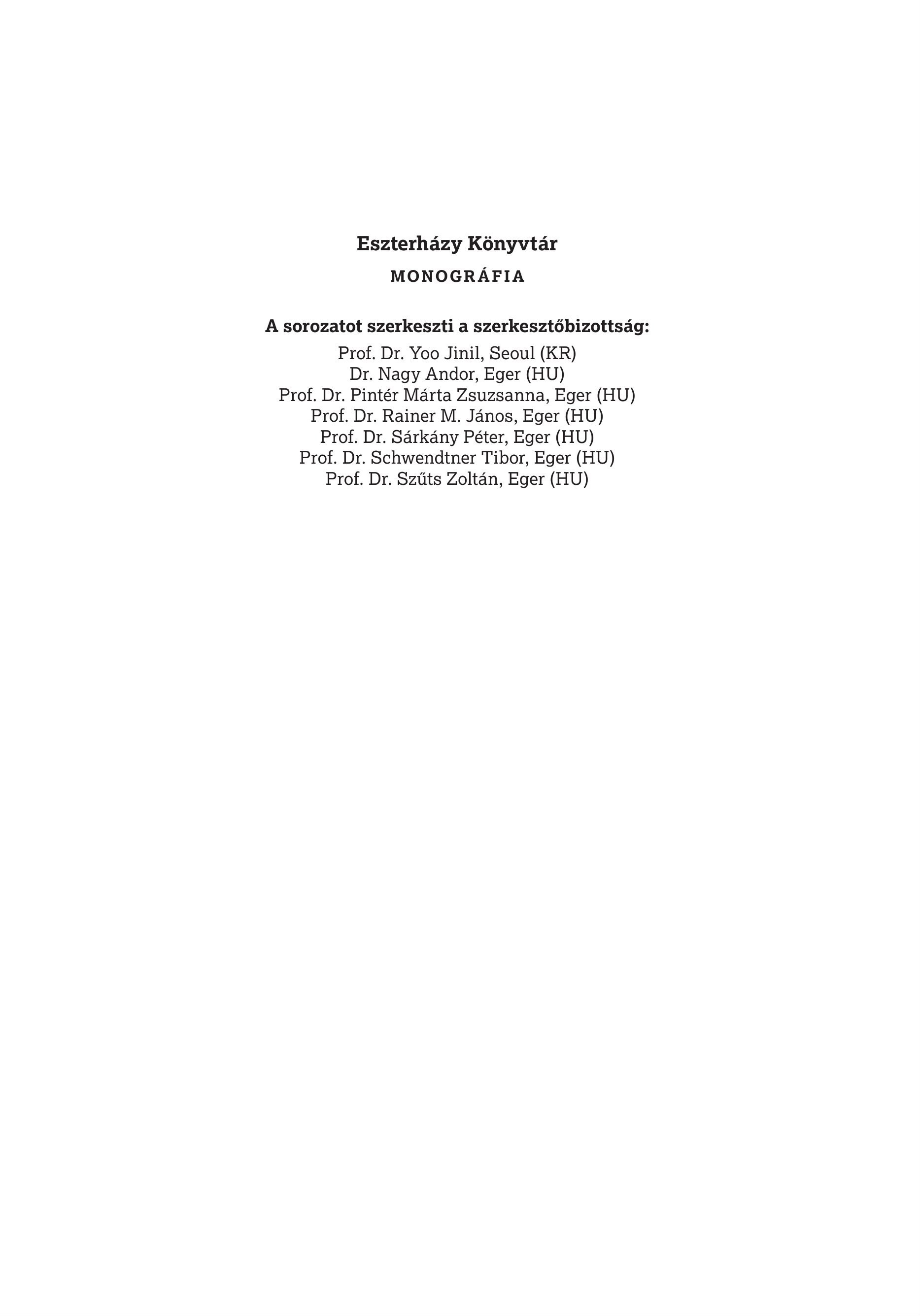Eszterházy Könyvtár MONOGRÁFIA A sorozatot szerkeszti a szerkesztőbizottság: Prof. Dr. Yoo Jinil, Seoul (KR) Dr. Nagy Andor, Eger (HU) Prof. Dr. Pintér Márta Zsuzsanna, Eger (HU) Prof. Dr. Rainer M. János, Eger (HU) Prof. Dr. Sárkány Péter, Eger (HU) Prof. Dr. Schwendtner Tibor, Eger (HU) Prof. Dr. Szűts Zoltán, Eger (HU)