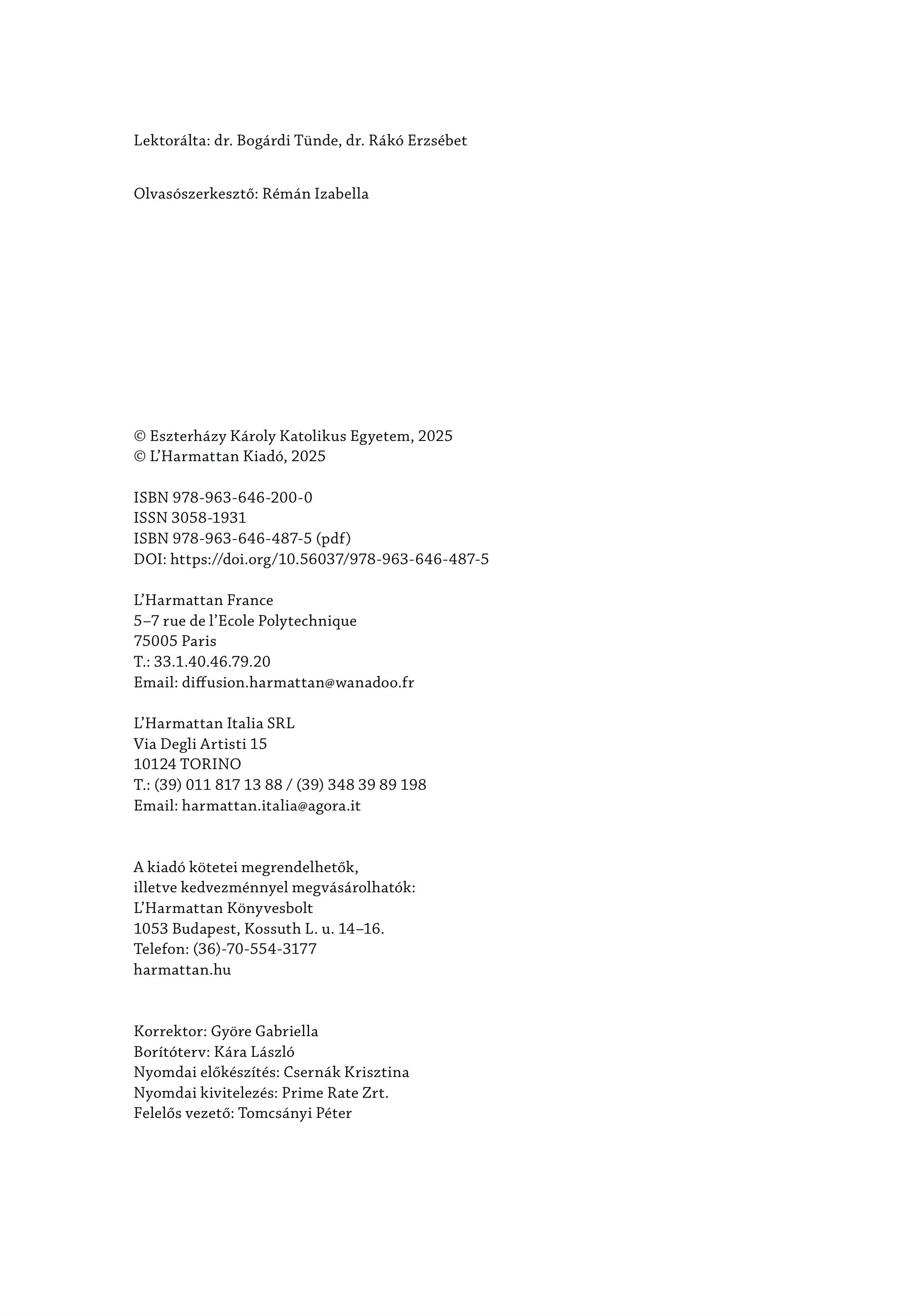 Lektorálta: dr. Bogárdi Tünde, dr. Rákó Erzsébet Olvasószerkesztő: Rémán Izabella 0 Eszterházy Károly Katolikus Egyetem, 2025 © LHarmattan Kiad6, 2025 ISBN 978-963-646-200-0 ISSN 3058-1931 ISBN 978-963-646-487-5 (pdf) DOI: https://doi.org/10.56037/978-963-646-487-5 L'Harmattan France 5-7 rue de l’Ecole Polytechnique 75005 Paris T.: 33.1.40.46.79.20 Email: diffusion.harmattan@wanadoo.fr L'Harmattan Italia SRL Via Degli Artisti 15 10124 TORINO T.: (39) 011 817 13 88 / (39) 348 39 89 198 Email: harmattan.italia@agora.it A kiadó kötetei megrendelhetők, illetve kedvezménnyel megvásárolhatók: LHarmattan Könyvesbolt 1053 Budapest, Kossuth L. u. 14-16. Telefon: (36)-70-554-3177 harmattan.hu Korrektor: Györe Gabriella Borítóterv: Kára László Nyomdai előkészítés: Csernák Krisztina Nyomdai kivitelezés: Prime Rate Zrt. Felelős vezető: Tomcsányi Péter