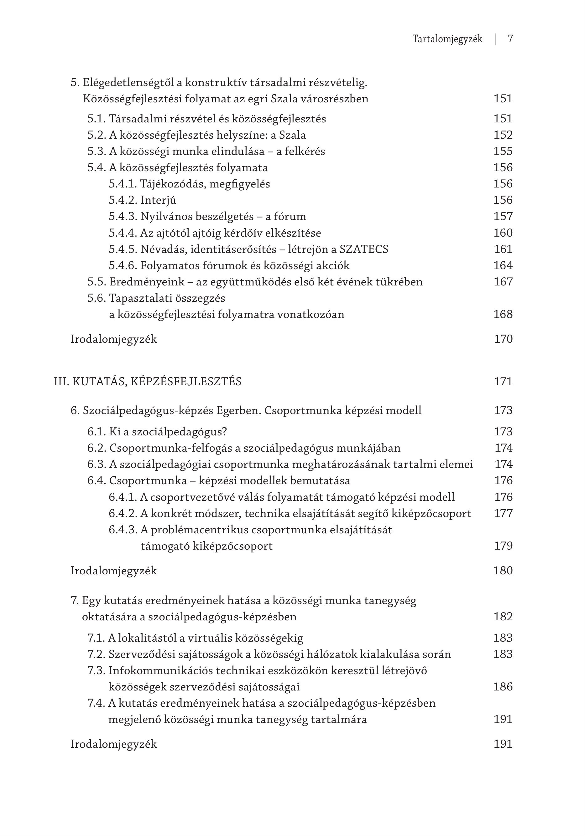 Tartalomjegyzék | 7 5. Elegedetlensegtöl a konstruktiv társadalmi részvételig. Közössegfejlesztesi folyamat az egri Szala värosreszben 151 5.1. Társadalmi részvétel és közösségfejlesztés 151 5.2. A közösségfejlesztés helyszíne: a Szala 152 5.3. A közösségi munka elindulása - a felkérés 155 5.4. A közösségfejlesztés folyamata 156 5.4.1. Tájékozódás, megfigyelés 156 5.4.2. Interjú 156 5.4.3. Nyilvános beszélgetés - a fórum 157 5.4.4. Az ajtótól ajtóig kérdőív elkészítése 160 5.4.5. Névadás, identitáserősítés - létrejön a SZATECS 161 5.4.6. Folyamatos fórumok és közösségi akciók 164 5.5. Eredményeink - az együttműködés első két évének tükrében 167 5.6. Tapasztalati összegzés a közösségfejlesztési folyamatra vonatkozóan 168 Irodalomjegyzék 170 III. KUTATÁS, KÉPZÉSFEJLESZTÉS 171 6. Szociälpedagögus-kepzes Egerben. Csoportmunka kepzesi modell 173 6.1. Kia szociälpedagögus? 173 6.2. Csoportmunka-felfogäs a szociälpedagögus munkäjäban 174 6.3. A szociälpedagögiai csoportmunka meghatärozäsänak tartalmielemei 174 6.4. Csoportmunka - k&pzesi modellek bemutatása 176 6.4.1. A csoportvezetöve väläs folyamatät támogató képzési modell 176 6.4.2. A konkret mödszer, technika elsajátítását segítő kiképzőcsoport 177 6.4.3. A problemacentrikus csoportmunka elsajätitäsät támogató kiképzőcsoport 179 Irodalomjegyzék 180 7. Egy kutatás eredményeinek hatása a közösségi munka tanegység oktatására a szociálbpedagógus-képzésben 182 7.1. A lokalitástól a virtuális közösségekig 183 7.2. Szerveződési sajátosságok a közösségi hálózatok kialakulása során 183 7.3. Infokommunikációs technikai eszközökön keresztül létrejövő közösségek szerveződési sajátosságai 186 7.4. A kutatäs eredmenyeinek hatäsa a szociälpedagögus-kepzesben megjelenő közösségi munka tanegység tartalmára 191 Irodalomjegyzék 191