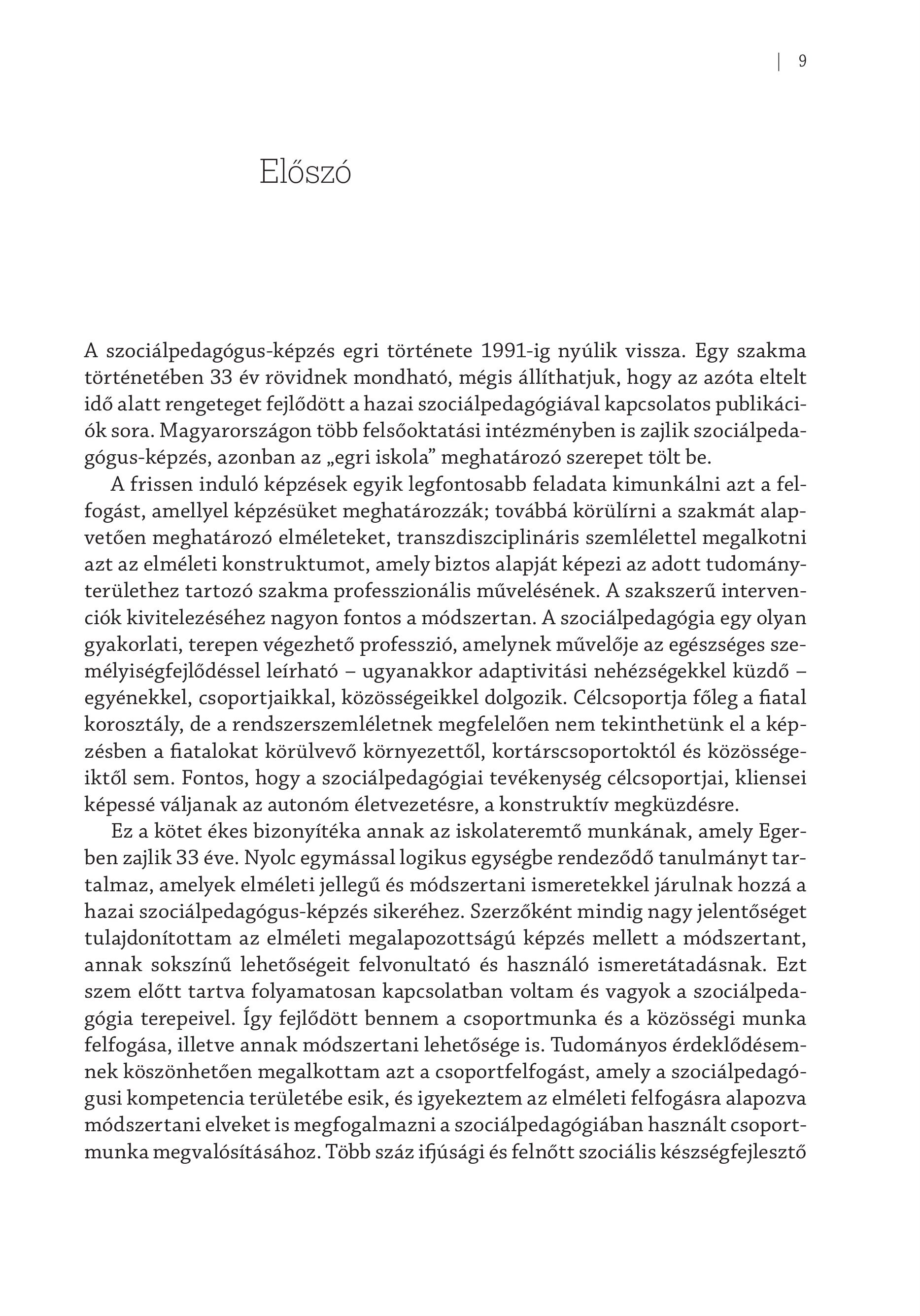 Előszó A szociálpedagógus-képzés egri története 1991-ig nyúlik vissza. Egy szakma történetében 33 év rövidnek mondható, mégis állíthatjuk, hogy az azóta eltelt idő alatt rengeteget fejlődött a hazai szociálpedagógiával kapcsolatos publikációk sora. Magyarországon több felsőoktatási intézményben is zajlik szociálpedagógus-képzés, azonban az , egri iskola" meghatározó szerepet tölt be. A frissen induló képzések egyik legfontosabb feladata kimunkálni azt a felfogást, amellyel képzésüket meghatározzák; továbbá körülírni a szakmát alapvetően meghatározó elméleteket, transzdiszciplináris szemlélettel megalkotni azt az elméleti konstruktumot, amely biztos alapját képezi az adott tudományterülethez tartozó szakma professzionális művelésének. A szakszerű intervenciók kivitelezéséhez nagyon fontos a módszertan. A szociálpedagógia egy olyan gyakorlati, terepen végezhető professzió, amelynek művelője az egészséges szemelyisegfejlödessel leirhatö - ugyanakkor adaptivitási nehézségekkel küzdő — egyénekkel, csoportjaikkal, közösségeikkel dolgozik. Célcsoportja főleg a fiatal korosztály, de a rendszerszemléletnek megfelelően nem tekinthetünk el a képzésben a fiatalokat körülvevő környezettől, kortárscsoportoktól és közösségeiktől sem. Fontos, hogy a szociálpedagógiai tevékenység célcsoportjai, kliensei képessé váljanak az autonóm életvezetésre, a konstruktív megküzdésre. Ez a kötet ékes bizonyítéka annak az iskolateremtő munkának, amely Egerben zajlik 33 éve. Nyolc egymással logikus egységbe rendeződő tanulmányt tartalmaz, amelyek elméleti jellegű és módszertani ismeretekkel járulnak hozzá a hazai szociálbpedagógus-képzés sikeréhez. Szerzőként mindig nagy jelentőséget tulajdonítottam az elméleti megalapozottságú képzés mellett a módszertant, annak sokszínű lehetőségeit felvonultató és használó ismeretátadásnak. Ezt szem előtt tartva folyamatosan kapcsolatban voltam és vagyok a szociálpedagógia terepeivel. Így fejlődött bennem a csoportmunka és a közösségi munka felfogása, illetve annak módszertani lehetősége is. Tudományos érdeklődésemnek köszönhetően megalkottam azt a csoportfelfogást, amely a szociálpedagógusi kompetencia területébe esik, és igyekeztem az elméleti felfogásra alapozva módszertani elveket is megfogalmazni a szociálpedagógiában használt csoportmunka megvalósításához. Több száz ifjúsági és felnőtt szociális készségfejlesztő