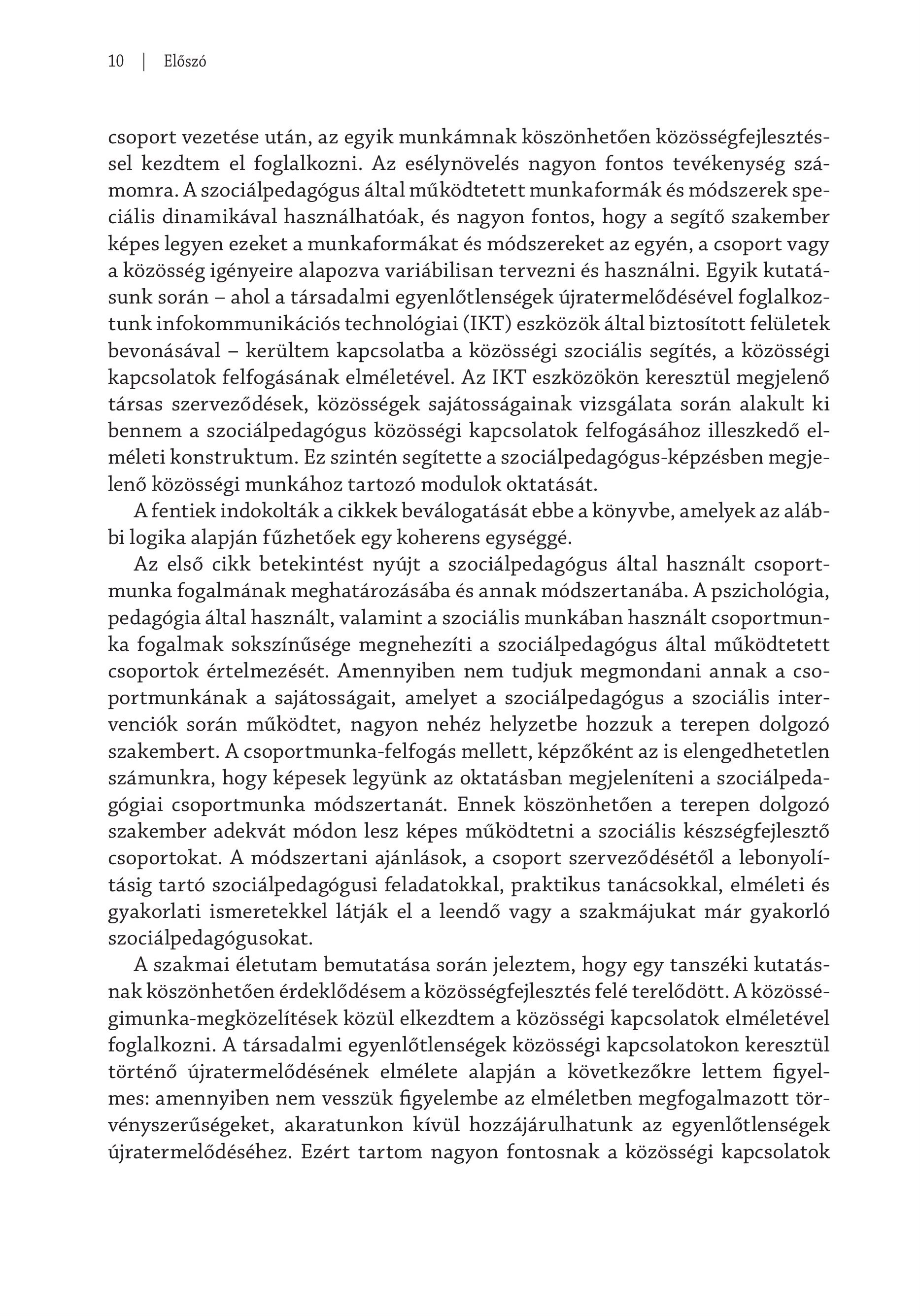 10 ] Előszó csoport vezetése után, az egyik munkámnak köszönhetően közösségfejlesztéssel kezdtem el foglalkozni. Az esélynövelés nagyon fontos tevékenység számomra. A szociálpedagógus által működtetett munkaformák és módszerek speciális dinamikával használhatóak, és nagyon fontos, hogy a segítő szakember képes legyen ezeket a munkaformákat és módszereket az egyén, a csoport vagy a közösség igényeire alapozva variábilisan tervezni és használni. Egyik kutatásunk során - ahol a társadalmi egyenlőtlenségek újratermelődésével foglalkoztunk infoakommunikációs technológiai (IKT) eszközök által biztosított felületek bevonásával - kerültem kapcsolatba a közösségi szociális segítés, a közösségi kapcsolatok felfogásának elméletével. Az IKT eszközökön keresztül megjelenő társas szerveződések, közösségek sajátosságainak vizsgálata során alakult ki bennem a szociálpedagógus közösségi kapcsolatok felfogásához illeszkedő elméleti konstruktum. Ez szintén segitette a szociälpedagögus-kepzesben megjelenő közösségi munkához tartozó modulok oktatását. A fentiek indokolták a cikkek beválogatását ebbe a könyvbe, amelyek az alábbi logika alapján fűzhetőek egy koherens egységgé. Az első cikk betekintést nyújt a szociálpedagógus által használt csoportmunka fogalmának meghatározásába és annak módszertanába. A pszichológia, pedagógia által használt, valamint a szociális munkában használt csoportmunka fogalmak sokszínűsége megnehezíti a szociálpedagógus által működtetett csoportok értelmezését. Amennyiben nem tudjuk megmondani annak a csoportmunkának a sajátosságait, amelyet a szociálpedagógus a szociális intervenciók során működtet, nagyon nehéz helyzetbe hozzuk a terepen dolgozó szakembert. A csoportmunka-felfogás mellett, képzőként az is elengedhetetlen számunkra, hogy képesek legyünk az oktatásban megjeleníteni a szociálpedagógiai csoportmunka módszertanát. Ennek köszönhetően a terepen dolgozó szakember adekvát módon lesz képes működtetni a szociális készségfejlesztő csoportokat. A módszertani ajánlások, a csoport szervezédésétél a lebonyolitásig tartó szociálpedagógusi feladatokkal, praktikus tanácsokkal, elméleti és gyakorlati ismeretekkel látják el a leendő vagy a szakmájukat már gyakorló szociälpedagögusokat. A szakmai életutam bemutatása során jeleztem, hogy egy tanszéki kutatásnak köszönhetően érdeklődésem a közösségfejlesztés felé terelődött. A közösségimunka-megközelítések közül elkezdtem a közösségi kapcsolatok elméletével foglalkozni. A társadalmi egyenlőtlenségek közösségi kapcsolatokon keresztül történő újratermelődésének elmélete alapján a következőkre lettem figyelmes: amennyiben nem vesszük figyelembe az elméletben megfogalmazott törvényszerűségeket, akaratunkon kívül hozzájárulhatunk az egyenlőtlenségek újratermelődéséhez. Ezért tartom nagyon fontosnak a közösségi kapcsolatok
