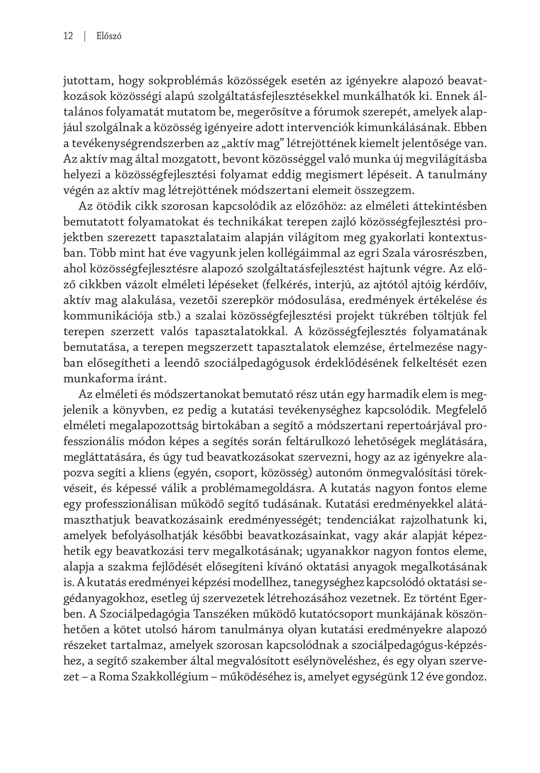 12 ] Előszó jutottam, hogy sokproblémás közösségek esetén az igényekre alapozó beavatkozások közösségi alapú szolgáltatásfejlesztésekkel munkálhatók ki. Ennek általános folyamatát mutatom be, megerősítve a fórumok szerepét, amelyek alapjául szolgálnak a közösség igényeire adott intervenciók kimunkálásának. Ebben a tevékenységrendszerben az , aktív mag" létrejöttének kiemelt jelentősége van. Az aktív mag által mozgatott, bevont közösséggel való munka új megvilágításba helyezi a közösségfejlesztési folyamat eddig megismert lépéseit. A tanulmány végén az aktív mag létrejöttének módszertani elemeit összegzem. Az ötödik cikk szorosan kapcsolódik az előzőhöz: az elméleti áttekintésben bemutatott folyamatokat és technikákat terepen zajló közösségfejlesztési projektben szerezett tapasztalataim alapján világítom meg gyakorlati kontextusban. Több mint hat éve vagyunk jelen kollégáimmal az egri Szala városrészben, ahol közösségfejlesztésre alapozó szolgáltatásfejlesztést hajtunk végre. Az előző cikkben vázolt elméleti lépéseket (felkérés, interjú, az ajtótól ajtóig kérdőív, aktív mag alakulása, vezetői szerepkör módosulása, eredmények értékelése és kommunikációja stb.) a szalai közösségfejlesztési projekt tükrében töltjük fel terepen szerzett valós tapasztalatokkal. A közösségfejlesztés folyamatának bemutatása, a terepen megszerzett tapasztalatok elemzése, értelmezése nagyban elősegítheti a leendö szociälpedagögusok erdeklödesenek felkelteset ezen munkaforma iränt. Az elméleti és módszertanokat bemutató rész után egy harmadik elem is megjelenik a könyvben, ez pedig a kutatási tevékenységhez kapcsolódik. Megfelelő elméleti megalapozottság birtokában a segítő a módszertani repertoárjával professzionális módon képes a segítés során feltárulkozó lehetőségek meglátására, megláttatására, és úgy tud beavatkozásokat szervezni, hogy az az igényekre alapozva segíti a kliens (egyén, csoport, közösség) autonóm önmegvalósítási törekvéseit, és képessé válik a problémamegoldásra. A kutatás nagyon fontos eleme egy professzionálisan működő segítő tudásának. Kutatási eredményekkel alátámaszthatjuk beavatkozásaink eredményességét; tendenciákat rajzolhatunk ki, amelyek befolyásolhatják későbbi beavatkozásainkat, vagy akár alapját képezhetik egy beavatkozási terv megalkotásának; ugyanakkor nagyon fontos eleme, alapja a szakma fejlődését elősegíteni kívánó oktatási anyagok megalkotásának is. A kutatás eredményei képzési modellhez, tanegységhez kapcsolódó oktatási segédanyagokhoz, esetleg új szervezetek létrehozásához vezetnek. Ez történt Egerben. A Szociálpedagógia Tanszéken működő kutatócsoport munkájának köszönhetően a kötet utolsó három tanulmánya olyan kutatási eredményekre alapozó részeket tartalmaz, amelyek szorosan kapcsolódnak a szociálpedagógus-képzéshez, a segítő szakember által megvalósított esélynöveléshez, és egy olyan szervezet - a Roma Szakkollégium — működéséhez is, amelyet egységünk 12 éve gondoz.