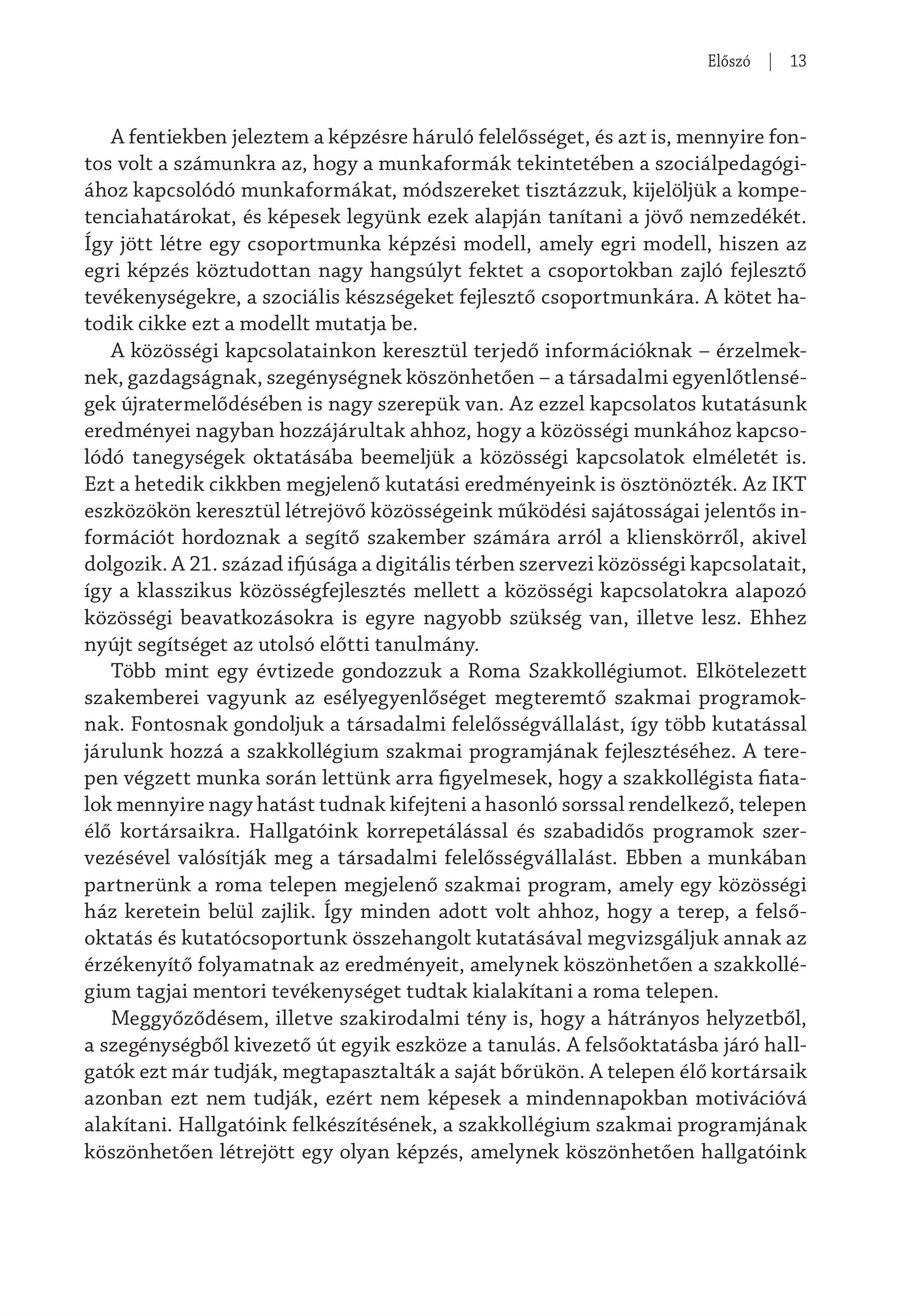Előszó ] 13 A fentiekben jeleztem a képzésre háruló felelősséget, és azt is, mennyire fontos volt a számunkra az, hogy a munkaformák tekintetében a szociálpedagógiához kapcsolódó munkaformákat, módszereket tisztázzuk, kijelöljük a kompetenciahatárokat, és képesek legyünk ezek alapján tanítani a jövő nemzedékét. Így jött létre egy csoportmunka képzési modell, amely egri modell, hiszen az egri képzés köztudottan nagy hangsúlyt fektet a csoportokban zajló fejlesztő tevékenységekre, a szociális készségeket fejlesztő csoportmunkára. A kötet hatodik cikke ezt a modellt mutatja be. A közösségi kapcsolatainkon keresztül terjedő információknak - érzelmeknek, gazdagságnak, szegénységnek köszönhetően - a társadalmi egyenlőtlenségek újratermelődésében is nagy szerepük van. Az ezzel kapcsolatos kutatásunk eredményei nagyban hozzájárultak ahhoz, hogy a közösségi munkához kapcsolódó tanegységek oktatásába beemeljük a közösségi kapcsolatok elméletét is. Ezt a hetedik cikkben megjelenő kutatási eredményeink is ösztönözték. Az IKT eszközökön keresztül létrejövő közösségeink működési sajátosságai jelentős információt hordoznak a segítő szakember számára arról a klienskörről, akivel dolgozik. A 21. század ifjúsága a digitális térben szervezi közösségi kapcsolatait, így a klasszikus közösségfejlesztés mellett a közösségi kapcsolatokra alapozó közösségi beavatkozásokra is egyre nagyobb szükség van, illetve lesz. Ehhez nyújt segítséget az utolsó előtti tanulmány. Több mint egy évtizede gondozzuk a Roma Szakkollégiumot. Elkötelezett szakemberei vagyunk az esélyegyenlőséget megteremtő szakmai programoknak. Fontosnak gondoljuk a társadalmi felelősségvállalást, így több kutatással járulunk hozzá a szakkollégium szakmai programjának fejlesztéséhez. A terepen végzett munka során lettünk arra figyelmesek, hogy a szakkollégista fiatalok mennyire nagy hatást tudnak kifejteni a hasonló sorssal rendelkező, telepen élő kortársaikra. Hallgatóink korrepetálással és szabadidős programok szervezésével valósítják meg a társadalmi felelősségvállalást. Ebben a munkában partnerünk a roma telepen megjelenő szakmai program, amely egy közösségi ház keretein belül zajlik. Így minden adott volt ahhoz, hogy a terep, a felsőoktatás és kutatócsoportunk összehangolt kutatásával megvizsgáljuk annak az érzékenyítő folyamatnak az eredményeit, amelynek köszönhetően a szakkollégium tagjai mentori tevékenységet tudtak kialakítani a roma telepen. Meggyőződésem, illetve szakirodalmi tény is, hogy a hátrányos helyzetből, a szegénységből kivezető út egyik eszköze a tanulás. A felsőoktatásba járó hallgatók ezt már tudják, megtapasztalták a saját bőrükön. A telepen élő kortársaik azonban ezt nem tudják, ezért nem képesek a mindennapokban motivációvá alakítani. Hallgatóink felkészítésének, a szakkollégium szakmai programjának köszönhetően létrejött egy olyan képzés, amelynek köszönhetően hallgatóink