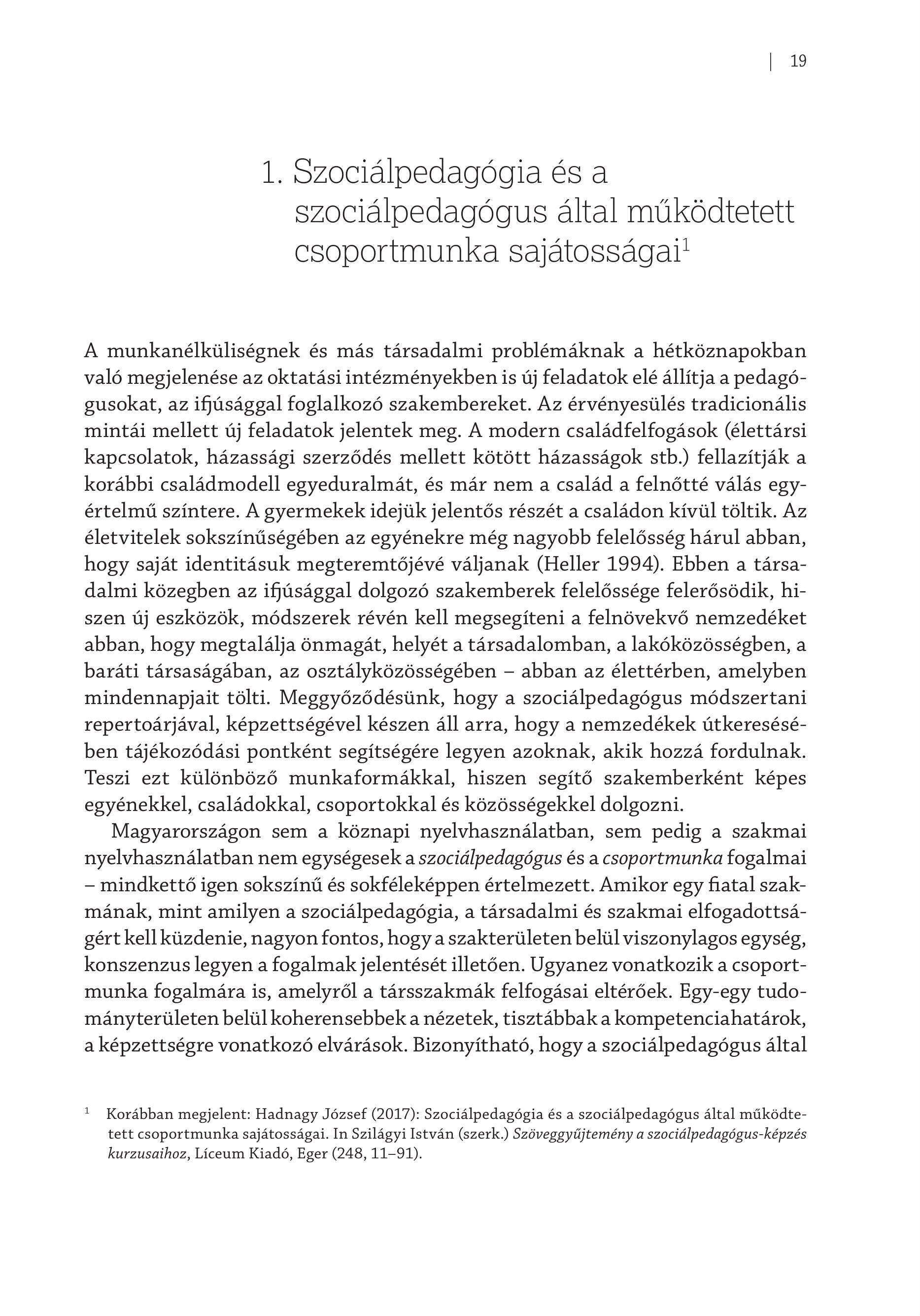 1. Szociálpedagógia és a szociálpedagógus által működtetett csoportmunka sajátosságai! A munkanélküliségnek és más társadalmi problémáknak a hétköznapokban való megjelenése az oktatási intézményekben is új feladatok elé állítja apedagógusokat, az ifjúsággal foglalkozó szakembereket. Az érvényesülés tradicionális mintái mellett új feladatok jelentek meg. A modern családfelfogások (élettársi kapcsolatok, házassági szerződés mellett kötött házasságok stb.) fellazítják a korábbi családmodell egyeduralmát, és már nem a család a felnőtté válás egyértelmű színtere. A gyermekek idejük jelentős részét a családon kívül töltik. Az életvitelek sokszínűségében az egyénekre még nagyobb felelősség hárul abban, hogy saját identitásuk megteremtőjévé váljanak (Heller 1994). Ebben a társadalmi közegben az ifjúsággal dolgozó szakemberek felelőssége felerősödik, hiszen új eszközök, módszerek révén kell megsegíteni a felnövekvő nemzedéket abban, hogy megtalálja önmagát, helyét a társadalomban, a lakóközösségben, a baráti társaságában, az osztályközösségében - abban az élettérben, amelyben mindennapjait tölti. Meggyőződésünk, hogy a szociálpedagógus módszertani repertoárjával, képzettségével készen áll arra, hogy a nemzedékek útkeresésében tájékozódási pontként segítségére legyen azoknak, akik hozzá fordulnak. Teszi ezt különböző munkaformákkal, hiszen segítő szakemberként képes egyénekkel, családokkal, csoportokkal és közösségekkel dolgozni. Magyarországon sem a köznapi nyelvhasználatban, sem pedig a szakmai nyelvhasználatban nem egységesek a szociálpedagógus és a csoportmunka fogalmai — mindkettő igen sokszínű és sokféleképpen értelmezett. Amikor egy fiatal szakmának, mint amilyen a szociálpedagógia, a társadalmi és szakmai elfogadottságért kell küzdenie, nagyon fontos, hogy a szakterületen belül viszonylagos egység, konszenzus legyen a fogalmak jelentését illetően. Ugyanez vonatkozik a csoportmunka fogalmára is, amelyről a társszakmák felfogásai eltérőek. Egy-egy tudományterületen belül koherensebbek a nézetek, tisztábbak a kompetenciahatárok, a képzettségre vonatkozó elvárások. Bizonyítható, hogy a szociálpedagógus által ! Korábban megjelent: Hadnagy József (2017): Szociálpedagógia és a szociálpedagógus által müködtetett csoportmunka sajátosságai. In Szilágyi István (szerk.) Szöveggyűjtemény a szociálpedagógus-képzés kurzusaihoz, Líceum Kiadó, Eger (248, 11-91).