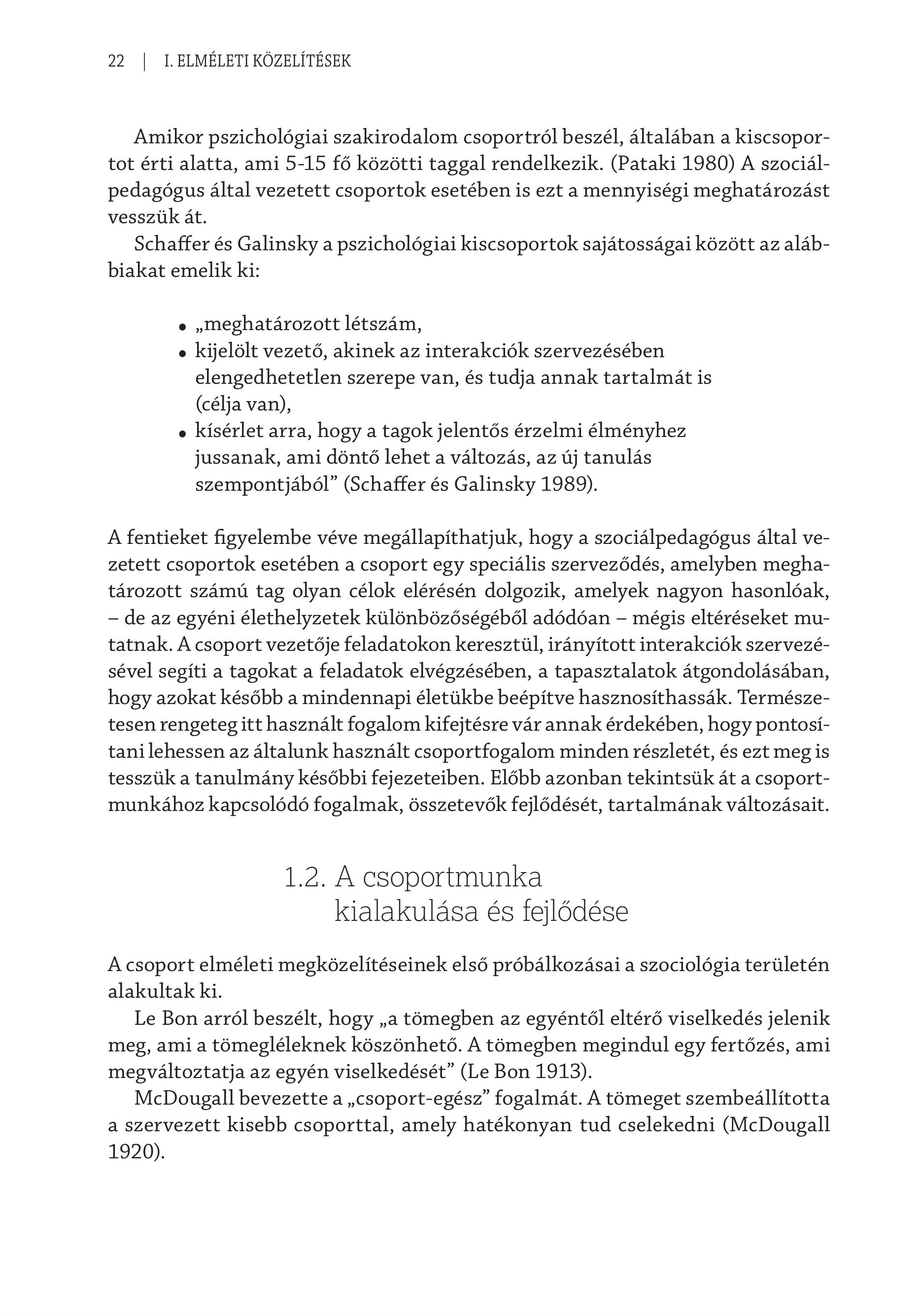 22 | I. ELMÉLETI KÔZELÎTÉSEK Amikor pszichológiai szakirodalom csoportról beszél, általában a kiscsoportot érti alatta, ami 5-15 fő közötti taggal rendelkezik. (Pataki 1980) A szociálpedagógus által vezetett csoportok esetében is ezt a mennyiségi meghatározást vesszük át. Schaffer és Galinsky a pszichológiai kiscsoportok sajátosságai között az alábbiakat emelik ki: e , meghatározott létszám, e kijelölt vezető, akinek az interakciók szervezésében elengedhetetlen szerepe van, és tudja annak tartalmát is (célja van), e kísérlet arra, hogy a tagok jelentős érzelmi élményhez jussanak, ami döntő lehet a változás, az új tanulás szempontjából" (Schaffer és Galinsky 1989). A fentieket figyelembe véve megállapíthatjuk, hogy a szociálpedagógus által vezetett csoportok esetében a csoport egy speciális szerveződés, amelyben meghatározott számú tag olyan célok elérésén dolgozik, amelyek nagyon hasonlóak, -— de az egyéni élethelyzetek különbözőségéből adódóan - mégis eltéréseket mutatnak. A csoport vezetője feladatokon keresztül, irányított interakciók szervezésével segíti a tagokat a feladatok elvégzésében, a tapasztalatok átgondolásában, hogy azokat később a mindennapi életükbe beépítve hasznosíthassák. Természetesen rengetegitt használt fogalom kifejtésre vár annak érdekében, hogy pontosítani lehessen az általunk használt csoportfogalom minden részletét, és eztmegis tesszük a tanulmány későbbi fejezeteiben. Előbb azonban tekintsük át a csoportmunkához kapcsolódó fogalmak, összetevők fejlődését, tartalmának változásait. 1.2. A csoportmunka kialakulása és fejlődése A csoport elméleti megközelítéseinek első próbálkozásai a szociológia területén alakultak ki. Le Bon arról beszélt, hogy ,a tömegben az egyéntől eltérő viselkedés jelenik meg, ami a tömegléleknek köszönhető. A tömegben megindul egy fertőzés, ami megváltoztatja az egyén viselkedését" (Le Bon 1913). McDougall bevezette a , csoport-egész" fogalmát. A tömeget szembeállította a szervezett kisebb csoporttal, amely hatékonyan tud cselekedni (McDougall 1920).