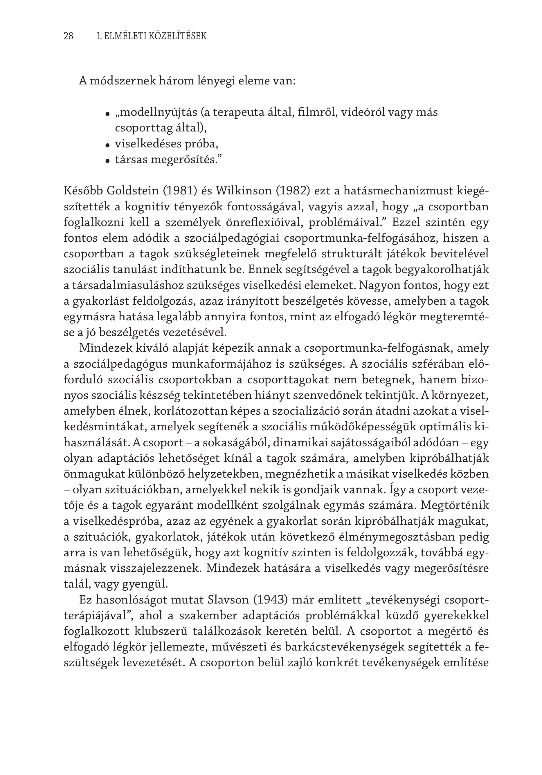 28 | I.ELMÉLETI KÖZELÍTÉSEK A módszernek három lényegi eleme van: e , modellnyújtás (a terapeuta által, filmről, videóról vagy más csoporttag ältal), e viselkedéses próba, e társas megerősítés." Később Goldstein (1981) és Wilkinson (1982) ezt a hatásmechanizmust kiegészítették a kognitív tényezők fontosságával, vagyis azzal, hogy ,a csoportban foglalkozni kell a személyek önreflexióival, problémáival." Ezzel szintén egy fontos elem adödik a szociälpedagögiai csoportmunka-felfogäsähoz, hiszen a csoportban a tagok szüksegleteinek megfelelö strukturält jätekok bevitelevel szociälis tanuläst indithatunk be. Ennek segitsegevel a tagok begyakorolhatjäk atärsadalmiasuläshoz szükseges viselkedesi elemeket. Nagyon fontos, hogy ezt a gyakorläst feldolgozäs, azaz iränyitott beszelgetes kövesse, amelyben a tagok egymásra hatása legalább annyira fontos, mint az elfogadó légkör megteremtése a jó beszélgetés vezetésével. Mindezek kiváló alapját képezik annak a csoportmunka-felfogásnak, amely a szociálpedagógus munkaformájához is szükséges. A szociális szférában elöforduló szociális csoportokban a csoporttagokat nem betegnek, hanem bizonyos szociális készség tekintetében hiányt szenvedőnek tekintjük. A környezet, amelyben élnek, korlátozottan képes a szocializáció során átadni azokat a viselkedésmintákat, amelyek segítenék a szociális működőképességük optimális kihasználását. A csoport - a sokaságából, dinamikai sajátosságaiból adódóan - egy olyan adaptációs lehetőséget kínál a tagok számára, amelyben kipróbálhatják önmagukat különböző helyzetekben, megnézhetik a másikat viselkedés közben - olyan szituációkban, amelyekkel nekik is gondjaik vannak. Így a csoport vezetője és a tagok egyaránt modellként szolgálnak egymás számára. Megtörténik a viselkedéspróba, azaz az egyének a gyakorlat során kipróbálhatják magukat, a szituációk, gyakorlatok, játékok után következő élménymegosztásban pedig arra is van lehetőségük, hogy azt kognitív szinten is feldolgozzák, továbbá egymásnak visszajelezzenek. Mindezek hatására a viselkedés vagy megerősítésre talál, vagy gyengül. Ez hasonlóságot mutat Slavson (1943) már említett , tevékenységi csoportterápiájával", ahol a szakember adaptációs problémákkal küzdő gyerekekkel foglalkozott klubszerű találkozások keretén belül. A csoportot a megértő és elfogadó légkör jellemezte, művészeti és barkácstevékenységek segítették a feszültségek levezetését. A csoporton belül zajló konkrét tevékenységek említése