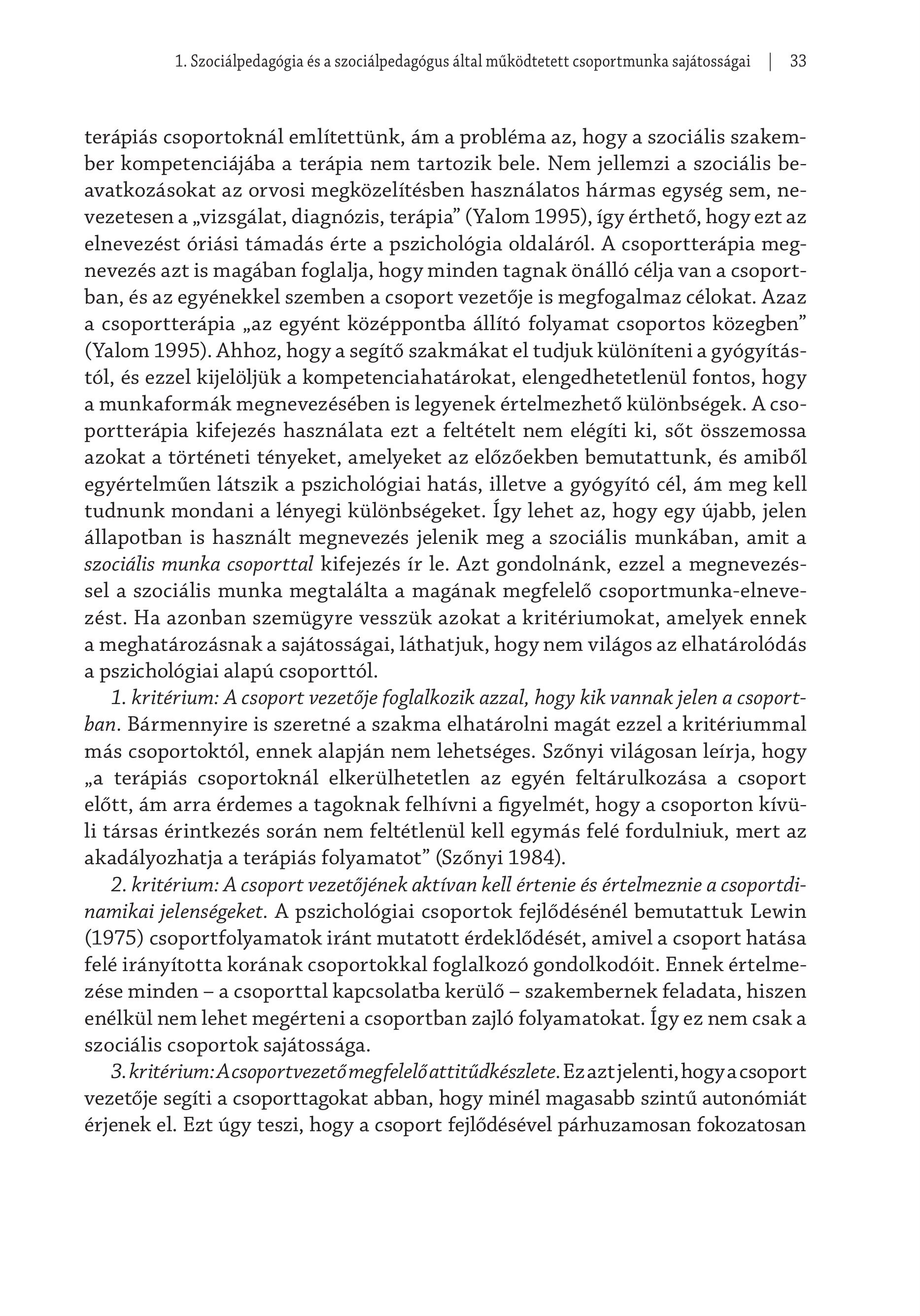 1. Szociálpedagógia és a szociálpedagógus által működtetett csoportmunka sajátosságai | 33 terápiás csoportoknál említettünk, ám a probléma az, hogy a szociális szakember kompetenciájába a terápia nem tartozik bele. Nem jellemzi a szociális beavatkozásokat az orvosi megközelítésben használatos hármas egység sem, nevezetesen a , vizsgálat, diagnózis, terápia" (Yalom 1995), így érthető, hogy ezt az elnevezést óriási támadás érte a pszichológia oldaláról. A csoportterápia megnevezés azt is magában foglalja, hogy minden tagnak önálló célja van a csoportban, és az egyénekkel szemben a csoport vezetője is megfogalmaz célokat. Azaz a csoportterápia ,az egyént középpontba állító folyamat csoportos közegben" (Yalom 1995). Ahhoz, hogy a segítő szakmákat el tudjuk különíteni a gyógyítástól, és ezzel kijelöljük a kompetenciahatárokat, elengedhetetlenül fontos, hogy a munkaformák megnevezésében is legyenek értelmezhető különbségek. A csoportterápia kifejezés használata ezt a feltételt nem elégíti ki, sőt összemossa azokat a történeti tényeket, amelyeket az előzőekben bemutattunk, és amiből egyértelműen látszik a pszichológiai hatás, illetve a gyógyító cél, ám meg kell tudnunk mondani a lényegi különbségeket. Így lehet az, hogy egy újabb, jelen állapotban is használt megnevezés jelenik meg a szociális munkában, amit a szociális munka csoporttal kifejezés ír le. Azt gondolnánk, ezzel a megnevezéssel a szociális munka megtalálta a magának megfelelő csoportmunka-elnevezést. Ha azonban szemügyre vesszük azokat a kritériumokat, amelyek ennek a meghatározásnak a sajátosságai, láthatjuk, hogy nem világos az elhatárolódás a pszichológiai alapú csoporttól. 1. kritérium: A csoport vezetője foglalkozik azzal, hogy kik vannak jelen a csoportban. Bármennyire is szeretné a szakma elhatárolni magát ezzel a kritériummal más csoportoktól, ennek alapján nem lehetséges. Szőnyi világosan leírja, hogy ,a terápiás csoportoknál elkerülhetetlen az egyén feltárulkozása a csoport előtt, ám arra érdemes a tagoknak felhívni a figyelmét, hogy a csoporton kívüli társas érintkezés során nem feltétlenül kell egymás felé fordulniuk, mert az akadályozhatja a terápiás folyamatot" (Szőnyi 1984). 2. kritérium: A csoport vezetőjének aktívan kell értenie és értelmeznie a csoportdinamikai jelenségeket. A pszichológiai csoportok fejlődésénél bemutattuk Lewin (1975) csoportfolyamatok iránt mutatott érdeklődését, amivel a csoport hatása felé irányította korának csoportokkal foglalkozó gondolkodóit. Ennek értelmezése minden - a csoporttal kapcsolatba kerülő - szakembernek feladata, hiszen enélkül nem lehet megérteni a csoportban zajló folyamatokat. Így ez nem csak a szociális csoportok sajátossága. 3. kritérium:A csoportvezeté megfelelé attittidkészlete. Ez aztjelenti, hogyacsoport vezetője segíti a csoporttagokat abban, hogy minél magasabb szintű autonómiát érjenek el. Ezt úgy teszi, hogy a csoport fejlődésével párhuzamosan fokozatosan