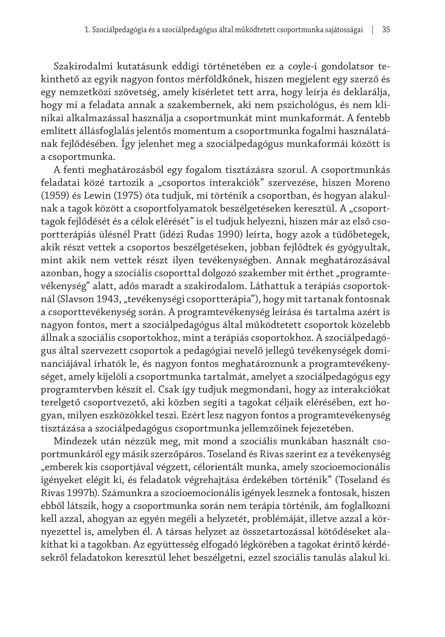 1. Szociálpedagógia és a szociálpedagógus által működtetett csoportmunka sajátosságai | 35 Szakirodalmi kutatásunk eddigi történetében ez a coyle-i gondolatsor tekinthető az egyik nagyon fontos mérföldkőnek, hiszen megjelent egy szerző és egy nemzetközi szövetség, amely kísérletet tett arra, hogy leírja és deklarálja, hogy mi a feladata annak a szakembernek, aki nem pszichológus, és nem klinikai alkalmazással használja a csoportmunkat mint munkaformat. A fentebb említett állásfoglalás jelentős momentum a csoportmunka fogalmi használatának fejlődésében. Így jelenhet meg a szociálpedagógus munkaformái között is a csoportmunka. A fenti meghatározásból egy fogalom tisztázásra szorul. A csoportmunkás feladatai közé tartozik a , csoportos interakciók" szervezése, hiszen Moreno (1959) és Lewin (1975) óta tudjuk, mi történik a csoportban, és hogyan alakulnak a tagok között a csoportfolyamatok beszélgetéseken keresztül. A , csoporttagok fejlődését és a célok elérését" is el tudjuk helyezni, hiszen már az első csoportterápiás ülésnél Pratt (idézi Rudas 1990) leírta, hogy azok a tüdőbetegek, akik részt vettek a csoportos beszélgetéseken, jobban fejlődtek és gyógyultak, mint akik nem vettek részt ilyen tevékenységben. Annak meghatározásával azonban, hogy a szociális csoporttal dolgozó szakember mit érthet , programtevékenység" alatt, adós maradt a szakirodalom. Láthattuk a terápiás csoportoknál (Slavson 1943, , tevékenységi csoportterápia"), hogy mit tartanak fontosnak a csoporttevékenység során. A programtevékenység leírása és tartalma azért is nagyon fontos, mert a szociálpedagógus által működtetett csoportok közelebb állnak a szociális csoportokhoz, mint a terápiás csoportokhoz. A szociálpedagógus által szervezett csoportok a pedagógiai nevelő jellegű tevékenységek dominanciájával írhatók le, és nagyon fontos meghatároznunk a programtevékenységet, amely kijelöli a csoportmunka tartalmát, amelyet a szociálpedagógus egy programtervben készít el. Csak így tudjuk megmondani, hogy az interakciókat terelgető csoportvezető, aki közben segíti a tagokat céljaik elérésében, ezt hogyan, milyen eszközökkel teszi. Ezért lesz nagyon fontos a programtevékenység tisztázása a szociálpedagógus csoportmunka jellemzőinek fejezetében. Mindezek után nézzük meg, mit mond a szociális munkában használt csoportmunkáról egy másik szerzőpáros. Toseland és Rivas szerint ez a tevékenység , emberek kis csoportjával végzett, célorientált munka, amely szocioemocionális igényeket elégít ki, és feladatok végrehajtása érdekében történik" (Toseland és Rivas 1997b). Számunkra a szocioemocionális igények lesznek a fontosak, hiszen ebből látszik, hogy a csoportmunka során nem terápia történik, ám foglalkozni kell azzal, ahogyan az egyén megéli a helyzetét, problémáját, illetve azzal a környezettel is, amelyben él. A társas helyzet az összetartozással kötődéseket alakíthat ki a tagokban. Az együttesség elfogadó légkörében a tagokat érintő kérdésekről feladatokon keresztül lehet beszélgetni, ezzel szociális tanulás alakul ki.