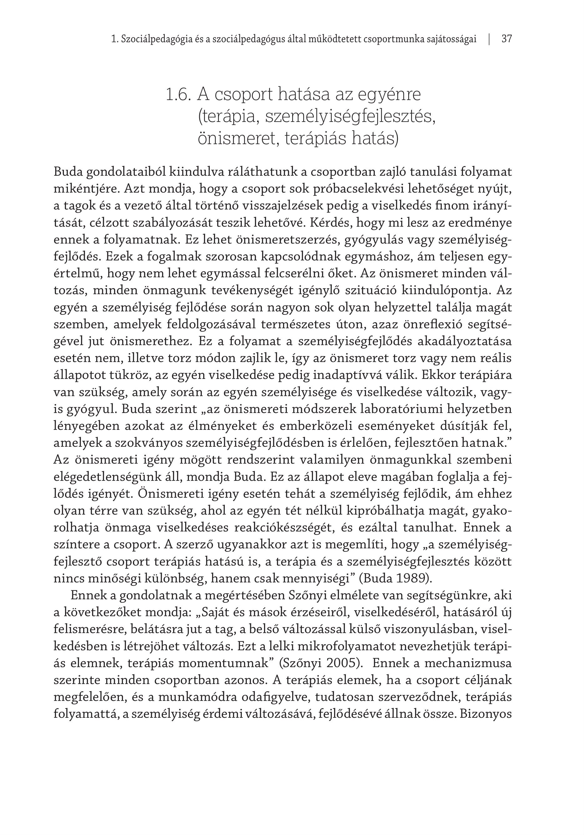 1. Szociálpedagógia és a szociálpedagógus által működtetett csoportmunka sajátosságai | 37 1.6. A csoport hatása az egyénre (terápia, személyiségfejlesztés, önismeret, terápiás hatás) Buda gondolataiból kiindulva ráláthatunk a csoportban zajló tanulási folyamat mikéntjére. Azt mondja, hogy a csoport sok próbacselekvési lehetőséget nyújt, a tagok és a vezető által történő visszajelzések pedig a viselkedés finom irányítását, célzott szabályozását teszik lehetővé. Kérdés, hogy mi lesz az eredménye ennek a folyamatnak. Ez lehet önismeretszerzés, gyógyulás vagy személyiségfejlődés. Ezek a fogalmak szorosan kapcsolódnak egymáshoz, ám teljesen egyértelmű, hogy nem lehet egymással felcserélni őket. Az önismeret minden változás, minden önmagunk tevékenységét igénylő szituáció kiindulópontja. Az egyén a személyiség fejlődése során nagyon sok olyan helyzettel találja magát szemben, amelyek feldolgozásával természetes úton, azaz önreflexió segítségével jut önismerethez. Ez a folyamat a személyiségfejlődés akadályoztatása esetén nem, illetve torz módon zajlik le, így az önismeret torz vagy nem reális állapotot tükröz, az egyén viselkedése pedig inadaptívvá válik. Ekkor terápiára van szükség, amely során az egyén személyisége és viselkedése változik, vagyis gyógyul. Buda szerint ,az önismereti módszerek laboratóriumi helyzetben lényegében azokat az élményeket és emberközeli eseményeket dúsítják fel, amelyek a szokványos személyiségfejlődésben is érlelően, fejlesztően hatnak." Az önismereti igény mögött rendszerint valamilyen önmagunkkal szembeni elégedetlenségünk áll, mondja Buda. Ez az állapot eleve magában foglalja a fejlődés igényét. Önismereti igény esetén tehát a személyiség fejlődik, ám ehhez olyan térre van szükség, ahol az egyén tét nélkül kipróbálhatja magát, gyakorolhatja önmaga viselkedéses reakciókészségét, és ezáltal tanulhat. Ennek a színtere a csoport. A szerző ugyanakkor azt is megemlíti, hogy ,a személyiségfejlesztő csoport terápiás hatású is, a terápia és a személyiségfejlesztés között nincs minőségi különbség, hanem csak mennyiségi" (Buda 1989). Ennek a gondolatnak a megértésében Szőnyi elmélete van segítségünkre, aki a következőket mondja: , Saját és mások érzéseiről, viselkedéséről, hatásáról új felismerésre, belátásra jut a tag, a belső változással külső viszonyulásban, viselkedésben is létrejöhet változás. Ezt a lelki mikrofolyamatot nevezhetjük terápiás elemnek, terápiás momentumnak" (Szőnyi 2005). Ennek a mechanizmusa szerinte minden csoportban azonos. A terápiás elemek, ha a csoport céljának megfelelően, és a munkamódra odafigyelve, tudatosan szerveződnek, terápiás folyamattá, a személyiség érdemi változásává, fejlődésévé állnak össze. Bizonyos