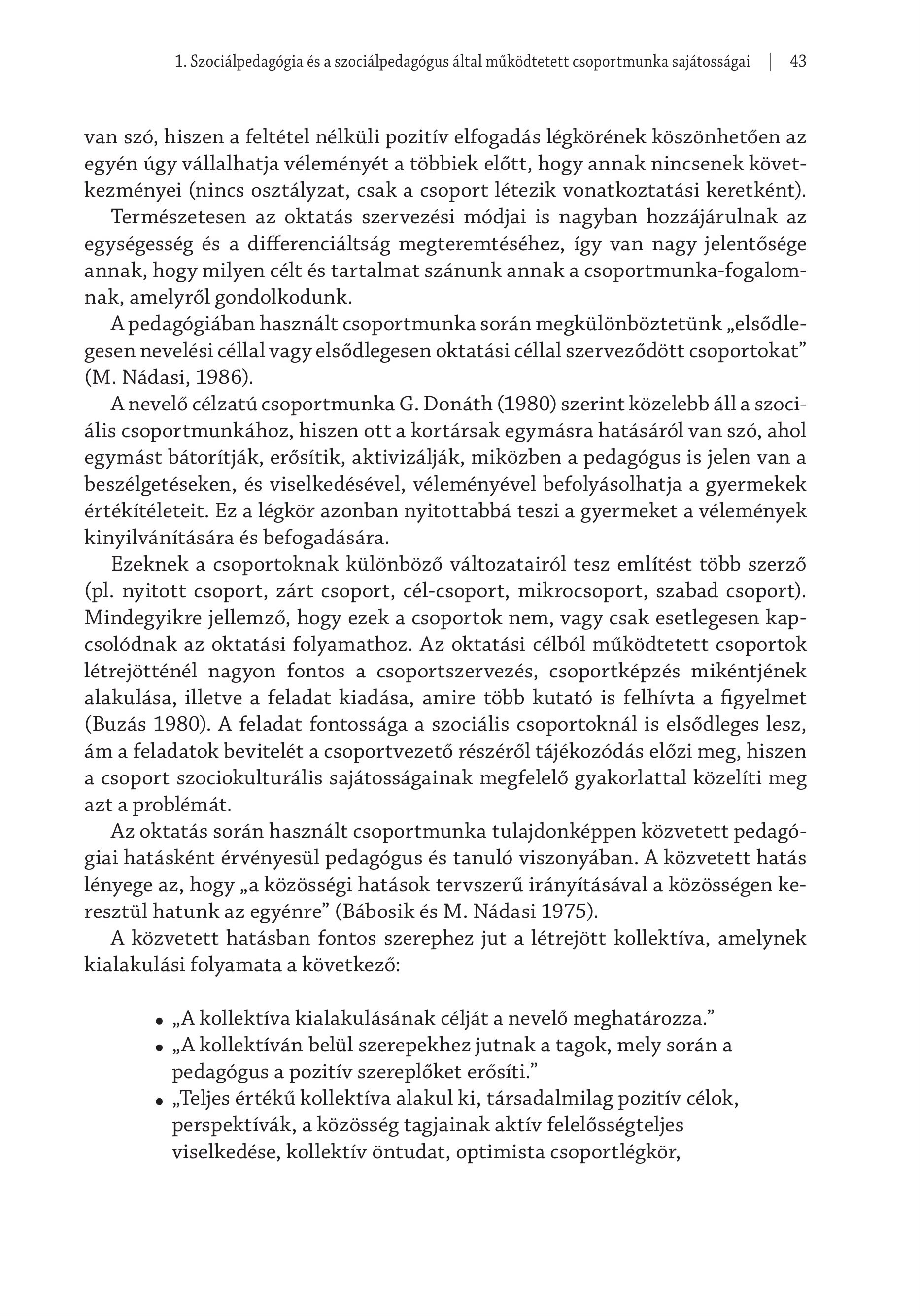 1. Szociálpedagógia és a szociálpedagógus által működtetett csoportmunka sajátosságai | 43 van szó, hiszen a feltétel nélküli pozitív elfogadás légkörének köszönhetően az egyén úgy vállalhatja véleményét a többiek előtt, hogy annak nincsenek következményei (nincs osztályzat, csak a csoport létezik vonatkoztatási keretként). Természetesen az oktatás szervezési módjai is nagyban hozzájárulnak az egységesség és a differenciáltság megteremtéséhez, így van nagy jelentősége annak, hogy milyen célt és tartalmat szánunk annak a csoportmunka-fogalomnak, amelyről gondolkodunk. A pedagógiában használt csoportmunka során megkülönböztetünk , elsődlegesen nevelési céllal vagy elsődlegesen oktatási céllal szerveződött csoportokat" (M. Nádasi, 1986). A nevelő célzatú csoportmunka G. Donáth (1980) szerint közelebb áll a szociális csoportmunkához, hiszen ott a kortársak egymásra hatásáról van szó, ahol egymást bátorítják, erősítik, aktivizálják, miközben a pedagógus is jelen van a beszélgetéseken, és viselkedésével, véleményével befolyásolhatja a gyermekek értékítéleteit. Ez a légkör azonban nyitottabbá teszi a gyermeket a vélemények kinyilvánítására és befogadására. Ezeknek a csoportoknak különböző változatairól tesz említést több szerző (pl. nyitott csoport, zárt csoport, cél-csoport, mikrocsoport, szabad csoport). Mindegyikre jellemző, hogy ezek a csoportok nem, vagy csak esetlegesen kapcsolódnak az oktatási folyamathoz. Az oktatási célból működtetett csoportok létrejötténél nagyon fontos a csoportszervezés, csoportképzés mikéntjének alakulása, illetve a feladat kiadása, amire több kutató is felhívta a figyelmet (Buzás 1980). A feladat fontossága a szociális csoportoknál is elsődleges lesz, ám a feladatok bevitelét a csoportvezető részéről tájékozódás előzi meg, hiszen a csoport szociokulturális sajátosságainak megfelelő gyakorlattal közelíti meg azt a problémát. Az oktatás során használt csoportmunka tulajdonképpen közvetett pedagógiai hatásként érvényesül pedagógus és tanuló viszonyában. A közvetett hatás lényege az, hogy , a közösségi hatások tervszerű irányításával a közösségen keresztül hatunk az egyénre" (Bábosik és M. Nádasi 1975). A közvetett hatásban fontos szerephez jut a létrejött kollektíva, amelynek kialakulási folyamata a következő: e , A kollektíva kialakulásának célját a nevelő meghatározza." e , A kollektíván belül szerepekhez jutnak a tagok, mely során a pedagógus a pozitív szereplőket erősíti." e , Teljes értékű kollektíva alakul ki, társadalmilag pozitív célok, perspektívák, a közösség tagjainak aktív felelősségteljes viselkedése, kollektív öntudat, optimista csoportlégkör,