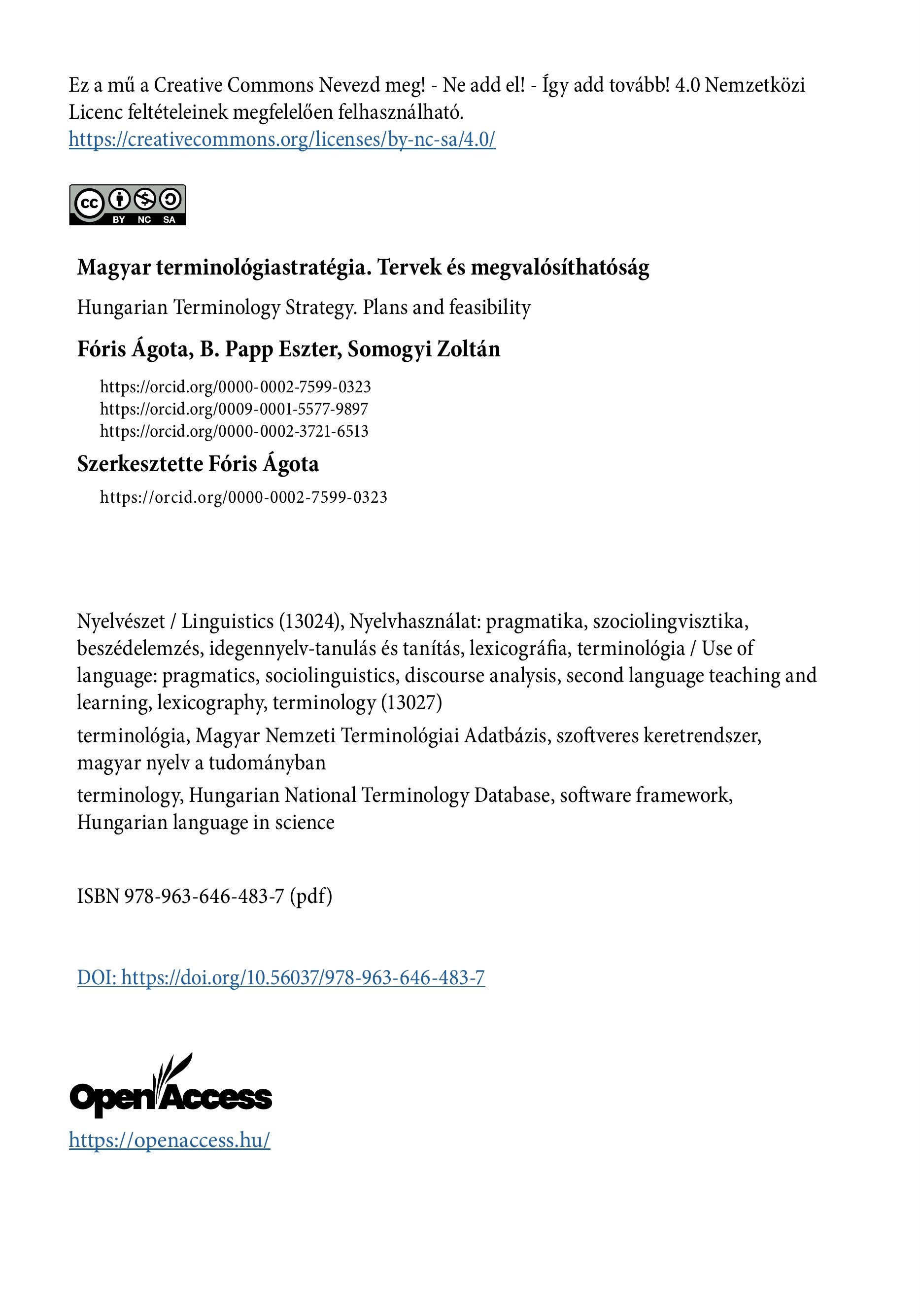 Ez a mű a Creative Commons Nevezd meg! - Ne add el! - Így add tovább! 4.0 Nemzetközi Licenc feltételeinek megfelelően felhasználható. https://creativecommons.org/licenses/by-nc-sa/4.0/ Magyar terminologiastratégia. Tervek és megvalésithatésag Hungarian Terminology Strategy. Plans and feasibility Foris Agota, B. Papp Eszter, Somogyi Zoltan https://orcid.org/0000-0002-7599-0323 https://orcid.org/0009-0001-5577-9897 https://orcid.org/0000-0002-3721-6513 Szerkesztette Föris Ägota https://orcid.org/0000-0002-7599-0323 Nyelvészet / Linguistics (13024), Nyelvhasznälat: pragmatika, szociolingvisztika, beszédelemzés, idegennyelv-tanulas és tanitas, lexicografia, terminoldgia / Use of language: pragmatics, sociolinguistics, discourse analysis, second language teaching and learning, lexicography, terminology (13027) terminológia, Magyar Nemzeti Terminológiai Adatbázis, szoftveres keretrendszer, magyar nyelv a tudományban terminology, Hungarian National Terminology Database, software framework, Hungarian language in science ISBN 978-963-646-483-7 (pdf) DOI: https://doi.org/10.56037/978-963-646-483-7 OpenlAccess https://openaccess.hu/