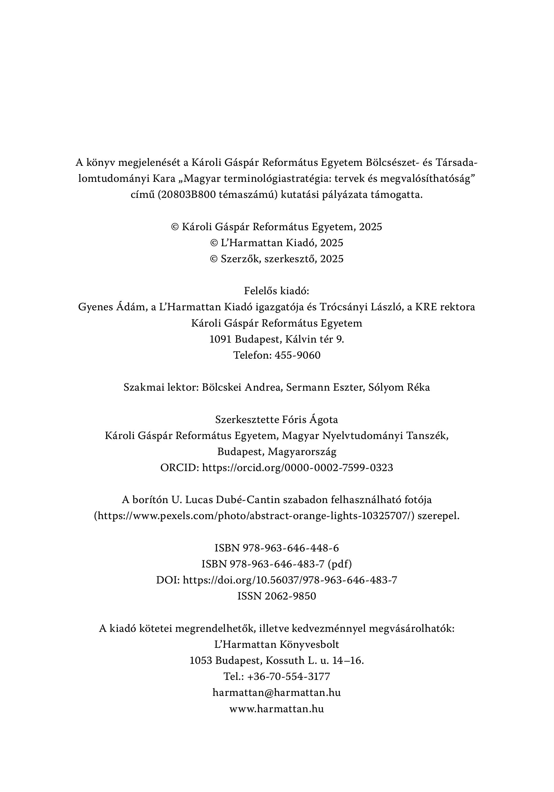 A könyv megjelenését a Károli Gáspár Református Egyetem Bölcsészet- és Társadalomtudományi Kara , Magyar terminológiastratégia: tervek és megvalósíthatóság" című (20803B800 témaszámú,) kutatási pályázata támogatta. 0 Károli Gáspár Református Egyetem, 2025 © L'Harmattan Kiadó, 2025 9 Szerzők, szerkesztő, 2025 Felelős kiadó: Gyenes Ádám, a LHarmattan Kiadó igazgatója és Trócsányi László, a KRE rektora Károli Gáspár Református Egyetem 1091 Budapest, Kálvin tér 9. Telefon: 455-9060 Szakmai lektor: Bölcskei Andrea, Sermann Eszter, Sólyom Réka Szerkesztette Fóris Ágota Károli Gáspár Református Egyetem, Magyar Nyelvtudományi Tanszék, Budapest, Magyarország ORCID: https://orcid.org/0000-0002-7599-0323 A borítón U. Lucas Dubé-Cantin szabadon felhasználható fotója (https://www.pexels.com/photo/abstract-orange-lights-10325707/) szerepel. ISBN 978-963-646-448-6 ISBN 978-963-646-483-7 (pdf) DOI: https://doi.org/10.56037/978-963-646-483-7 ISSN 2062-9850 A kiadó kötetei megrendelhetők, illetve kedvezménnyel megvásárolhatók: LHarmattan Könyvesbolt 1053 Budapest, Kossuth L. u. 14-16. Tel.: +36-70-554-3177 harmattan@harmattan.hu www.harmattan.hu