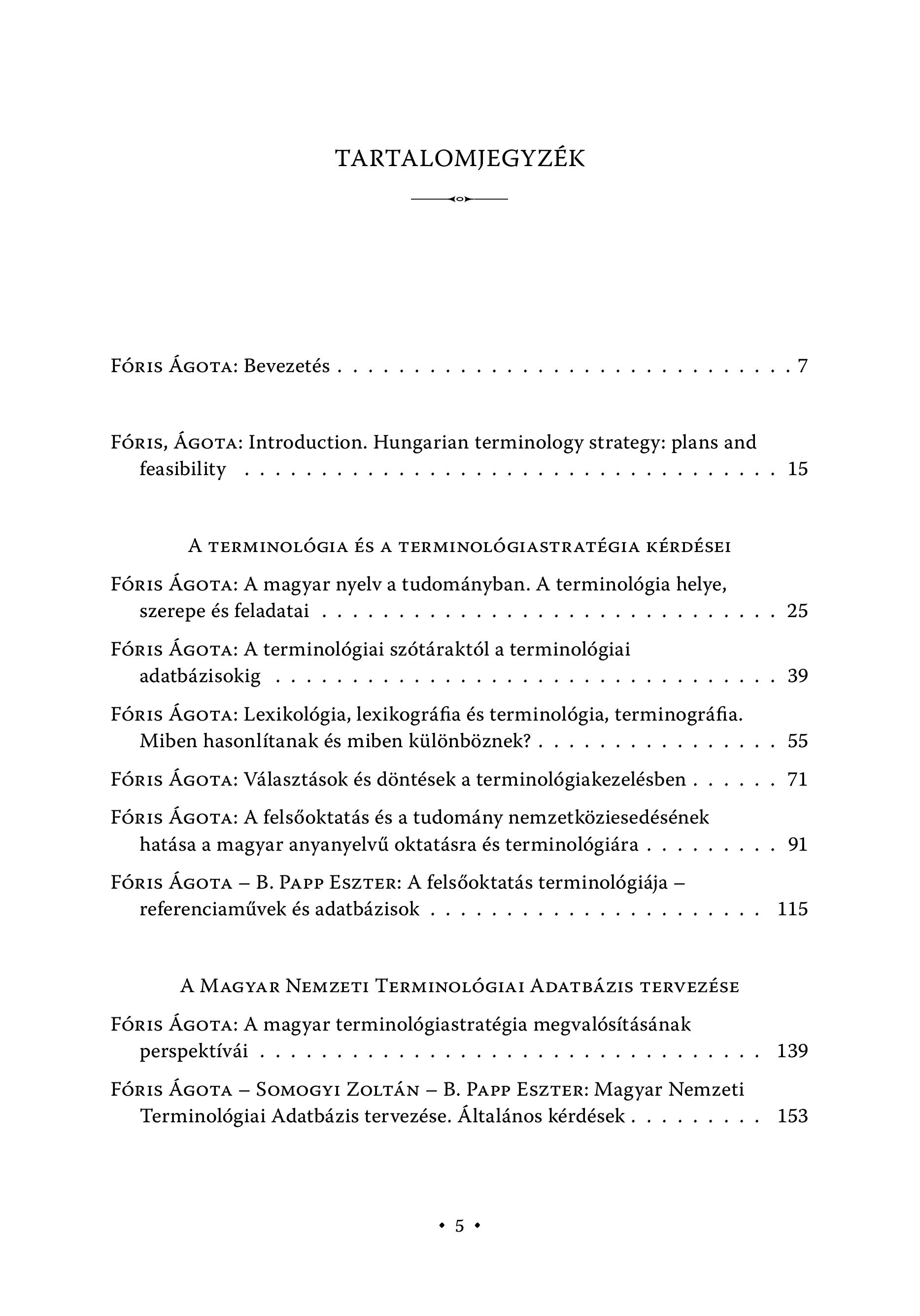 TARTALOMJEGYZÉK me FÓRIS ÁGOTA: Bevezetés . ........................... FÓRIS, ÁGOTA: Introduction. Hungarian terminology strategy: plans and feasibility .................................. A TERMINOLÓGIA ÉS A TERMINOLÓGIASTRATÉGIA KÉRDÉSEI FÓRIS ÁGOTA: A magyar nyelv a tudományban. A terminológia helye, szerepe és feladatai ............................. FÓRIS ÁGOTA: A terminológiai szótáraktól a terminológiai adatbäzisokig ................................ FÓRIS ÁGOTA: Lexikológia, lexikográfia és terminológia, terminográfia. FÓRIS ÁGOTA: Választások és döntések a terminológiakezelésben . . . . . FÓRIS ÁGOTA: A felsőoktatás és a tudomány nemzetköziesedésének hatása a magyar anyanyelvű oktatásra és terminológiára . . . . . . . . FÓRIS ÁGOTA - B. PAPP ESZTER: A felsőoktatás terminológiája — referenciamüvek és adatbäzisok . ..................... A MAGYAR NEMZETI TERMINOLÓGIAI ADATBÁZIS TERVEZÉSE Förıs ÄGoTA: A magyar terminolögiastrategia megvalósításának perspektiväi ................................. FÓRIS ÁGOTA — SOMOGYI ZOLTÁN — B. PAPP ESZTER: Magyar Nemzeti Terminológiai Adatbázis tervezése. Általános kérdések . . . . . . . . .
