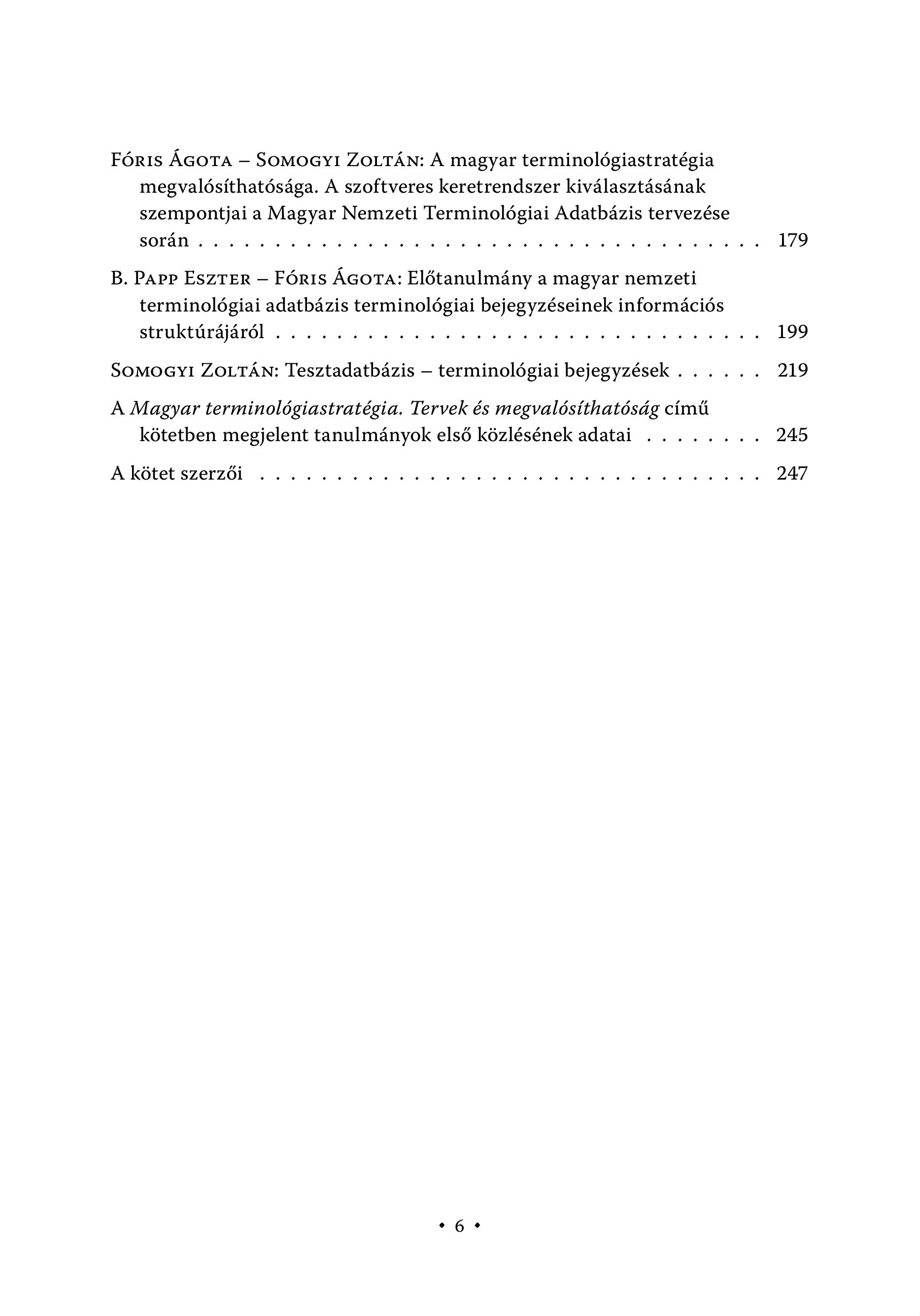 FÓRIS ÁGOTA — SOMOGYI ZOLTÁN: A magyar terminológiastratégia megvalósíthatósága. A szoftveres keretrendszer kiválasztásának szempontjai a Magyar Nemzeti Terminológiai Adatbázis tervezése B. PAPP ESZTER — FÓRIS ÁGOTA: Előtanulmány a magyar nemzeti terminológiai adatbázis terminológiai bejegyzéseinek információs struktüräjäröl ................................ SOMOGYI ZOLTÁN: Tesztadatbázis — terminológiai bejegyzések . . . . . . A Magyar terminológiastratégia. Tervek és megvalósíthatóság című kötetben megjelent tanulmányok első közlésének adatai . . . . . . . . Akôtet szerzôi ........................,.........