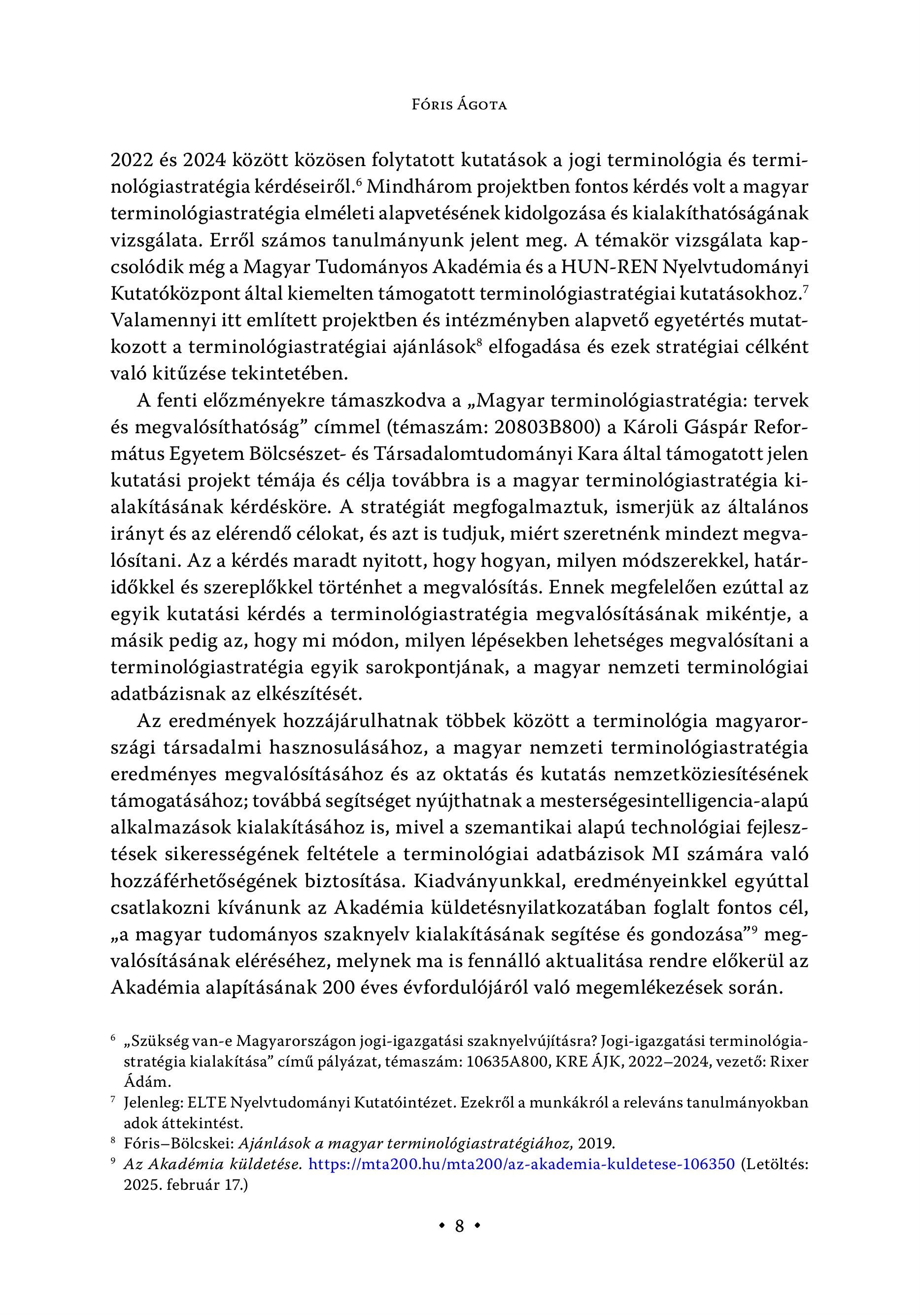FÓRIS ÁGOTA 2022 és 2024 között közösen folytatott kutatások a jogi terminológia és terminológiastratégia kérdéseiről." Mindhárom projektben fontos kérdés volt a magyar terminológiastratégia elméleti alapvetésének kidolgozása és kialakíthatóságának vizsgálata. Erről számos tanulmányunk jelent meg. A témakör vizsgálata kapcsolódik még a Magyar Tudományos Akadémia és a HUN-REN Nyelvtudományi Kutatóközpont által kiemelten támogatott terminológiastratégiai kutatásokhoz." Valamennyi itt említett projektben és intézményben alapvető egyetértés mutatkozott a terminológiastratégiai ajánlások? elfogadása és ezek stratégiai célként való kitűzése tekintetében. A fenti előzményekre támaszkodva a , Magyar terminológiastratégia: tervek és megvalösithatösäg” cimmel (temaszäm: 20803B800) a Käroli Gáspár Reformätus Egyetem Bölcsöszet- es Tarsadalomtudomänyi Kara által támogatott jelen kutatási projekt témája és célja továbbra is a magyar terminolögiastrategia kialakításának kérdésköre. A stratégiát megfogalmaztuk, ismerjük az általános irányt és az elérendő célokat, és azt is tudjuk, miért szeretnénk mindezt megvalósítani. Az a kérdés maradt nyitott, hogy hogyan, milyen módszerekkel, határidőkkel és szereplőkkel történhet a megvalósítás. Ennek megfelelően ezúttal az egyik kutatási kérdés a terminológiastratégia megvalósításának mikéntje, a másik pedig az, hogy mi módon, milyen lépésekben lehetséges megvalósítani a terminológiastratégia egyik sarokpontjának, a magyar nemzeti terminológiai adatbázisnak az elkészítését. Az eredmények hozzájárulhatnak többek között a terminológia magyarországi társadalmi hasznosulásához, a magyar nemzeti terminológiastratégia eredményes megvalósításához és az oktatás és kutatás nemzetköziesítésének támogatásához; továbbá segítséget nyújthatnak a mesterségesintelligencia-alapú alkalmazások kialakításához is, mivel a szemantikai alapú technológiai fejlesztések sikerességének feltétele a terminológiai adatbázisok MI számára való hozzáférhetőségének biztosítása. Kiadványunkkal, eredményeinkkel egyúttal csatlakozni kívánunk az Akadémia küldetésnyilatkozatában foglalt fontos cél, »a magyar tudományos szaknyelv kialakításának segítése és gondozása"? valósításának eléréséhez, melynek ma is fennálló aktualitása rendre előkerül az Akadémia alapításának 200 éves évfordulójáról való megemlékezések során. mega „Szükseg van-e Magyarorszägon jogi-igazgatasi szaknyelvujitasra? Jogi-igazgatasi terminoldgiastratégia kialakítása" című pályázat, témaszám: 10635A800, KRE ÄJK, 2022-2024, vezető: Rixer Ádám. Jelenleg: ELTE Nyelvtudományi Kutatóintézet. Ezekről a munkákról a releváns tanulmányokban adok áttekintést. Föris-Bölcskei: Ajanlasok a magyar terminolögiastrategiahoz, 2019. Az Akadémia kiildetése. https://mta200.hu/mta200/az-akademia-kuldetese-106350 (Letéltés: 2025. február 17.) a 00 o “8e
