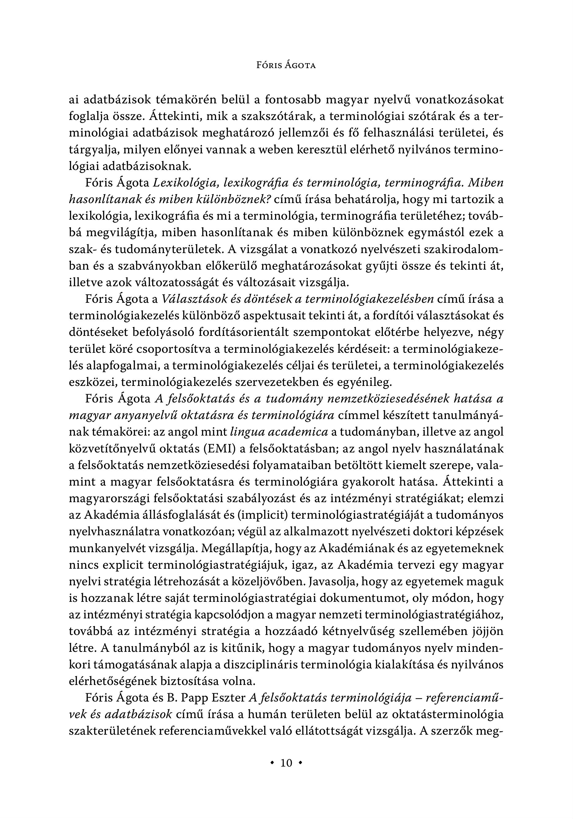 FÓRIS ÁGOTA ai adatbázisok témakörén belül a fontosabb magyar nyelvű vonatkozásokat foglalja össze. Áttekinti, mik a szakszótárak, a terminológiai szótárak és a terminológiai adatbázisok meghatározó jellemzői és fő felhasználási területei, és tárgyalja, milyen előnyei vannak a weben keresztül elérhető nyilvános terminológiai adatbázisoknak. Fóris Ágota Lexikológia, lexikográfia és terminológia, terminográfia. Miben hasonlítanak és miben különböznek? című írása behatárolja, hogy mi tartozik a lexikológia, lexikográfia és mi a terminológia, terminográfia területéhez; továbbá megvilágítja, miben hasonlítanak és miben különböznek egymástól ezek a szak- és tudományterületek. A vizsgálat a vonatkozó nyelvészeti szakirodalomban és a szabványokban előkerülő meghatározásokat gyűjti össze és tekinti át, illetve azok változatosságát és változásait vizsgálja. Fóris Ágota a Választások és döntések a terminológiakezelésben című írása a terminológiakezelés különböző aspektusait tekinti át, a fordítói választásokat és döntéseket befolyásoló fordításorientált szempontokat előtérbe helyezve, négy terület köré csoportosítva a terminológiakezelés kérdéseit: a terminológiakezelés alapfogalmai, a terminológiakezelés céljai és teriiletei, a terminoldgiakezelés eszközei, terminológiakezelés szervezetekben és egyénileg. Fóris Ágota A felsőoktatás és a tudomány nemzetköziesedésének hatása a magyar anyanyelvű oktatásra és terminológiára címmel készített tanulmányának témakGrei: az angol mint lingua academica a tudományban, illetve az angol közvetítőnyelvű oktatás (EMI) a felsőoktatásban; az angol nyelv használatának a felsőoktatás nemzetköziesedési folyamataiban betöltött kiemelt szerepe, valamint a magyar felsőoktatásra és terminológiára gyakorolt hatása. Áttekinti a magyarországi felsőoktatási szabályozást és az intézményi stratégiákat; elemzi az Akadémia állásfoglalását és (implicit) terminológiastratégiáját atudományos nyelvhasználatra vonatkozóan; végül az alkalmazott nyelvészeti doktori képzések munkanyelvét vizsgálja. Megállapítja, hogy az Akadémiának és az egyetemeknek nincs explicit terminológiastratégiájuk, igaz, az Akadémia tervezi egy magyar nyelvi stratégia létrehozását a közeljövőben. Javasolja, hogy az egyetemek maguk is hozzanak létre saját terminológiastratégiai dokumentumot, oly módon, hogy az intézményi stratégia kapcsolódjon a magyar nemzeti terminológiastratégiához, továbbá az intézményi stratégia a hozzáadó kétnyelvűség szellemében jöjjön létre. A tanulmányból az is kitűnik, hogy a magyar tudományos nyelv mindenkori támogatásának alapja a diszciplináris terminológia kialakítása és nyilvános elérhetőségének biztosítása volna. Fóris Ágota és B. Papp Eszter A felsőoktatás terminológiája — referenciaművek és adatbázisok című írása a humán területen belül az oktatásterminológia szakterületének referenciaművekkel való ellátottságát vizsgálja. A szerzők meg+10 +