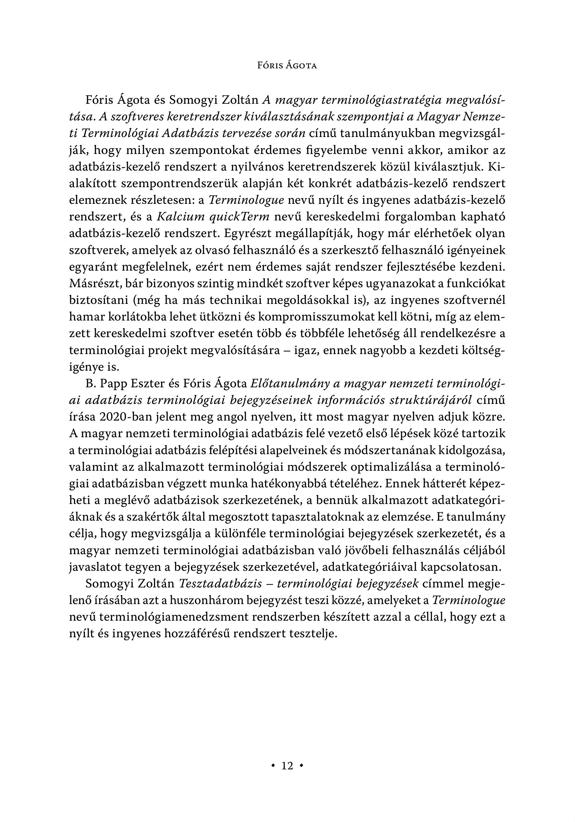 FÓRIS ÁGOTA Fóris Ágota és Somogyi Zoltán A magyar terminológiastratégia megvalósítása. A szoftveres keretrendszer kiválasztásának szempontjai a Magyar Nemzeti Terminológiai Adatbázis tervezése során című tanulmányukban megvizsgálják, hogy milyen szempontokat érdemes figyelembe venni akkor, amikor az adatbázis-kezelő rendszert a nyilvános keretrendszerek közül kiválasztjuk. Kialakított szempontrendszerük alapján két konkrét adatbázis-kezelő rendszert elemeznek részletesen: a Terminologue nevű nyílt és ingyenes adatbázis-kezelő rendszert, és a Kalcium guickTerm nevű kereskedelmi forgalomban kapható adatbázis-kezelő rendszert. Egyrészt megállapítják, hogy már elérhetőek olyan szoftverek, amelyek az olvasó felhasználó és a szerkesztő felhasználó igényeinek egyaránt megfelelnek, ezért nem érdemes saját rendszer fejlesztésébe kezdeni. Másrészt, bár bizonyos szintig mindkét szoftver képes ugyanazokat a funkciókat biztosítani (még ha más technikai megoldásokkal is), az ingyenes szoftvernél hamar korlátokba lehet ütközni és kompromisszumokat kell kötni, míg az elemzett kereskedelmi szoftver esetén több és többféle lehetőség áll rendelkezésre a terminológiai projekt megvalósítására — igaz, ennek nagyobb a kezdeti költségigénye is. B. Papp Eszter és Fóris Ágota Előtanulmány a magyar nemzeti terminológiai adatbázis terminológiai bejegyzéseinek információs struktúrájáról című írása 2020-ban jelent meg angol nyelven, itt most magyar nyelven adjuk közre. A magyar nemzeti terminológiai adatbázis felé vezető első lépések közé tartozik a terminológiai adatbázis felépítési alapelveinek és módszertanának kidolgozása, valamint az alkalmazott terminológiai módszerek optimalizálása a terminológiai adatbázisban végzett munka hatékonyabbá tételéhez. Ennek hátterét képezheti a meglévő adatbázisok szerkezetének, a bennük alkalmazott adatkategóriáknak és a szakértők által megosztott tapasztalatoknak az elemzése. E tanulmány célja, hogy megvizsgálja a különféle terminológiai bejegyzések szerkezetét, és a magyar nemzeti terminológiai adatbázisban való jövőbeli felhasználás céljából javaslatot tegyen a bejegyzések szerkezetével, adatkategóriáival kapcsolatosan. Somogyi Zoltán Tesztadatbázis — terminológiai bejegyzések címmel megjelenő írásában azt a huszonhárom bejegyzést teszi közzé, amelyeket a Terminologue nevű terminológiamenedzsment rendszerben készített azzal a céllal, hogy ezt a nyílt és ingyenes hozzáférésű rendszert tesztelje. s 12 e