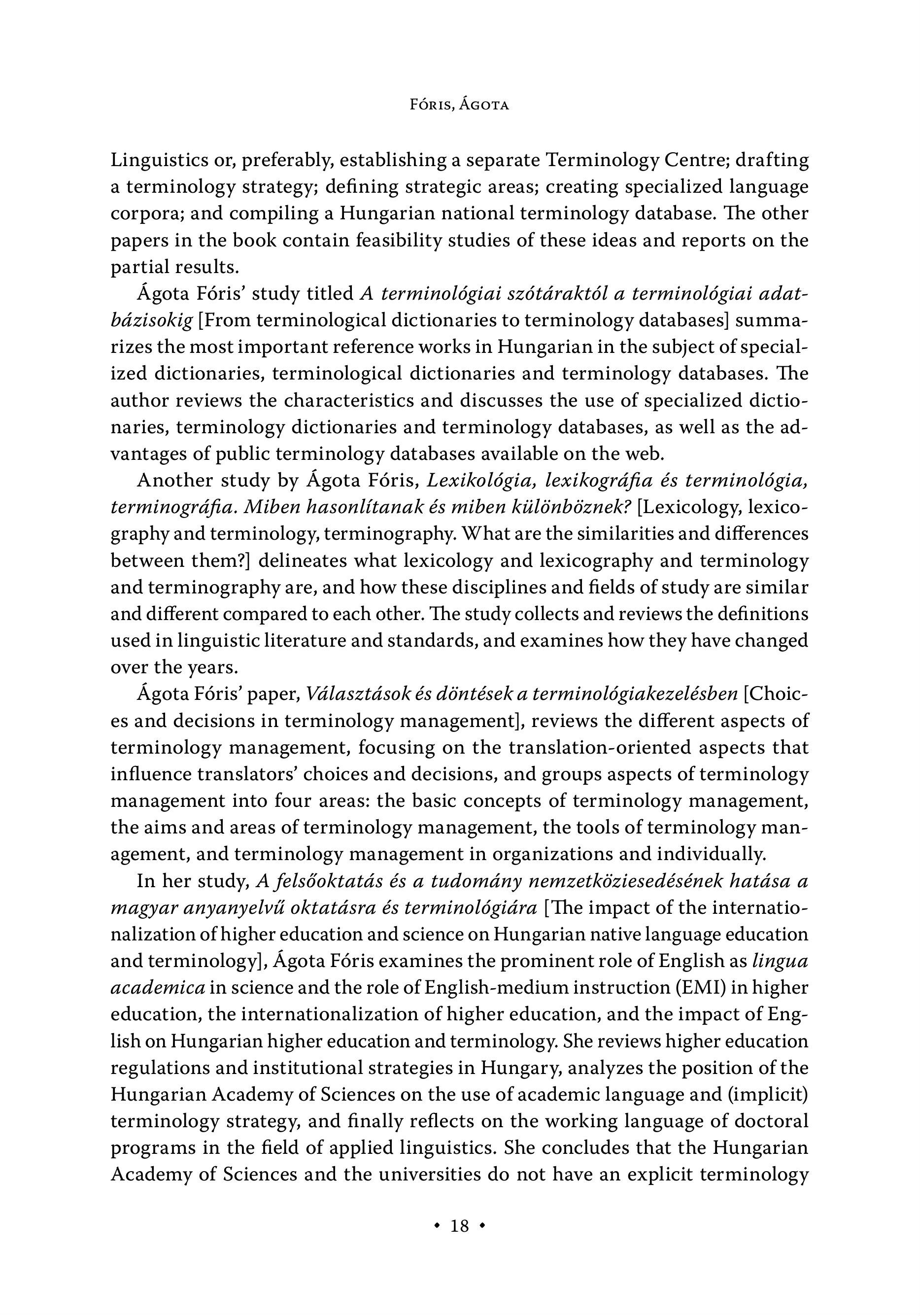 FÓRIS, ÁGOTA Linguistics or, preferably, establishing a separate Terminology Centre; drafting a terminology strategy; defining strategic areas; creating specialized language corpora; and compiling a Hungarian national terminology database. Ihe other papers in the book contain feasibility studies of these ideas and reports on the partial results. Ágota Fóris" study titled A terminológiai szótáraktól a terminológiai adatbázisokig [From terminological dictionaries to terminology databases] summarizes the mostimportant reference works in Hungarian in the subject of specialized dictionaries, terminological dictionaries and terminology databases. The author reviews the characteristics and discusses the use of specialized dictionaries, terminology dictionaries and terminology databases, as well as the advantages of public terminology databases available on the web. Another study by Ágota Fóris, Lexikológia, lexikográfia és terminológia, terminográfia. Miben hasonlítanak és miben különböznek? [Lexicology, lexicography and terminology, terminography. What are the similarities and differences between them?] delineates what lexicology and lexicography and terminology and terminography are, and how these disciplines and fields of study are similar and different compared to each other. The study collects and reviews the definitions used in linguistic literature and standards, and examines how they have changed over the years. Agota Foris’ paper, Választások és döntések a terminológiakezelésben [Choices and decisions in terminology management], reviews the different aspects of terminology management, focusing on the translation-oriented aspects that influence translators’ choices and decisions, and groups aspects of terminology management into four areas: the basic concepts of terminology management, the aims and areas of terminology management, the tools of terminology management, and terminology management in organizations and individually. In her study, A felsőoktatás és a tudomány nemzetköziesedésének hatása a magyar anyanyelvű oktatásra és terminológiára [The impact of the internationalization of higher education and science on Hungarian native language education and terminology], Agota Féris examines the prominent role of English as lingua academica in science and the role of English-medium instruction (EMD in higher education, the internationalization of higher education, and the impact of English on Hungarian higher education and terminology. She reviews higher education regulations and institutional strategies in Hungary, analyzes the position of the Hungarian Academy of Sciences on the use of academic language and (implicit) terminology strategy, and finally reflects on the working language of doctoral programs in the field of applied linguistics. She concludes that the Hungarian Academy of Sciences and the universities do not have an explicit terminology +18 +