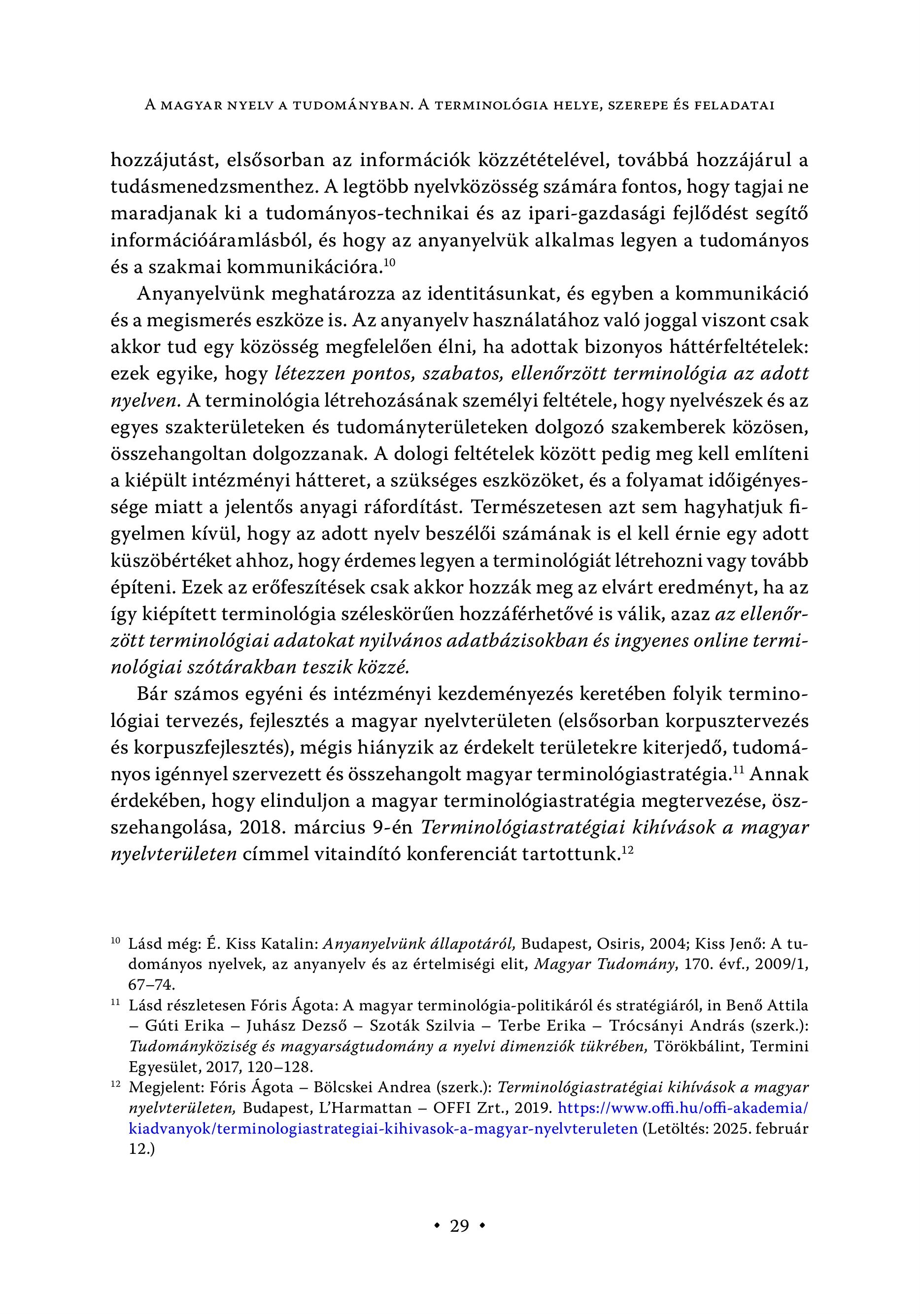 A MAGYAR NYELV A TUDOMÁNYBAN. A TERMINOLÓGIA HELYE, SZEREPE ÉS FELADATAI hozzájutást, elsősorban az információk közzétételével, továbbá hozzájárul a tudásmenedzsmenthez. A legtöbb nyelvközösség számára fontos, hogy tagjai ne maradjanak ki a tudományos-technikai és az ipari-gazdasági fejlődést segítő információáramlásból, és hogy az anyanyelvük alkalmas legyen a tudományos és a szakmai kommunikációra." Anyanyelvünk meghatározza az identitásunkat, és egyben a kommunikáció és a megismerés eszköze is. Az anyanyelv használatához való joggal viszont csak akkor tud egy közösség megfelelően élni, ha adottak bizonyos háttérfeltételek: ezek egyike, hogy létezzen pontos, szabatos, ellenőrzött terminológia az adott nyelven. A terminológia létrehozásának személyi feltétele, hogy nyelvészek és az egyes szakterületeken és tudományterületeken dolgozó szakemberek közösen, összehangoltan dolgozzanak. A dologi feltételek között pedig meg kell említeni a kiépült intézményi hátteret, a szükséges eszközöket, és a folyamat időigényessége miatt a jelentős anyagi ráfordítást. Természetesen azt sem hagyhatjuk figyelmen kívül, hogy az adott nyelv beszélői számának is el kell érnie egy adott küszöbértéket ahhoz, hogy érdemes legyen a terminológiát létrehozni vagy tovább építeni. Ezek az erőfeszítések csak akkor hozzák meg az elvárt eredményt, ha az így kiépített terminológia széleskörűen hozzáférhetővé is válik, azaz az ellenőrzött terminológiai adatokat nyilvános adatbázisokban és ingyenes online terminológiai szótárakban teszik közzé. Bár számos egyéni és intézményi kezdeményezés keretében folyik terminológiai tervezés, fejlesztés a magyar nyelvterületen (elsősorban korpusztervezés és korpuszfejlesztés), mégis hiányzik az érdekelt területekre kiterjedő, tudományos igénnyel szervezett és összehangolt magyar terminológiastratégia."! Annak érdekében, hogy elinduljon a magyar terminológiastratégia megtervezése, öszszehangolása, 2018. március 9-én Terminológiastratégiai kihívások a magyar nyelvterületen címmel vitaindító konferenciát tartottunk. 1 Lásd még: É. Kiss Katalin: Anyanyelvünk állapotáról, Budapest, Osiris, 2004; Kiss Jenő: A tudományos nyelvek, az anyanyelv és az értelmiségi elit, Magyar Tudomány, 170. évf., 2009/1, 67-74. 4 Lasd részletesen Fóris Ágota: A magyar terminológia-politikáról és stratégiáról, in Benő Attila — Güti Erika - Juhász Dezső — Szoták Szilvia — Terbe Erika — Trócsányi András (szerk.): Tudományköziség és magyarságtudomány a nyelvi dimenziók tükrében, Törökbálint, Termini Egyesület, 2017, 120-128. 12 Megjelent: Föris Ägota — Bölcskei Andrea (szerk.): Terminolögiastrategiai kihívások a magyar nyelvterületen, Budapest, L Harmattan — OFFI Zrt., 2019. https://www.offi.hu/offi-akademia/ kiadvanyok/terminologiastrategiai-kihivasok-a-magyar-nyelvteruleten (Letöltes: 2025. februär 12.) «29 «