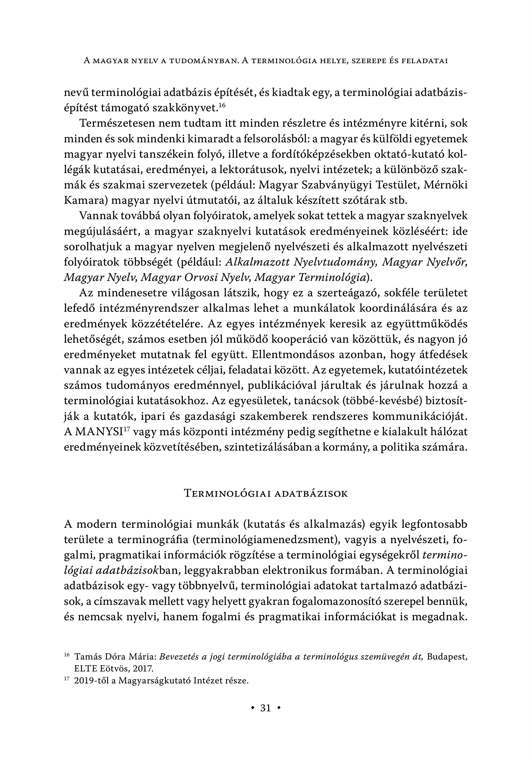 A MAGYAR NYELV A TUDOMÁNYBAN. A TERMINOLÓGIA HELYE, SZEREPE ÉS FELADATAI nevű terminológiai adatbázis építését, és kiadtak egy, a terminológiai adatbázisépítést támogató szakkönyvet." Természetesen nem tudtam itt minden részletre és intézményre kitérni, sok minden és sok mindenki kimaradt a felsorolásból: a magyar és külföldi egyetemek magyar nyelvi tanszékein folyó, illetve a fordítóképzésekben oktató-kutató kollégák kutatásai, eredményei, a lektorátusok, nyelvi intézetek; a különböző szakmák és szakmai szervezetek (például: Magyar Szabványügyi Testület, Mérnöki Kamara) magyar nyelvi útmutatói, az általuk készített szótárak stb. Vannak továbbá olyan folyóiratok, amelyek sokat tettek a magyar szaknyelvek megújulásáért, a magyar szaknyelvi kutatások eredményeinek közléséért: ide sorolhatjuk a magyar nyelven megjelenő nyelvészeti és alkalmazott nyelvészeti folyóiratok többségét (például: Alkalmazott Nyelvtudomány, Magyar Nyelvőr, Magyar Nyelv, Magyar Orvosi Nyelv, Magyar Terminológia). Az mindenesetre világosan látszik, hogy ez a szerteágazó, sokféle területet lefedő intézményrendszer alkalmas lehet a munkálatok koordinálására és az eredmények közzétételére. Az egyes intézmények keresik az együttműködés lehetőségét, számos esetben jól működő kooperáció van közöttük, és nagyon jó eredményeket mutatnak fel együtt. Ellentmondásos azonban, hogy átfedések vannak az egyes intézetek céljai, feladatai között. Az egyetemek, kutatóintézetek számos tudományos eredménnyel, publikációval járultak és járulnak hozzá a terminológiai kutatásokhoz. Az egyesületek, tanácsok (többé-kevésbé) biztosítják a kutatók, ipari és gazdasági szakemberek rendszeres kommunikációját. A MANYSI" vagy más központi intézmény pedig segíthetne e kialakult hálózat eredményeinek közvetítésében, szintetizálásában a kormány, a politika számára. TERMINOLÓGIAI ADATBÁZISOK A modern terminológiai munkák (kutatás és alkalmazás) egyik legfontosabb területe a terminográfia (terminológiamenedzsment), vagyis a nyelvészeti, fogalmi, pragmatikai információk rögzítése a terminológiai egységekről terminológiai adatbázisokban, leggyakrabban elektronikus formában. A terminológiai adatbázisok egy- vagy többnyelvű, terminológiai adatokat tartalmazó adatbázisok, a címszavak mellett vagy helyett gyakran fogalomazonosító szerepel bennük, és nemcsak nyelvi, hanem fogalmi és pragmatikai információkat is megadnak. 16 Tamás Dóra Mária: Bevezetés a jogi terminológiába a terminológus szemüvegén át, Budapest, ELTE Eötvös, 2017. 7 2019-t61 a Magyarsägkutaté Intézet része. + 31°
