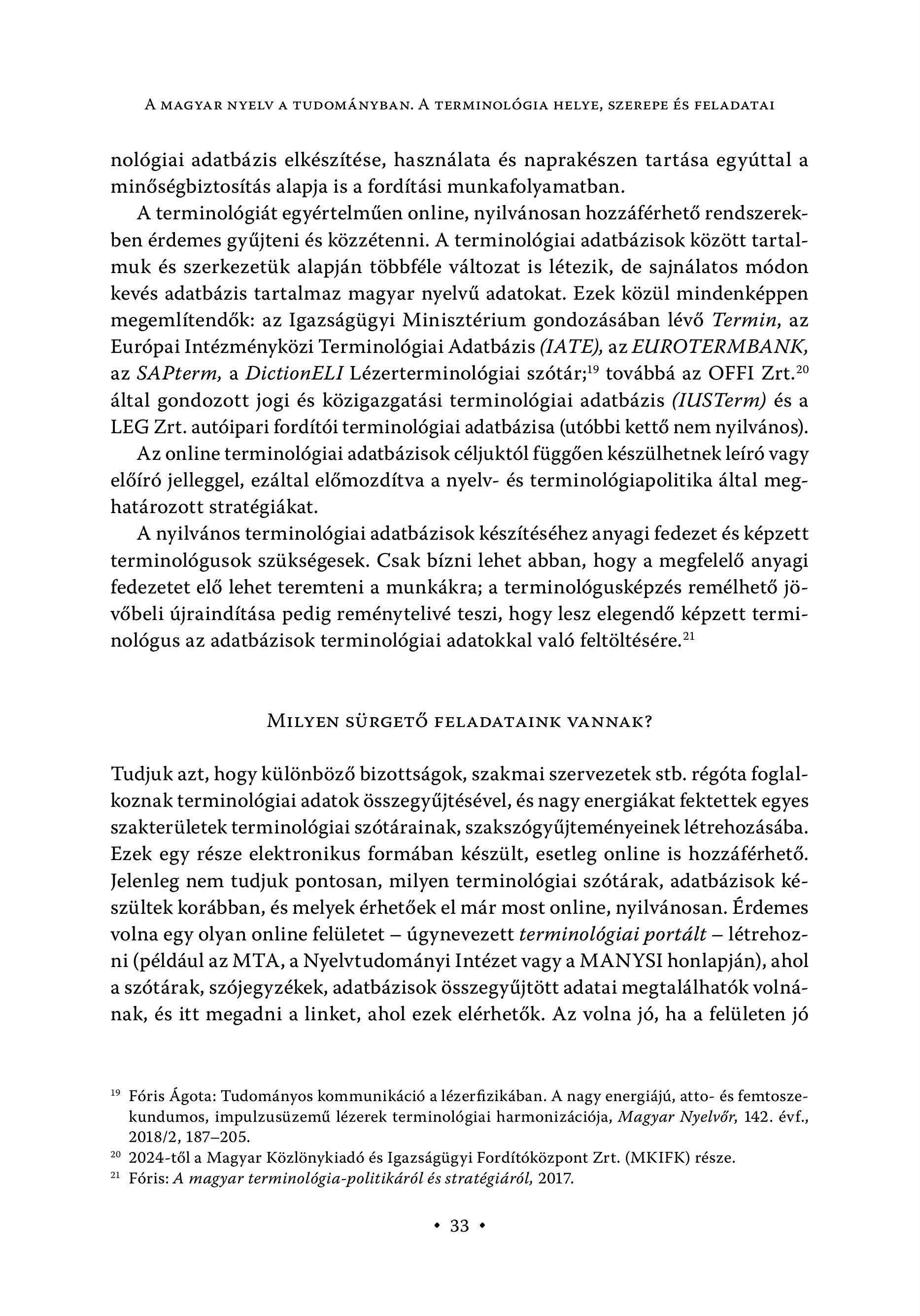 A MAGYAR NYELV A TUDOMÁNYBAN. A TERMINOLÓGIA HELYE, SZEREPE ÉS FELADATAI nológiai adatbázis elkészítése, használata és naprakészen tartása egyúttal a minőségbiztosítás alapja is a fordítási munkafolyamatban. A terminológiát egyértelműen online, nyilvánosan hozzáférhető rendszerekben érdemes gyűjteni és közzétenni. A terminológiai adatbázisok között tartalmuk és szerkezetük alapján többféle változat is létezik, de sajnálatos módon kevés adatbázis tartalmaz magyar nyelvű adatokat. Ezek közül mindenképpen megemlítendők: az Igazságügyi Minisztérium gondozásában lévő Termin, az Európai Intézményközi Terminológiai Adatbázis (IATE), az EUROTERMBANK, az SAPterm, a DictionELI Lezerterminolögiai szötär;!? toväbba az OFFI Zrt.?° által gondozott jogi és közigazgatási terminológiai adatbázis (IUSTerm) és a LEG Zrt. autóipari fordítói terminológiai adatbázisa (utóbbi kettő nem nyilvános). Az online terminológiai adatbázisok céljuktól függően készülhetnek leíró vagy előíró jelleggel, ezáltal előmozdítva a nyelv- és terminológiapolitika által meghatározott stratégiákat. A nyilvános terminológiai adatbázisok készítéséhez anyagi fedezet és képzett terminológusok szükségesek. Csak bízni lehet abban, hogy a megfelelő anyagi fedezetet elő lehet teremteni a munkákra; a terminológusképzés remélhető jövőbeli újraindítása pedig reménytelivé teszi, hogy lesz elegendő képzett terminológus az adatbázisok terminológiai adatokkal való feltöltésére.? MILYEN SÜRGETŐ FELADATAINK VANNAK? Tudjuk azt, hogy különböző bizottságok, szakmai szervezetek stb. régóta foglalkoznak terminológiai adatok összegyűjtésével, és nagy energiákat fektettek egyes szakterületek terminológiai szótárainak, szakszógyűjteményeinek létrehozásába. Ezek egy része elektronikus formában készült, esetleg online is hozzáférhető. Jelenleg nem tudjuk pontosan, milyen terminológiai szótárak, adatbázisok készültek korábban, és melyek érhetőek el már most online, nyilvánosan. Érdemes volna egy olyan online felületet — úgynevezett terminológiai portált — létrehozni (például az MTA, a Nyelvtudományi Intézet vagy a MANYSI honlapján), ahol a szótárak, szójegyzékek, adatbázisok összegyűjtött adatai megtalálhatók volnának, és itt megadni a linket, ahol ezek elérhetők. Az volna jó, ha a felületen jó 19 Fóris Ágota: Tudományos kommunikáció a lézerfizikában. A nagy energiájú, atto- és femtoszekundumos, impulzusüzemű lézerek terminológiai harmonizációja, Magyar Nyelvőr, 142. évf., 2018/2, 187-205. 29 2024-től a Magyar Közlönykiadó és Igazságügyi Fordítóközpont Zrt. (MKIEK) része. 2 Fóris: A magyar terminológia-politikáról és stratégiáról, 2017. 933 e