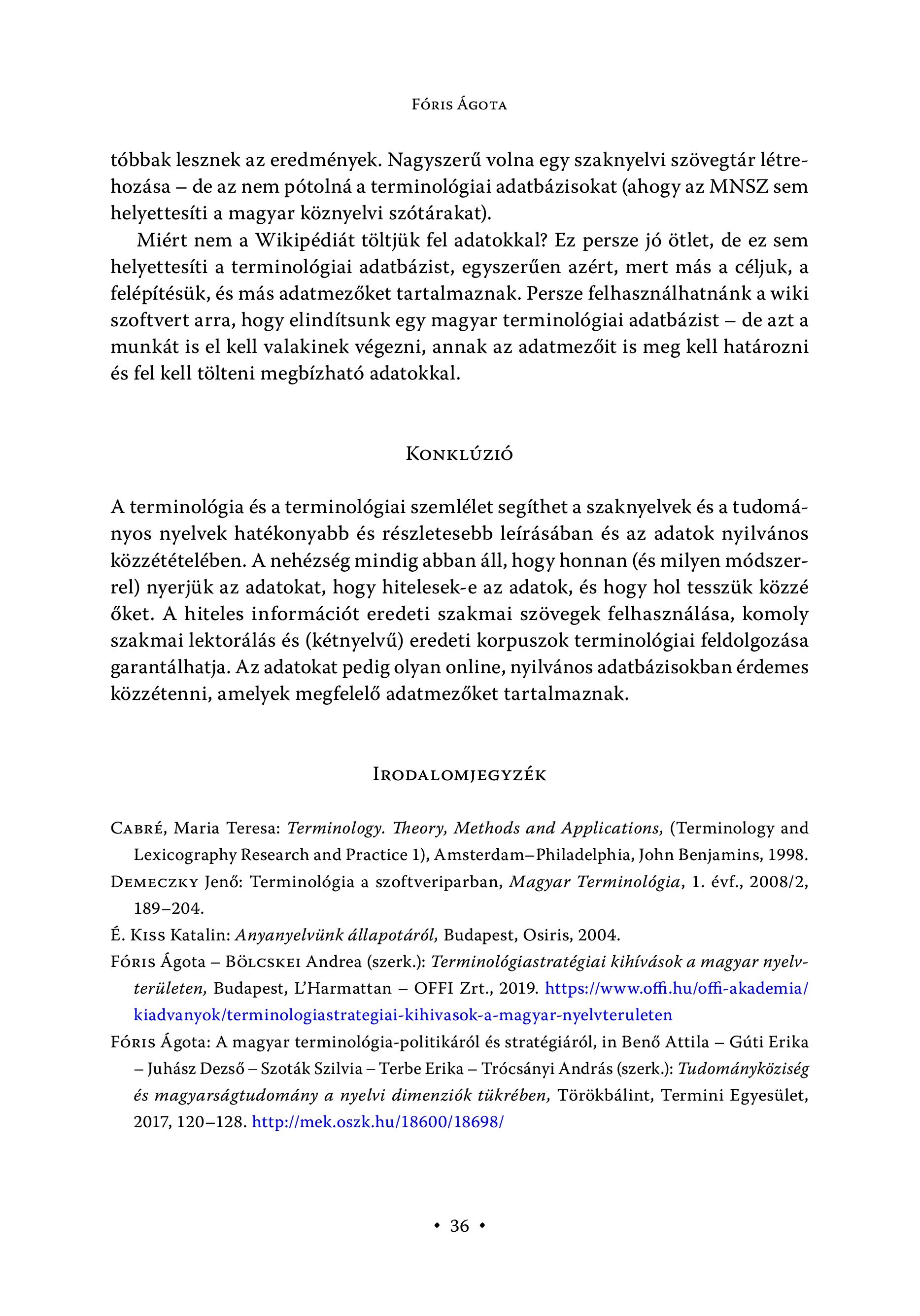 FÓRIS ÁGOTA tóbbak lesznek az eredmények. Nagyszerű volna egy szaknyelvi szövegtár létrehozása — de az nem pótolná a terminológiai adatbázisokat (ahogy az MNSZ sem helyettesíti a magyar köznyelvi szótárakat). Miért nem a Wikipédiát töltjük fel adatokkal? Ez persze jó ötlet, de ez sem helyettesíti a terminológiai adatbázist, egyszerűen azért, mert más a céljuk, a felépítésük, és más adatmezőket tartalmaznak. Persze felhasználhatnánk a wiki szoftvert arra, hogy elindítsunk egy magyar terminológiai adatbázist — de azt a munkát is el kell valakinek végezni, annak az adatmezőit is meg kell határozni és fel kell tölteni megbízható adatokkal. KONKLÚZIÓ A terminológia és a terminológiai szemlélet segíthet a szaknyelvek és a tudományos nyelvek hatékonyabb és részletesebb leírásában és az adatok nyilvános közzétételében. A nehézség mindig abban áll, hogy honnan (és milyen módszerrel) nyerjük az adatokat, hogy hitelesek-e az adatok, és hogy hol tesszük közzé őket. A hiteles információt eredeti szakmai szövegek felhasználása, komoly szakmai lektorálás és (kétnyelvű) eredeti korpuszok terminológiai feldolgozása garantálhatja. Az adatokat pedig olyan online, nyilvános adatbázisokban érdemes közzétenni, amelyek megfelelő adatmezőket tartalmaznak. IRODALOMJEGYZÉK CABRÉ, Maria Teresa: Terminology. Iheory, Methods and Applications, (Terminology and Lexicography Research and Practice 1), Amsterdam-Philadelphia, John Benjamins, 1998. DEMECZKY Jenö: Terminolögia a szoftveriparban, Magyar Terminolégia, 1. évf., 2008/2, 189-204. É. Kiss Katalin: Anyanyelvünk allapotäröl, Budapest, Osiris, 2004. Förıs Ägota - BöLCSKEI Andrea (szerk.): Terminolögiastrategiai kihivasok a magyar nyelvterületen, Budapest, LHarmattan — OFFI Zrt., 2019. https://www.offi.hu/offi-akademia/ kiadvanyok/terminologiastrategiai-kihivasok-a-magyar-nyelvteruleten Förıs Ägota: A magyar terminológia-politikáról és stratégiáról, in Benő Attila — Gúti Erika — Juhász Dezső -— Szoták Szilvia — Terbe Erika — Trócsányi András (szerk.): Tudomanyköziseg és magyarságtudomány a nyelvi dimenziók tükrében, Törökbálint, Termini Egyesület, 2017, 120-128. http://mek.oszk.hu/18600/18698/ +36 »