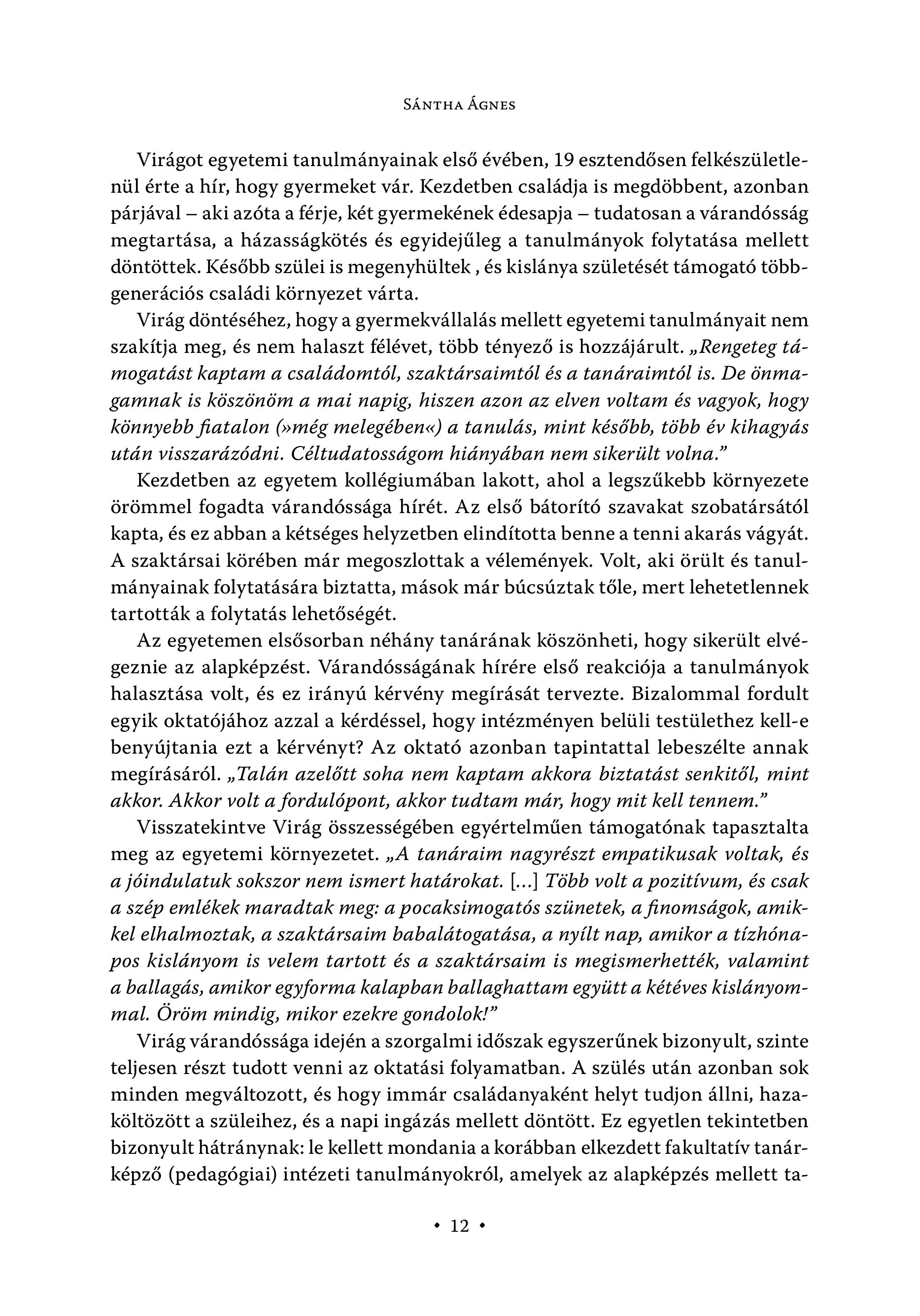 SÁNTHA ÁGNES Virágot egyetemi tanulmányainak első évében, 19 esztendősen felkészületlenül érte a hír, hogy gyermeket vár. Kezdetben családja is megdöbbent, azonban párjával — aki azóta a férje, két gyermekének édesapja — tudatosan a várandósság megtartása, a házasságkötés és egyidejűleg a tanulmányok folytatása mellett döntöttek. Később szülei is megenyhültek , és kislánya születését támogató többgenerációs családi környezet várta. Virág döntéséhez, hogy a gyermekvállalás mellett egyetemi tanulmányait nem szakítja meg, és nem halaszt félévet, több tényező is hozzájárult. ,, Rengeteg támogatást kaptam a családomtól, szaktársaimtól és a tanáraimtól is. De önmagamnak is köszönöm a mai napig, hiszen azon az elven voltam és vagyok, hogy könnyebb fiatalon (»még melegében«) a tanulds, mint késébb, több év kihagyás utan visszardzödni. Céltudatossdgom hiányában nem sikerült volna." Kezdetben az egyetem kollégiumában lakott, ahol a legszűkebb környezete örömmel fogadta várandóssága hírét. Az első bátorító szavakat szobatársától kapta, és ez abban a kétséges helyzetben elindította benne a tenni akarás vágyát. A szaktársai körében már megoszlottak a vélemények. Volt, aki örült és tanulmányainak folytatására biztatta, mások már búcsúztak tőle, mert lehetetlennek tartották a folytatás lehetőségét. Az egyetemen elsősorban néhány tanárának köszönheti, hogy sikerült elvégeznie az alapképzést. Várandósságának hírére első reakciója a tanulmányok halasztása volt, és ez irányú kérvény megírását tervezte. Bizalommal fordult egyik oktatójához azzal a kérdéssel, hogy intézményen belüli testülethez kell-e benyújtania ezt a kérvényt? Az oktató azonban tapintattal lebeszélte annak megírásáról. , Talán azelőtt soha nem kaptam akkora biztatást senkitől, mint akkor. Akkor volt a fordulópont, akkor tudtam már, hogy mit kell tennem." Visszatekintve Virág összességében egyértelműen támogatónak tapasztalta meg az egyetemi környezetet. , A tanáraim nagyrészt empatikusak voltak, és a jóindulatuk sokszor nem ismert határokat. [...1 Több volt a pozitívum, és csak a szép emlékek maradtak meg: a pocaksimogatós szünetek, a finomságok, amikkel elhalmoztak, a szaktársaim babalátogatása, a nyílt nap, amikor a tízhónabpos kislányom is velem tartott és a szaktársaim is megismerhették, valamint a ballagás, amikor egyforma kalapban ballaghattam együtt a kétéves kislányommal. Öröm mindig, mikor ezekre gondolok!" Virág várandóssága idején a szorgalmi időszak egyszerűnek bizonyult, szinte teljesen részt tudott venni az oktatási folyamatban. A szülés után azonban sok minden megváltozott, és hogy immár családanyaként helyt tudjon állni, hazaköltözött a szüleihez, és a napi ingázás mellett döntött. Ez egyetlen tekintetben bizonyult hátránynak: le kellett mondania a korábban elkezdett fakultatív tanárképző (pedagógiai) intézeti tanulmányokról, amelyek az alapképzés mellett tas 12 e